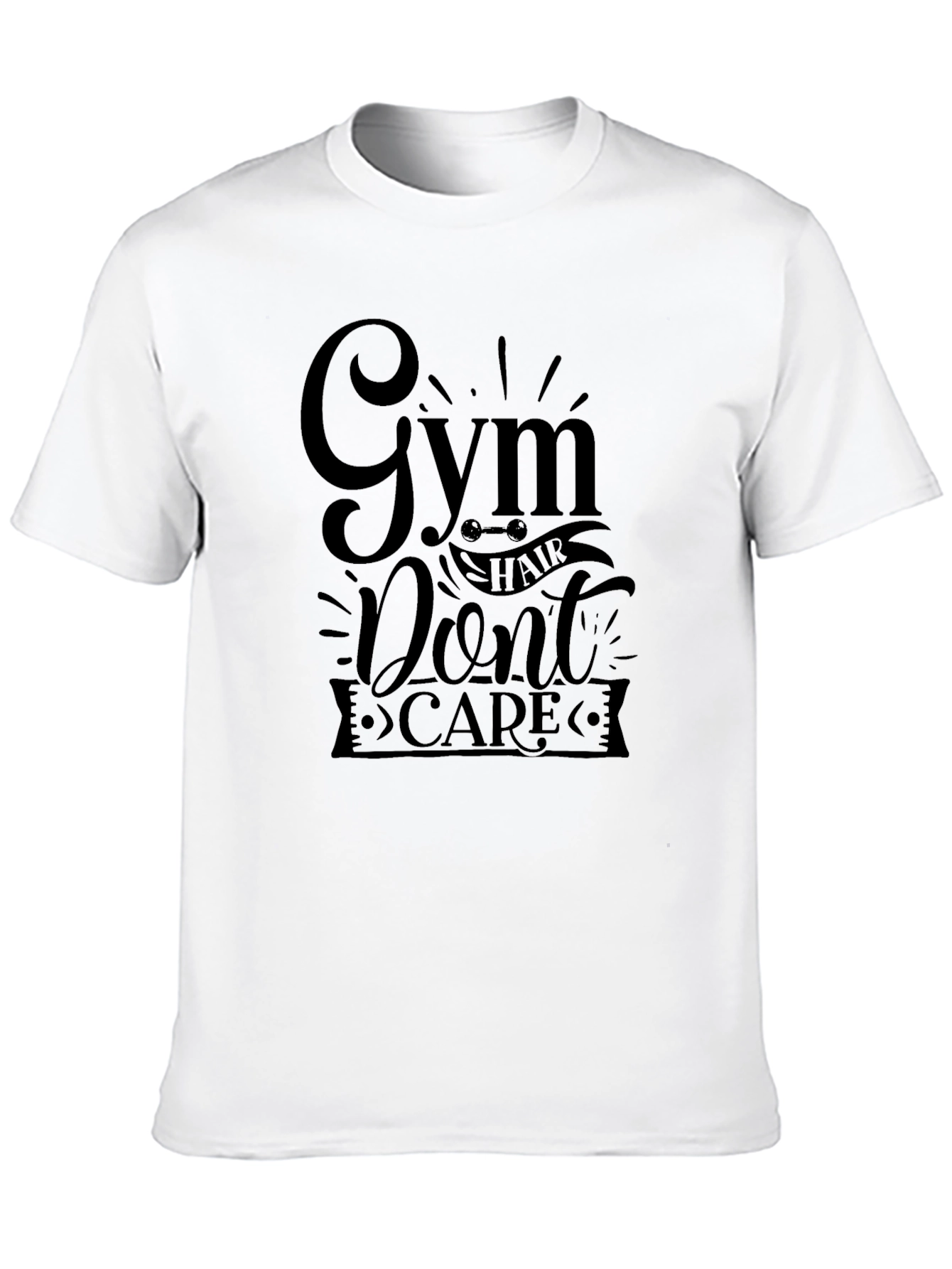 Show off your dedication to fitness with this stylish black t-shirt. The shirt features a bold graphic print that reads "Gym Hair Don't Care," perfect for anyone who prioritizes their workout over their hairstyle. This tee is made from a soft, comfortable fabric, ensuring a great fit whether you're hitting the gym or relaxing post-workout. It's a statement piece that's sure to get a laugh and show off your passion for fitness. Ideal for casual wear, gym sessions, or as a fun gift for your favorite gym buddy.