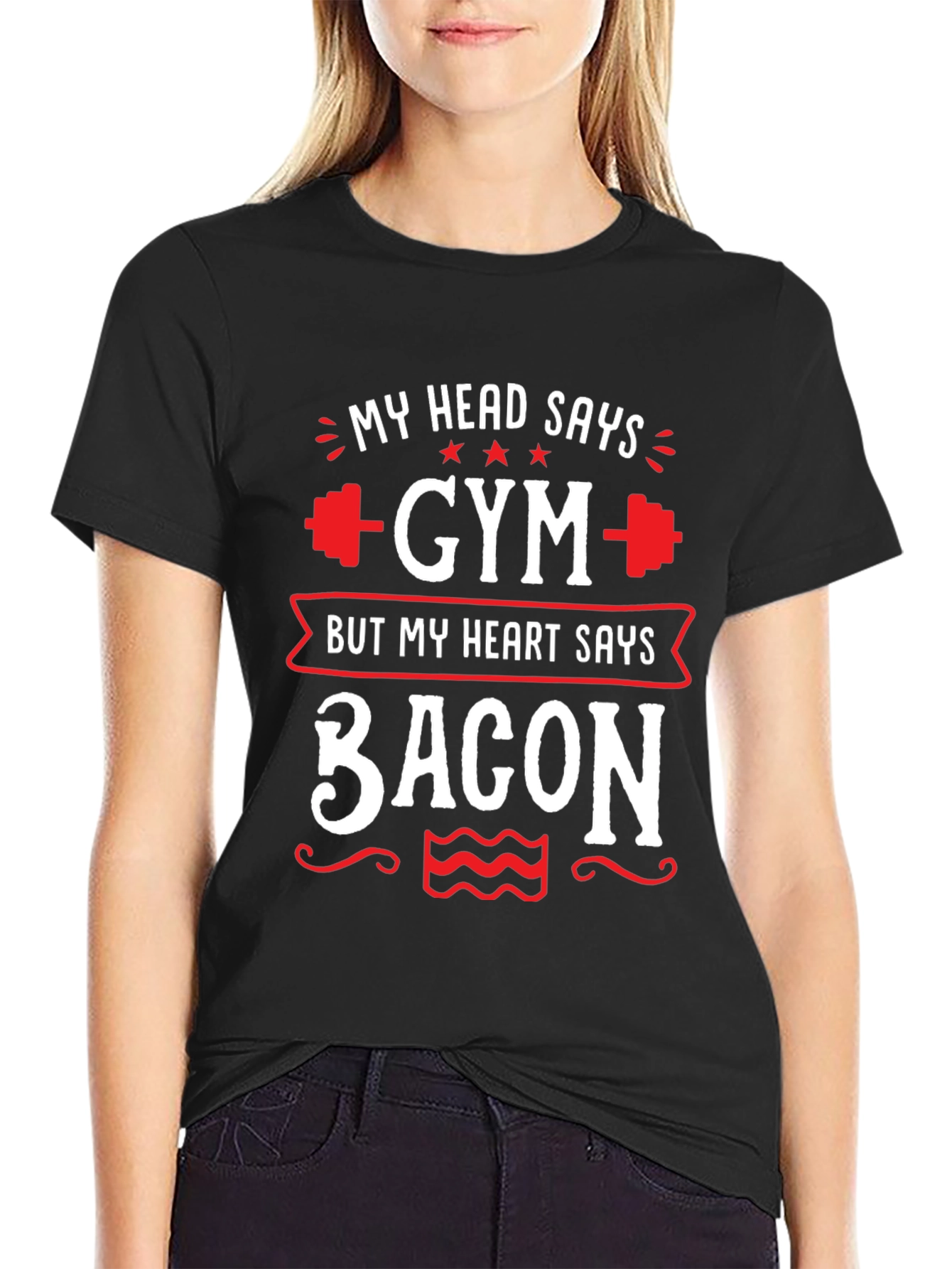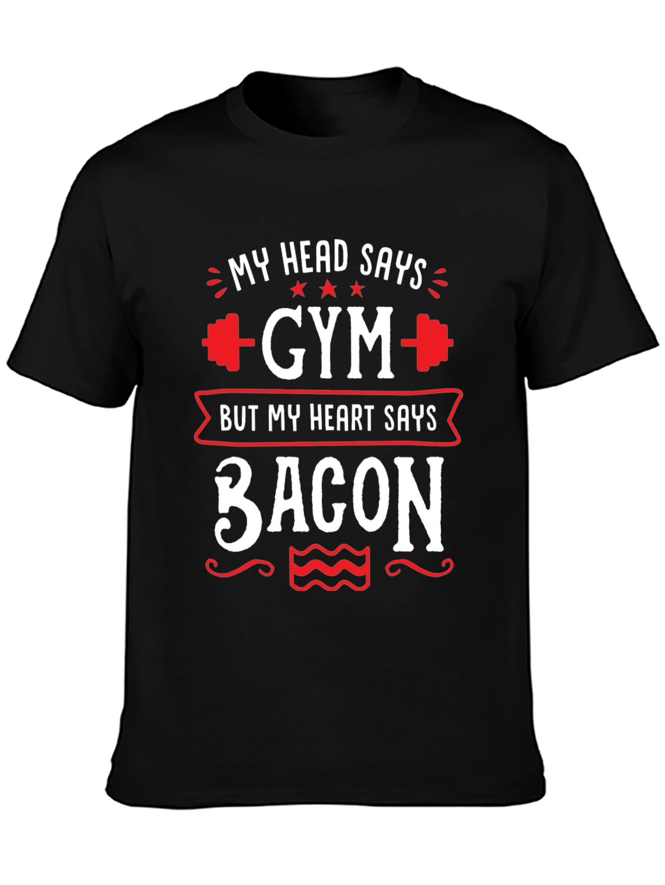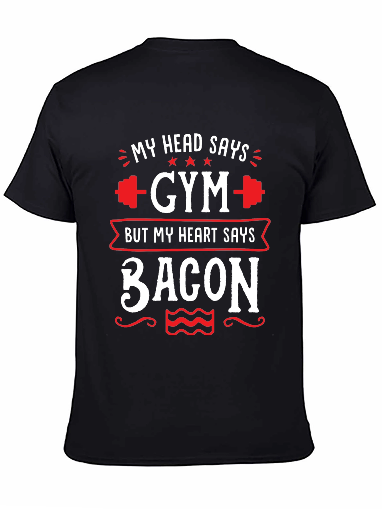 Show off your playful side with this "My Head Says Gym But My Heart Says Bacon" t-shirt. The black tee features a humorous design in white and red, perfect for fitness enthusiasts with a love for bacon. Made from a comfortable material, this shirt is great for casual wear, gym sessions, or a fun weekend outing. The design includes dumbbell graphics, stars, and decorative swirls, adding a stylish touch to the witty slogan. It's an ideal gift for those who appreciate a good workout and a delicious treat.