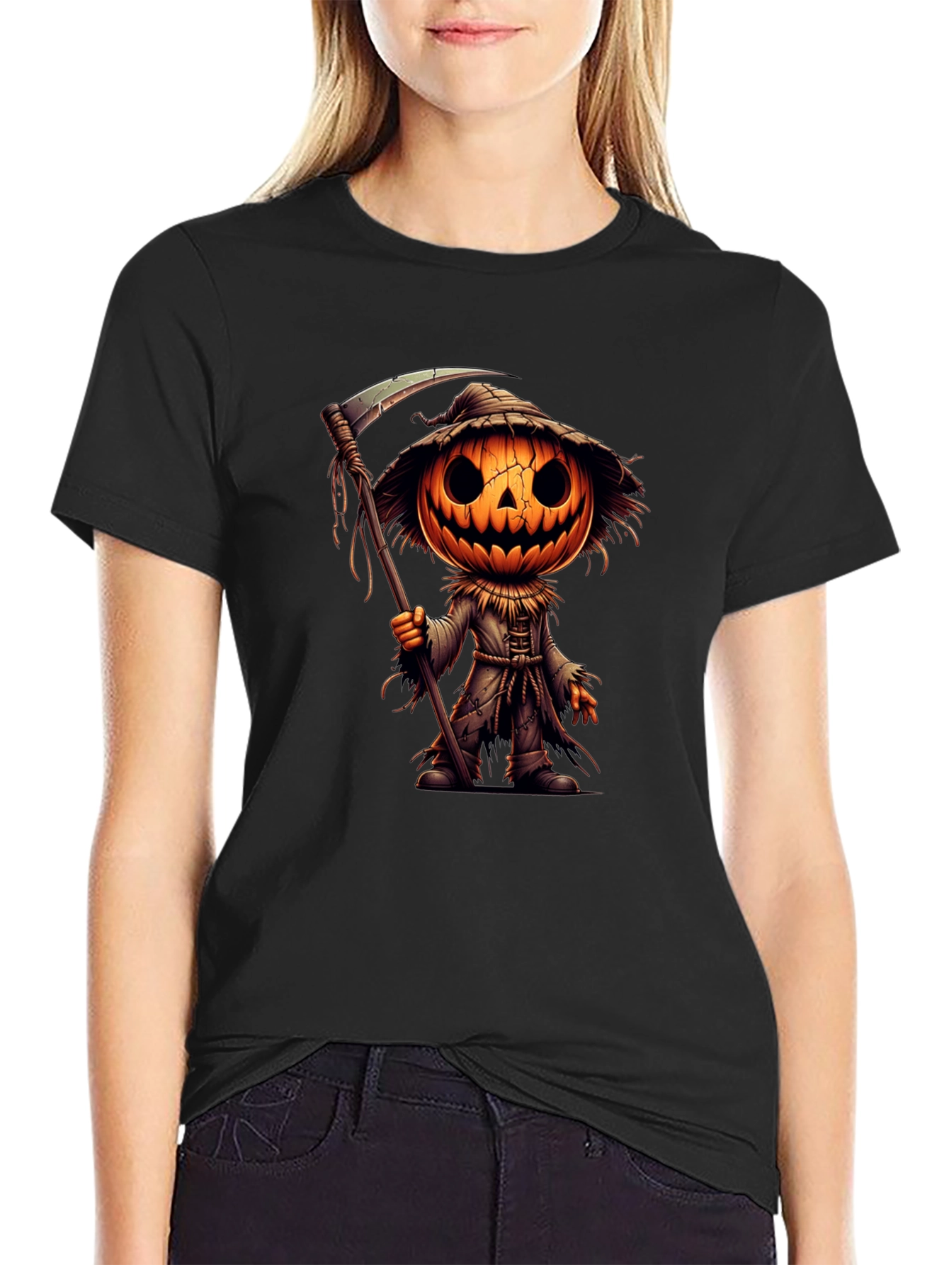 Embrace spooky season with this unique graphic tee! Featuring a captivating design of a cartoonish pumpkin scarecrow holding a scythe, this black t-shirt is sure to turn heads. The detailed graphic showcases a jack-o'-lantern head with a hauntingly cute expression, complete with a straw hat and tattered clothing. Perfect for Halloween parties, casual wear, or expressing your love for all things spooky. Made from comfortable fabric, this tee combines style and comfort for a standout addition to your wardrobe. Get yours now and add a touch of Halloween spirit to your everyday look!