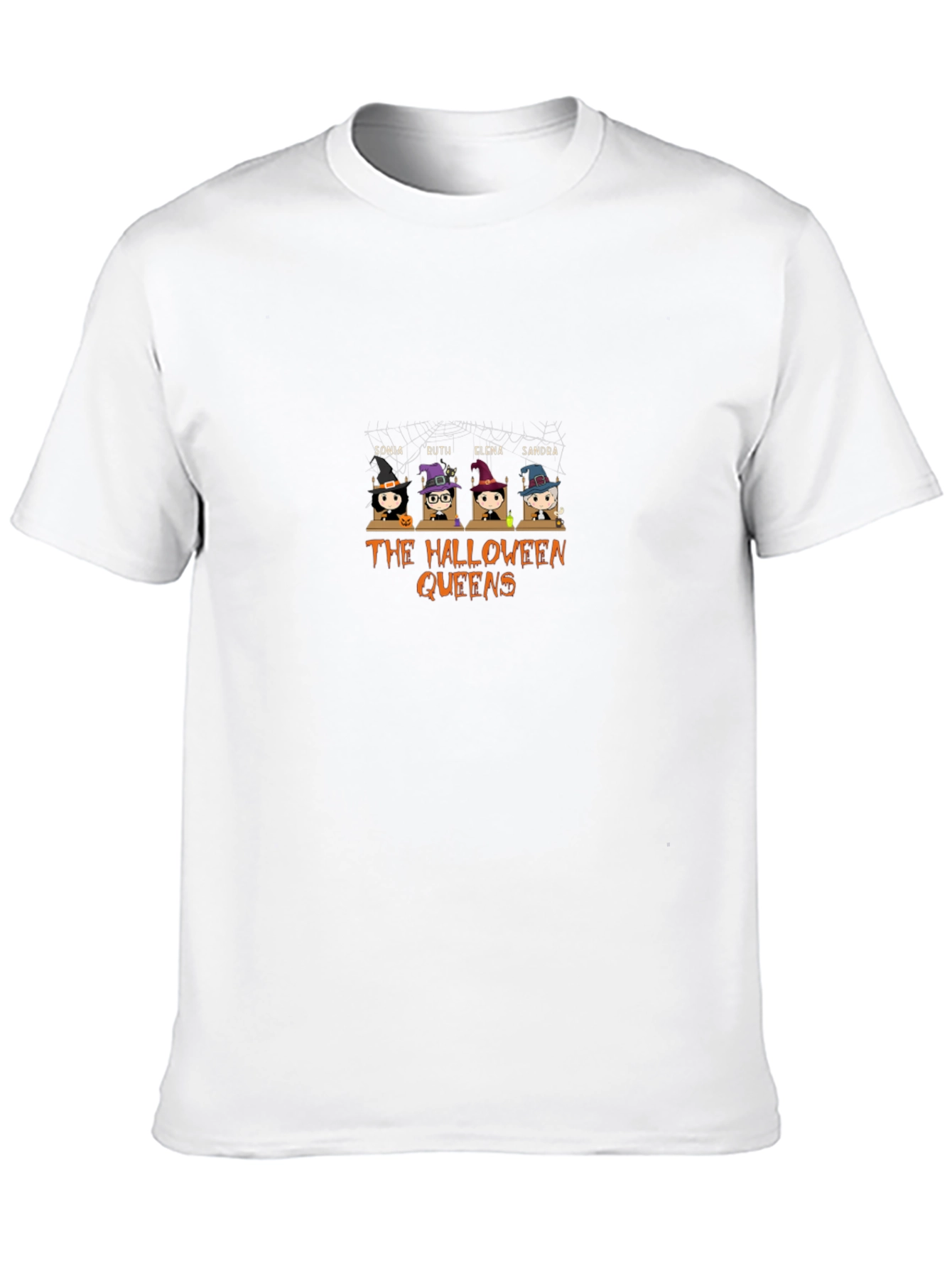 Celebrate the spooky season with this fun black t-shirt! Featuring a creative graphic of four charming witches, labeled Sonia, Ruth, Elena, and Sandra, under the phrase "The Halloween Queens," this tee is a delightful way to showcase your Halloween spirit. The vibrant orange text pops against the dark fabric, making it an eye-catching piece. Made from a comfortable-looking material, this t-shirt is perfect for casual wear during Halloween parties, trick-or-treating adventures, or simply adding a festive touch to your everyday outfit. Get ready to rule the Halloween scene in style!