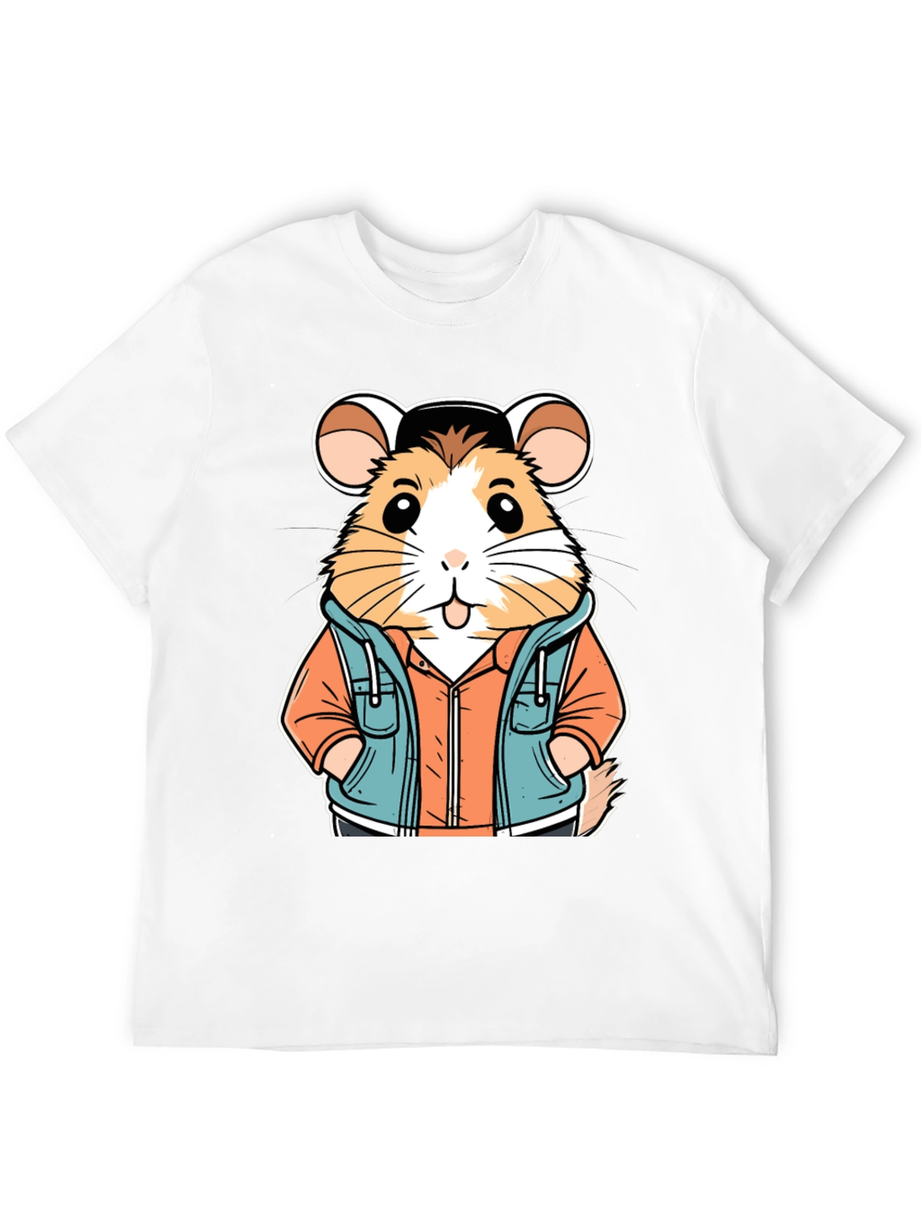 Show off your unique style with this black t-shirt featuring a cool cartoon hamster design! This eye-catching tee showcases an adorable hamster character wearing a stylish blue hoodie and orange shirt. The detailed illustration and vibrant colors make this shirt a standout piece. Made from comfortable materials, this t-shirt is perfect for everyday wear. Whether you're hanging out with friends, running errands, or just lounging at home, this tee will keep you looking and feeling great. It's also a fun gift idea for animal lovers and cartoon enthusiasts! Stand out from the crowd and express your personality with this fun and fashionable hamster t-shirt.