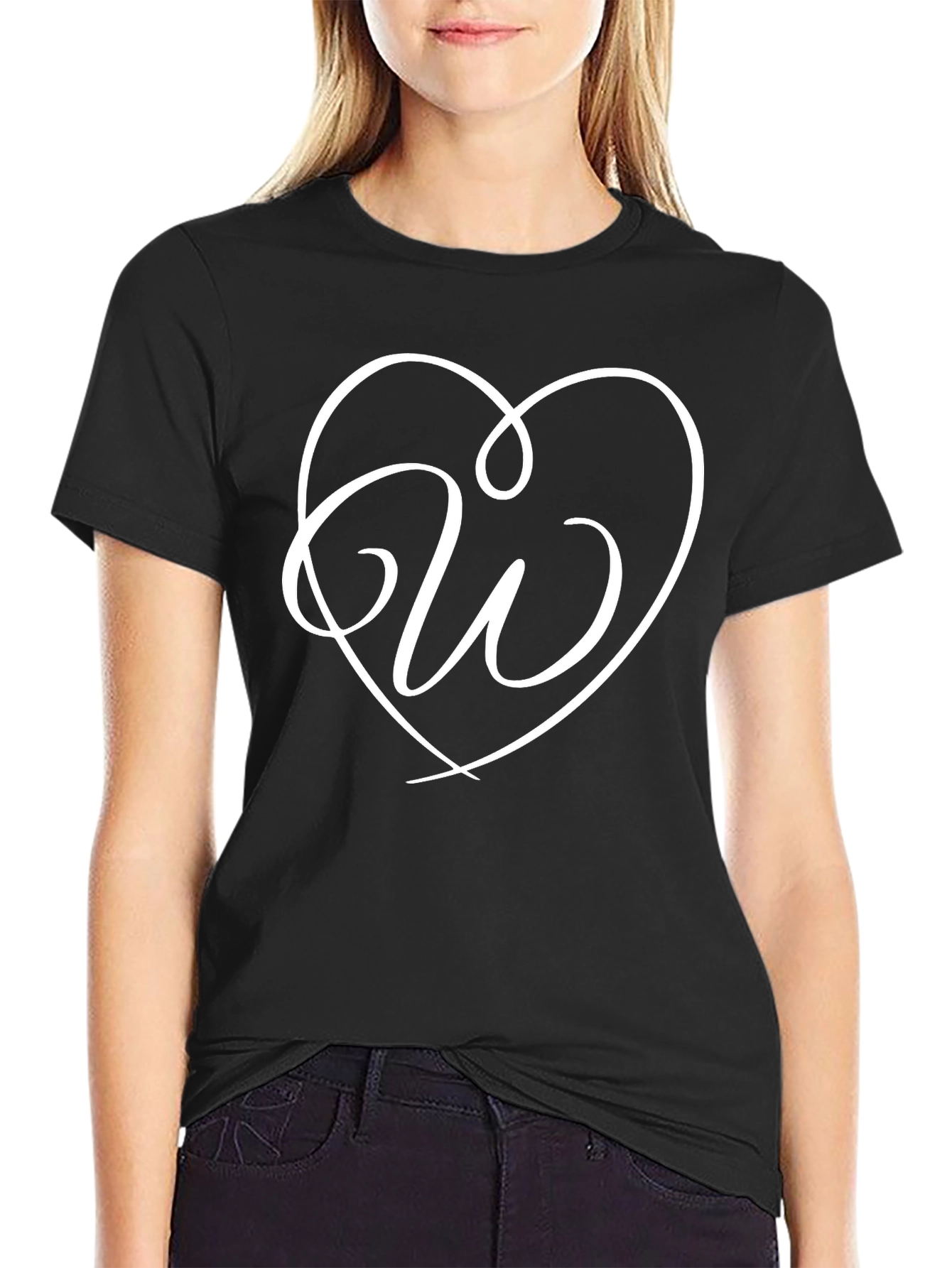 Show your love with this stylish black T-shirt featuring a unique design. A cursive letter 'W' is gracefully placed inside a heart shape, creating an eye-catching and personalized look. Made from soft and comfortable fabric, this tee is perfect for everyday wear. The minimalist design makes it a versatile addition to your wardrobe, ideal for casual outings, or simply expressing your individuality. Get yours today and wear your heart on your sleeve!