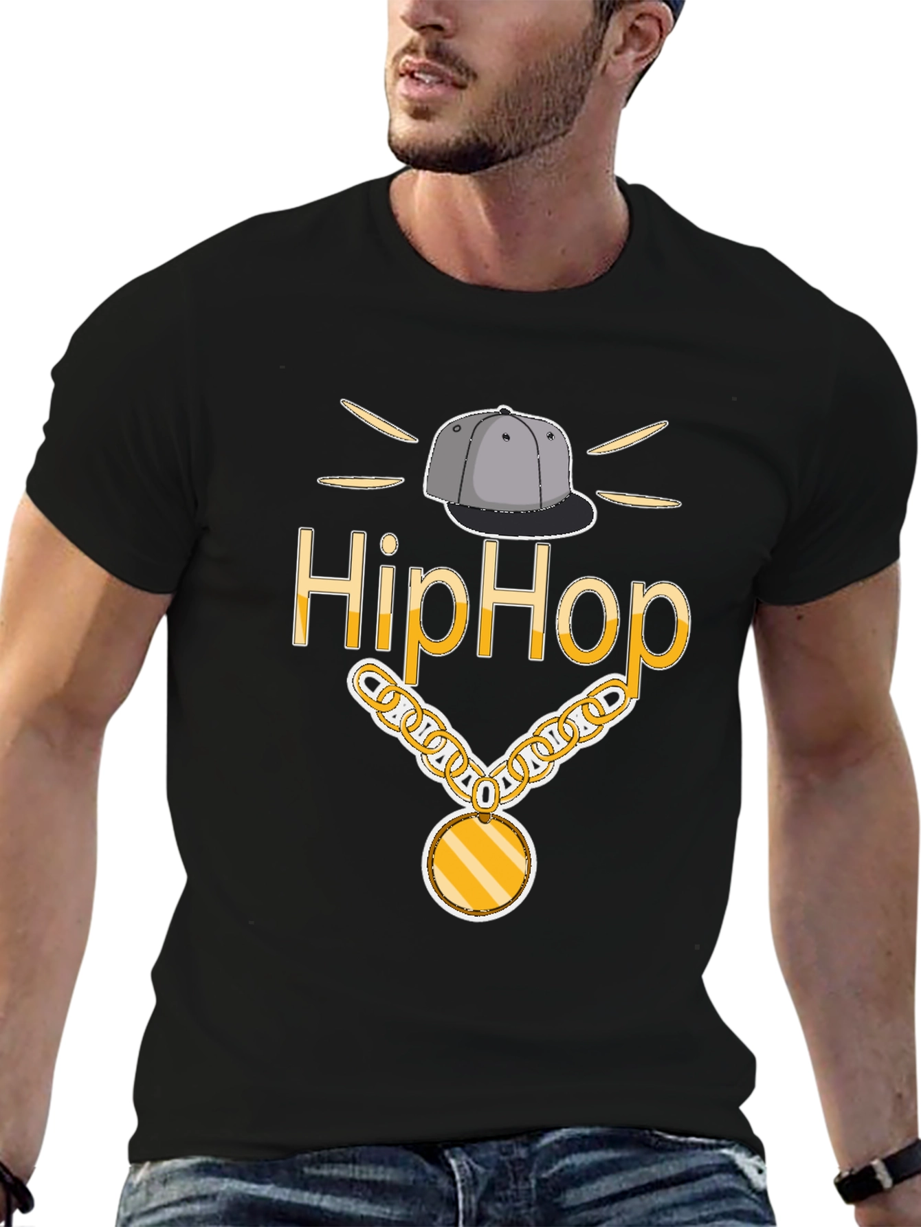 Express your love for hip hop culture with this eye-catching graphic t-shirt! Featuring a vibrant design with a cap, bold “Hip Hop” lettering, and a gold chain, this tee is perfect for music lovers and anyone looking to make a statement. Made from soft, breathable cotton, it offers all-day comfort and style. The classic fit makes it a versatile addition to your wardrobe, ideal for casual outings, concerts, or simply expressing your unique personality. Get ready to turn heads with this unique and stylish tee!