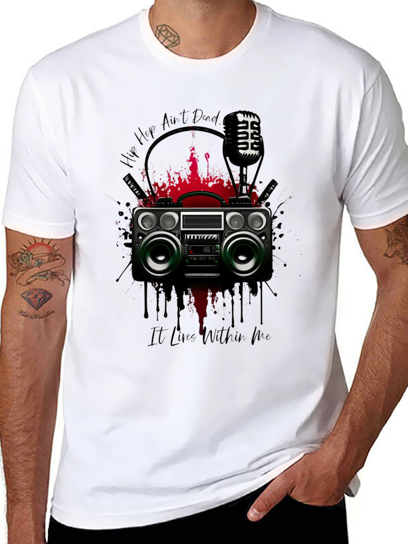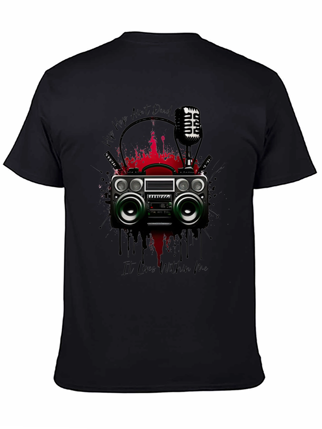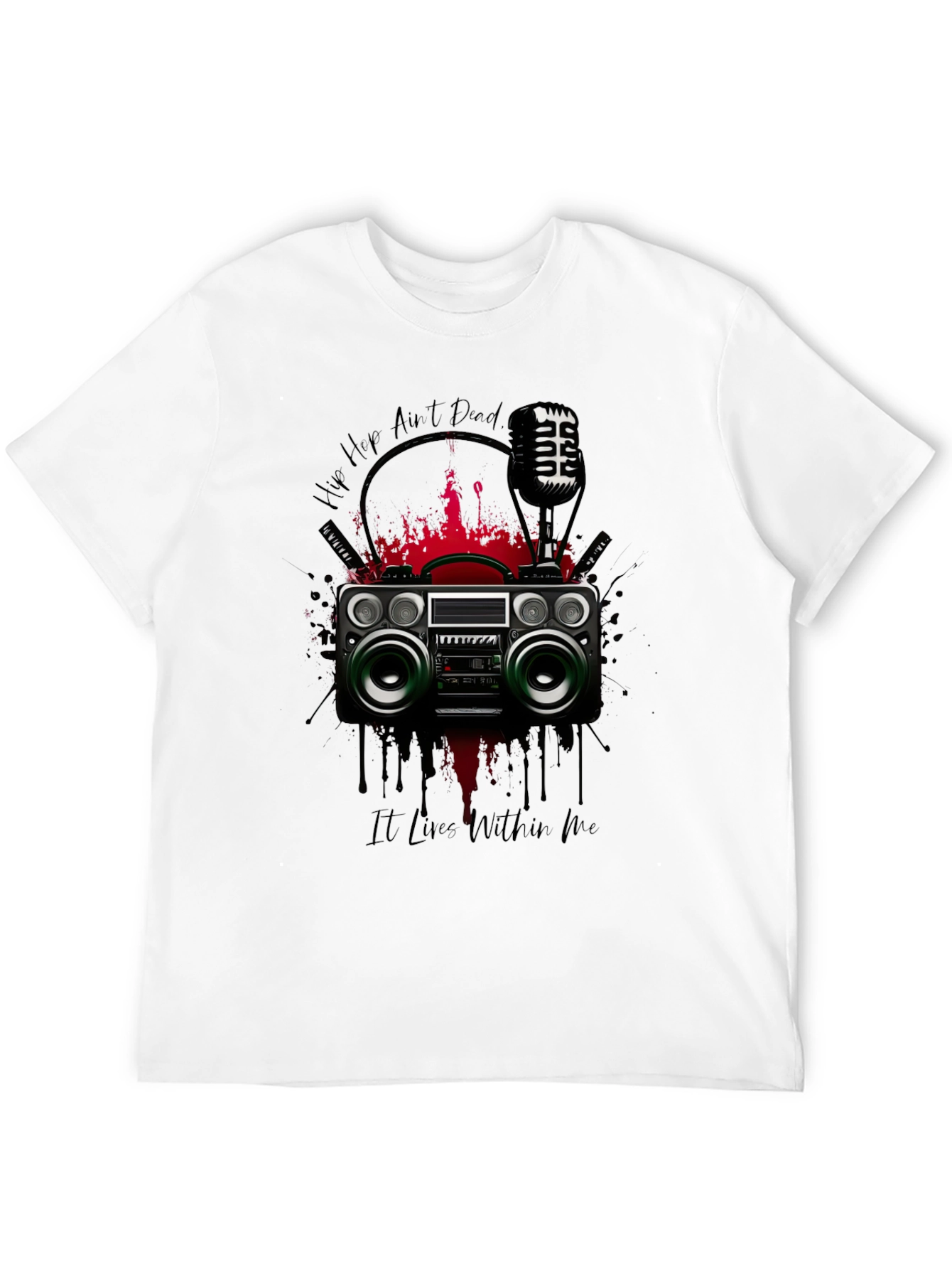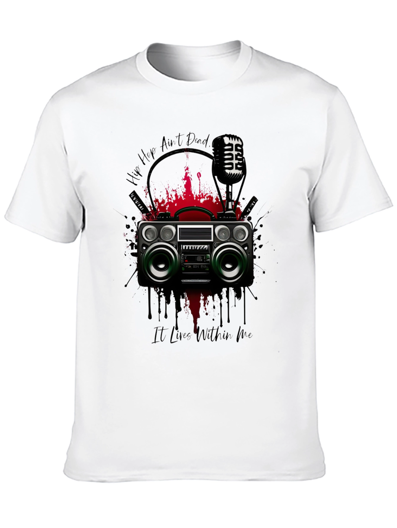 Show off your love for old-school hip hop with this unique graphic t-shirt. The shirt features a vibrant design of a vintage boombox, a classic microphone, and bold "Hip Hop Ain't Dead" lettering. Red splashes enhance the graphic's edgy look. Made from comfortable, breathable fabric, this tee is perfect for casual wear, music events, or expressing your individual style. Let the world know hip hop lives within you with this stylish statement piece.