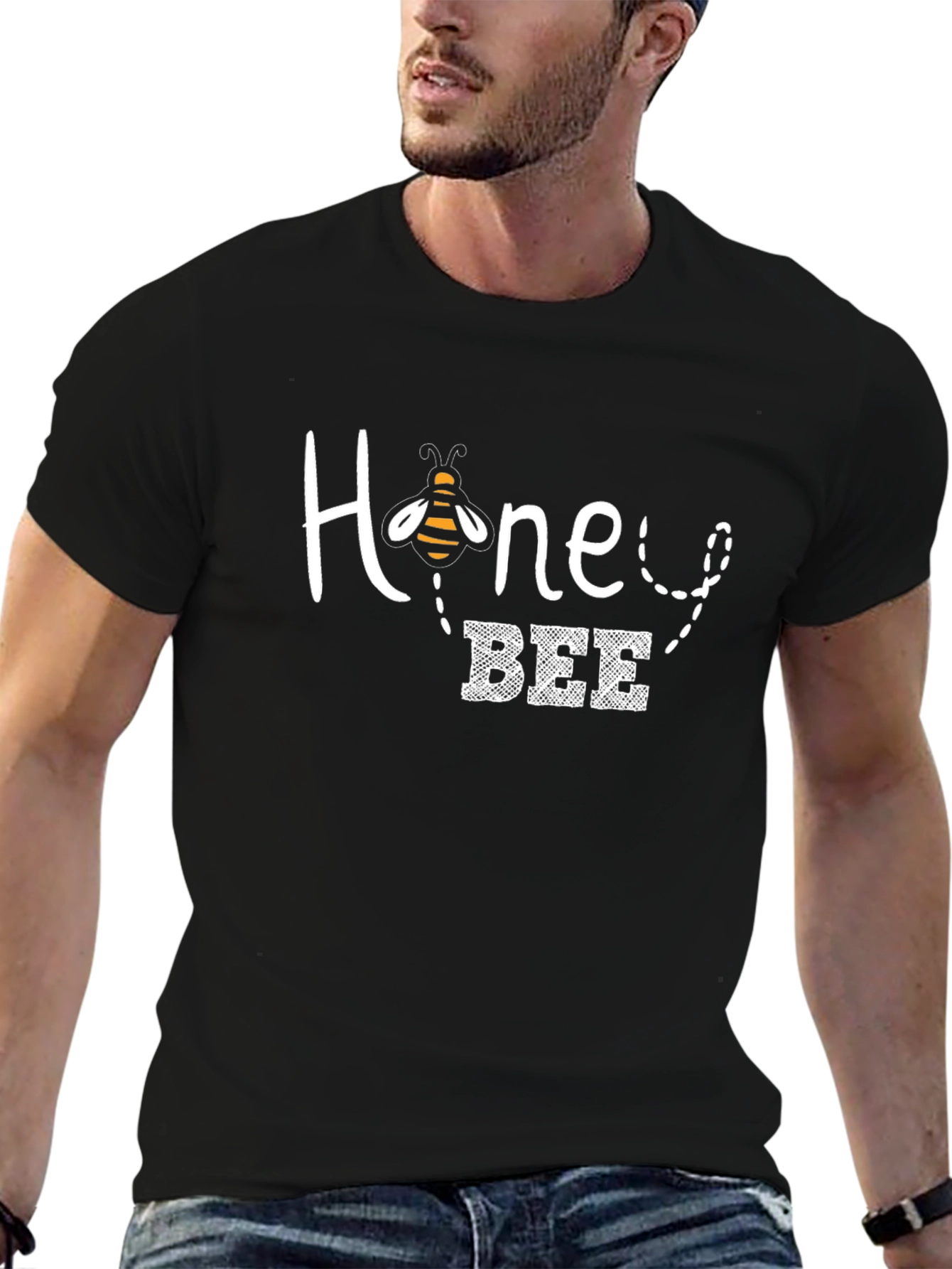 Buzz into style with this adorable black t-shirt featuring a delightful "Honey Bee" graphic. The design showcases a cute bee illustration integrated into the word "Honey", followed by "BEE" in a playful blocky font. Made from a comfortable-looking fabric, this tee is perfect for casual wear. Ideal for everyday outings, weekend adventures, or simply relaxing at home, this t-shirt adds a touch of sweetness to any ensemble. Show off your love for nature and stand out in this eye-catching, conversation-starting piece. A must-have addition to any bee enthusiast's wardrobe!