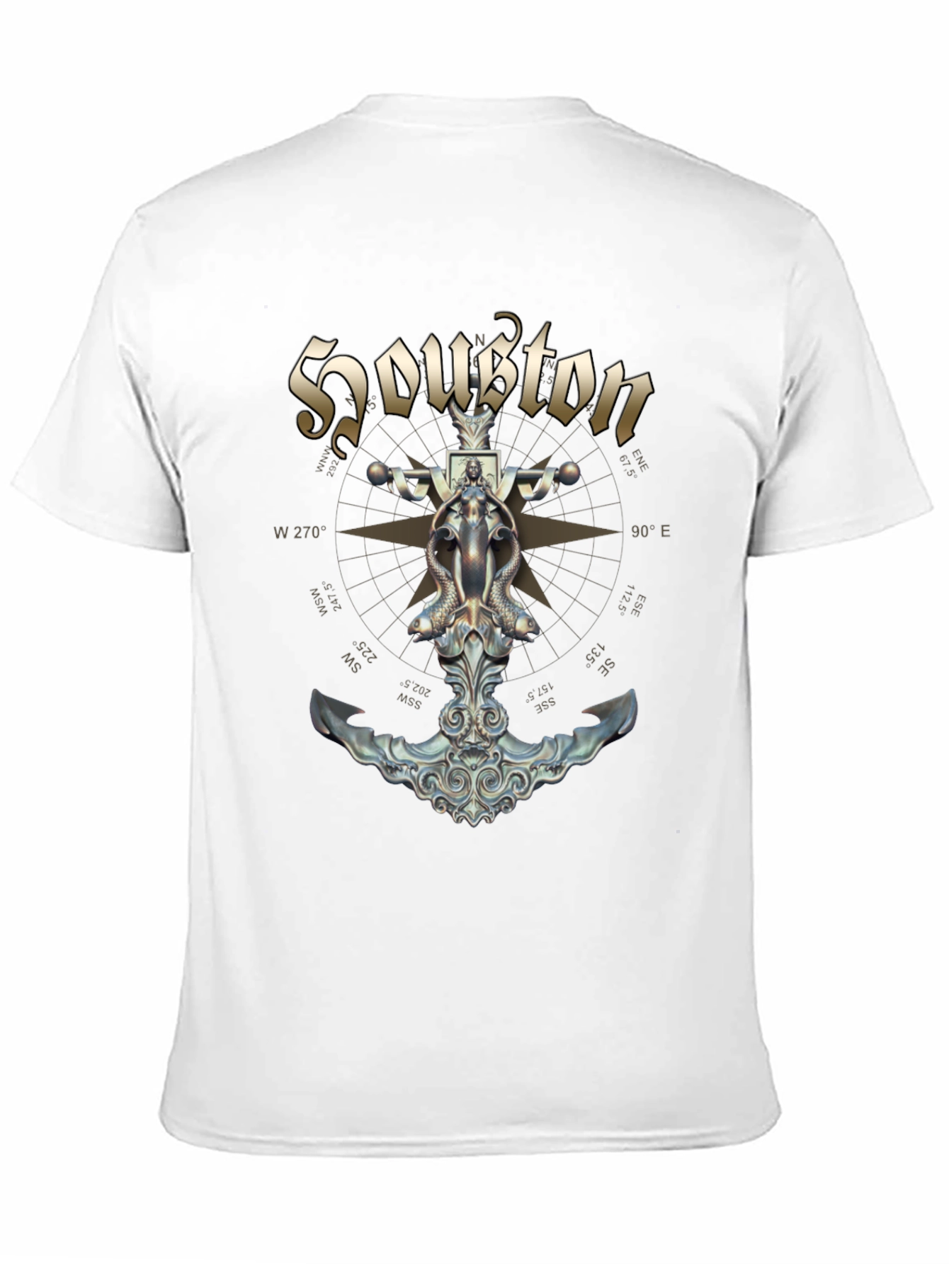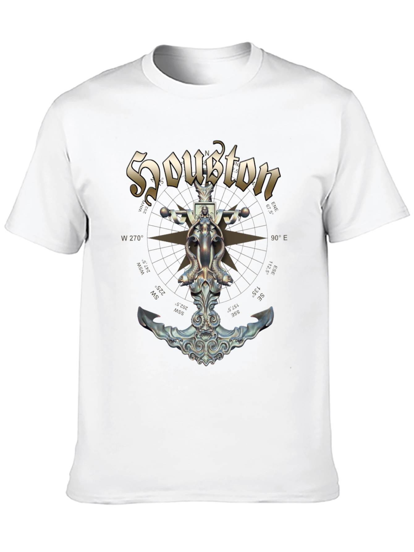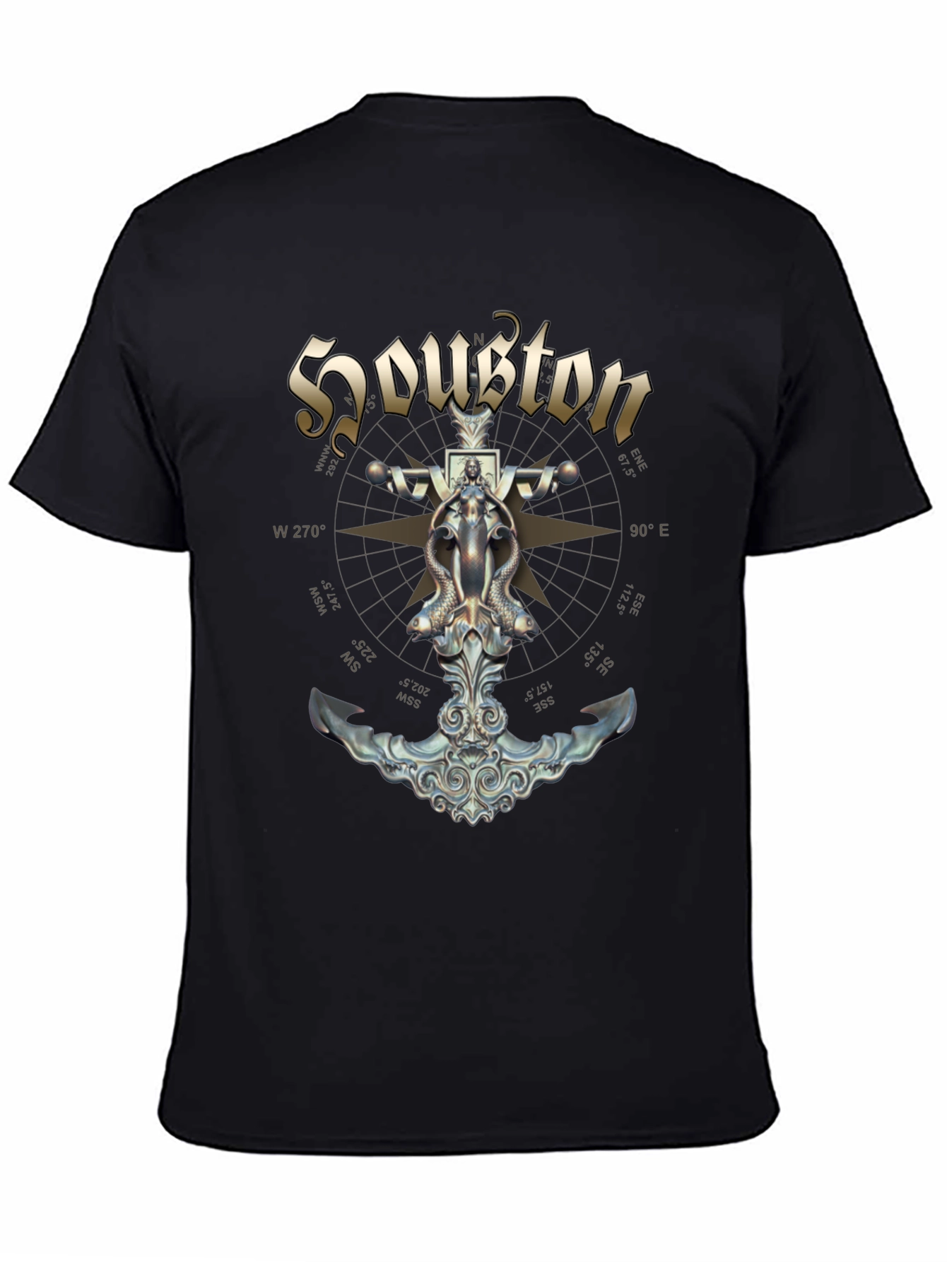 This striking black t-shirt features a unique graphic design that's sure to catch the eye. The focal point is a detailed silver anchor, intricately designed with nautical and classical elements. Superimposed over the anchor is a compass rose with degree markings, adding a layer of depth and adventure to the design. The word "Houston" arches above the image in a stylized gold font, providing a touch of elegance. This shirt is perfect for those who appreciate bold designs, nautical themes, or want to showcase their love for Houston. Made from comfortable materials, it's ideal for everyday wear and casual outings.
