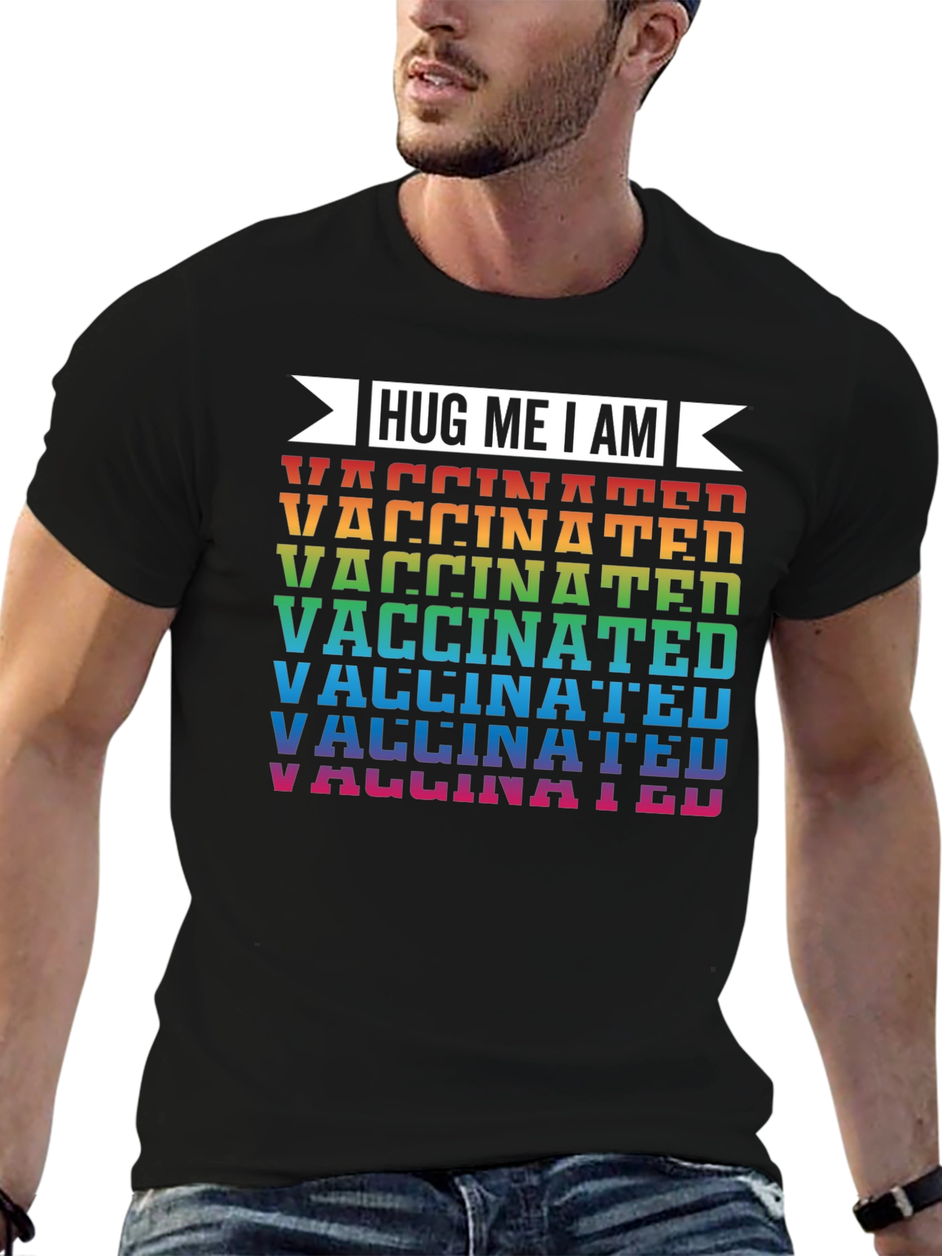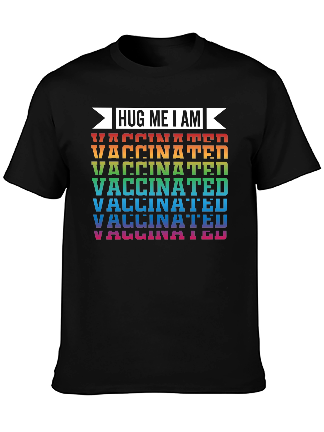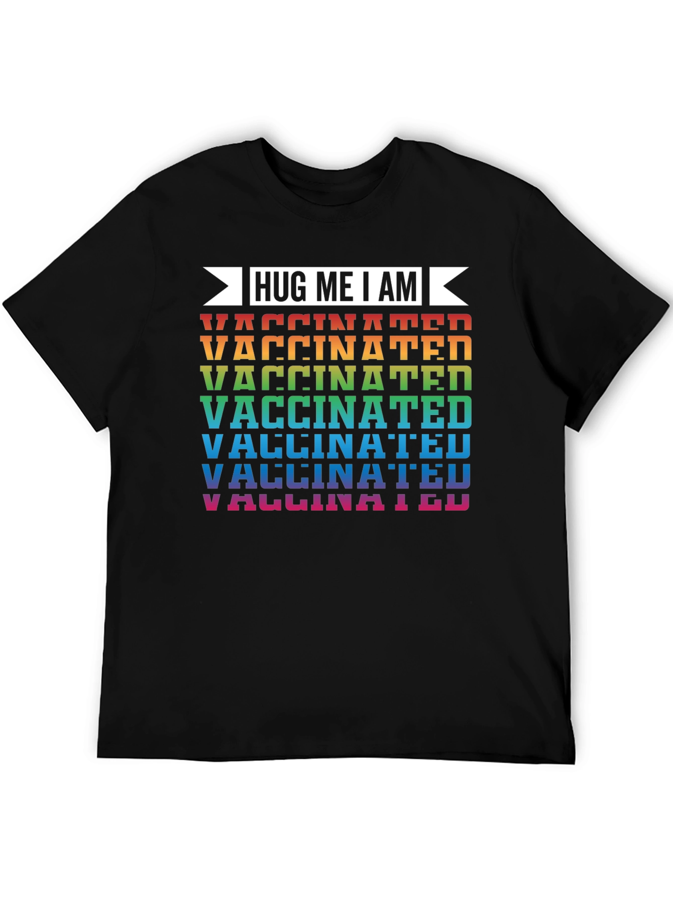 Show your support and encourage hugs with this "Hug Me I Am Vaccinated" T-shirt. The bold, eye-catching design features the phrase "Hug Me I Am" above the word "Vaccinated" repeated in a vibrant rainbow of colors. This tee is a statement piece for those who value health and safety. Made with a soft, comfortable fabric and a classic fit, it's perfect for everyday wear, social gatherings, or as a conversation starter. Stand out and promote a positive message with this unique and stylish shirt!