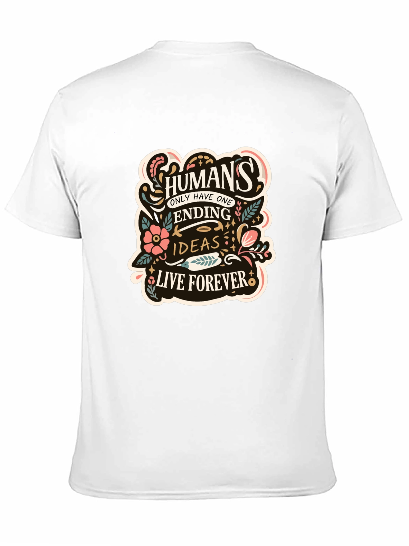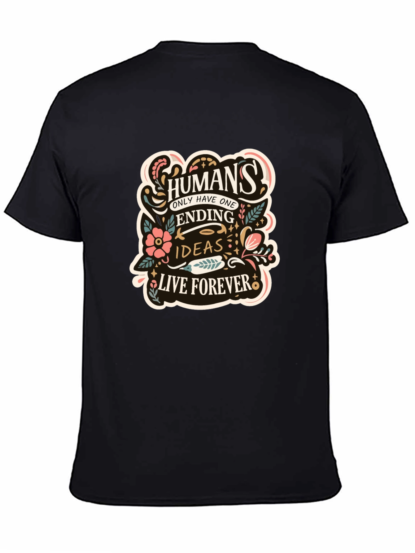 Showcase your unique style with this bold, black graphic t-shirt. This eye-catching tee features a striking design with the words 'Humans only have one ending, ideas live forever' adorned with floral accents. Made from a comfortable, breathable fabric, this shirt is perfect for everyday wear. The classic fit ensures a relaxed and stylish look, making it ideal for casual outings, concerts, or expressing your individuality. This statement piece is sure to spark conversations and make you stand out from the crowd. Express your love for thought-provoking messages with this must-have tee!