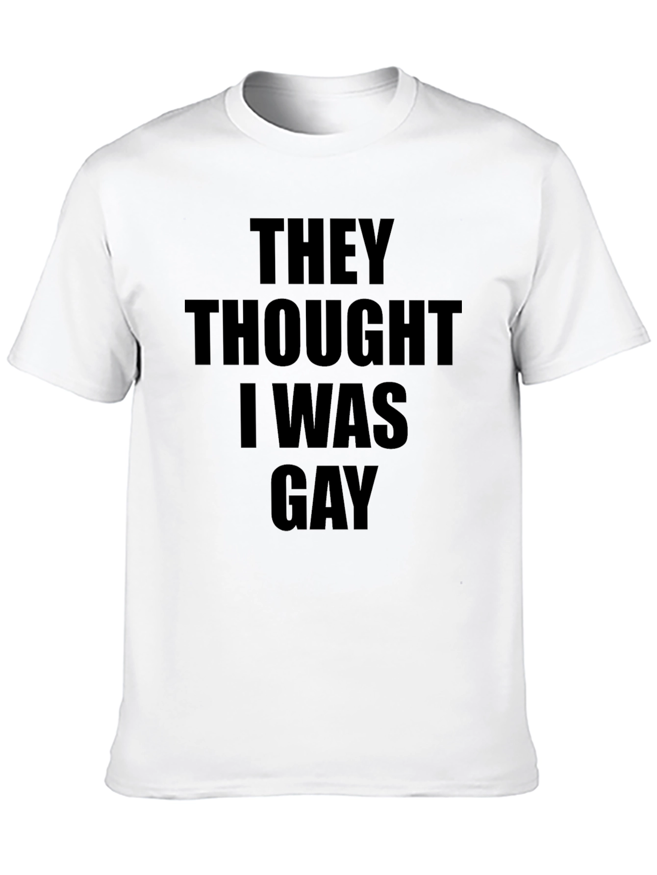 Make a statement with this bold black t-shirt featuring the phrase "They Thought I Was Gay" in a prominent, contrasting font. This classic fit tee offers comfort and style, perfect for casual wear or expressing your sense of humor. Crafted from a soft-looking fabric, this shirt will keep you comfortable all day. The short sleeves and crew neck design make it a versatile addition to any wardrobe. Whether you're hanging out with friends, running errands, or attending a casual event, this tee is sure to turn heads and spark conversation. Pair it with jeans, shorts, or chinos for a relaxed yet stylish look.