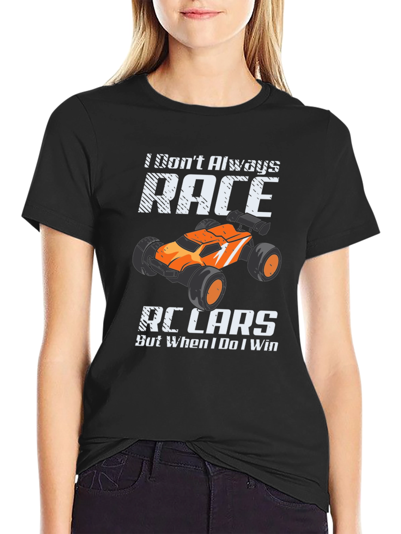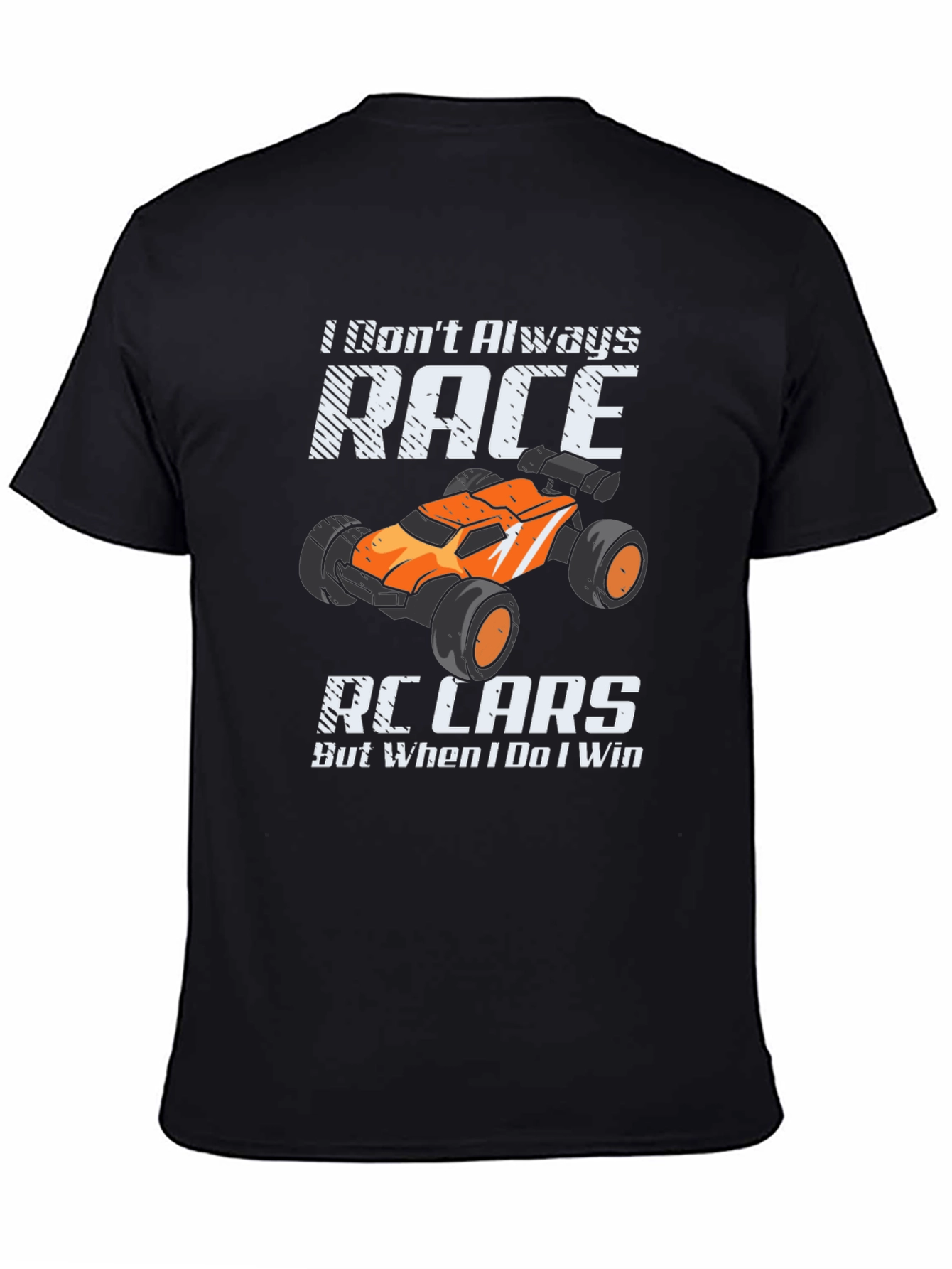 Show off your love for RC cars with this humorous black t-shirt! The design features a bold graphic of an orange RC car alongside the witty phrase 'I Don't Always Race RC Cars But When I Do I Win'. Made from what appears to be soft, breathable cotton, this tee offers both comfort and style. It's a perfect conversation starter at the track, casual outings, or simply lounging around. Get yours today and let everyone know you're a champion RC racer!
