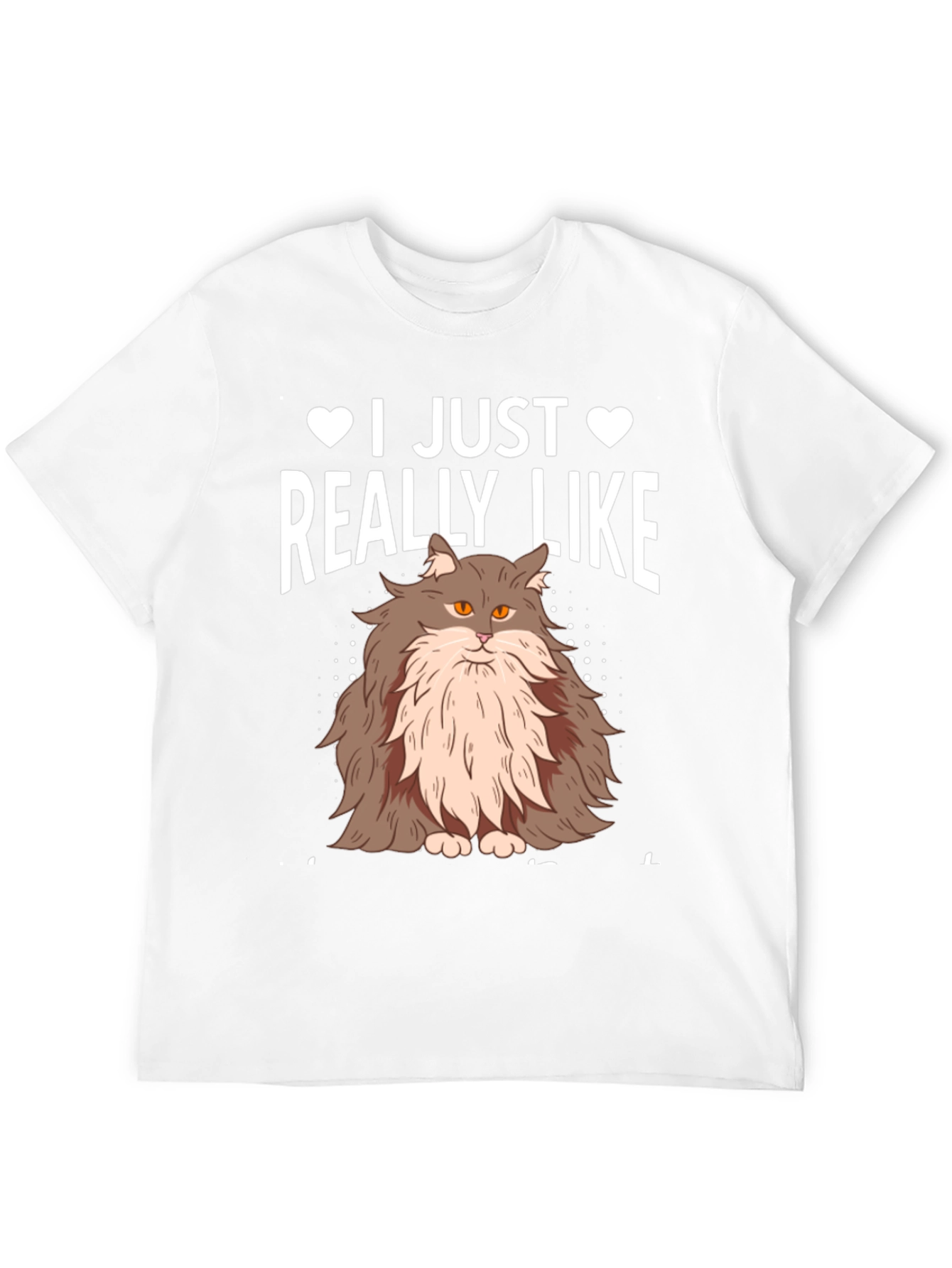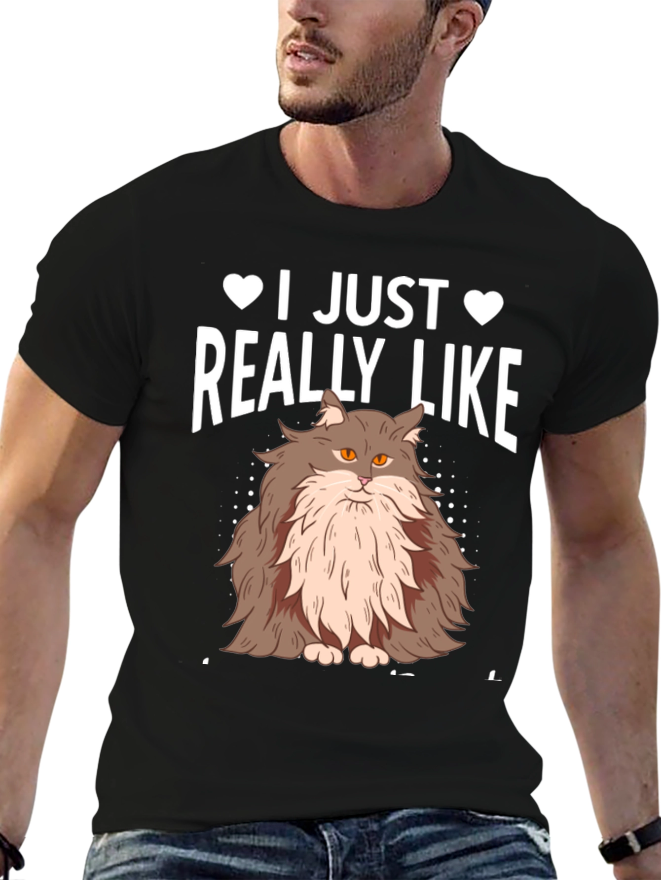 Show your love for feline friends with this charming black t-shirt. This stylish tee features a fluffy, adorable cat graphic, accompanied by the text "I JUST REALLY LIKE" with heart icons. The design is printed in white, creating a bold contrast against the black fabric. Made from a comfortable and breathable material, this shirt is perfect for everyday wear. Ideal for cat lovers, casual outings, or as a fun gift. Express your passion for cats in a fashionable and comfortable way with this unique t-shirt.