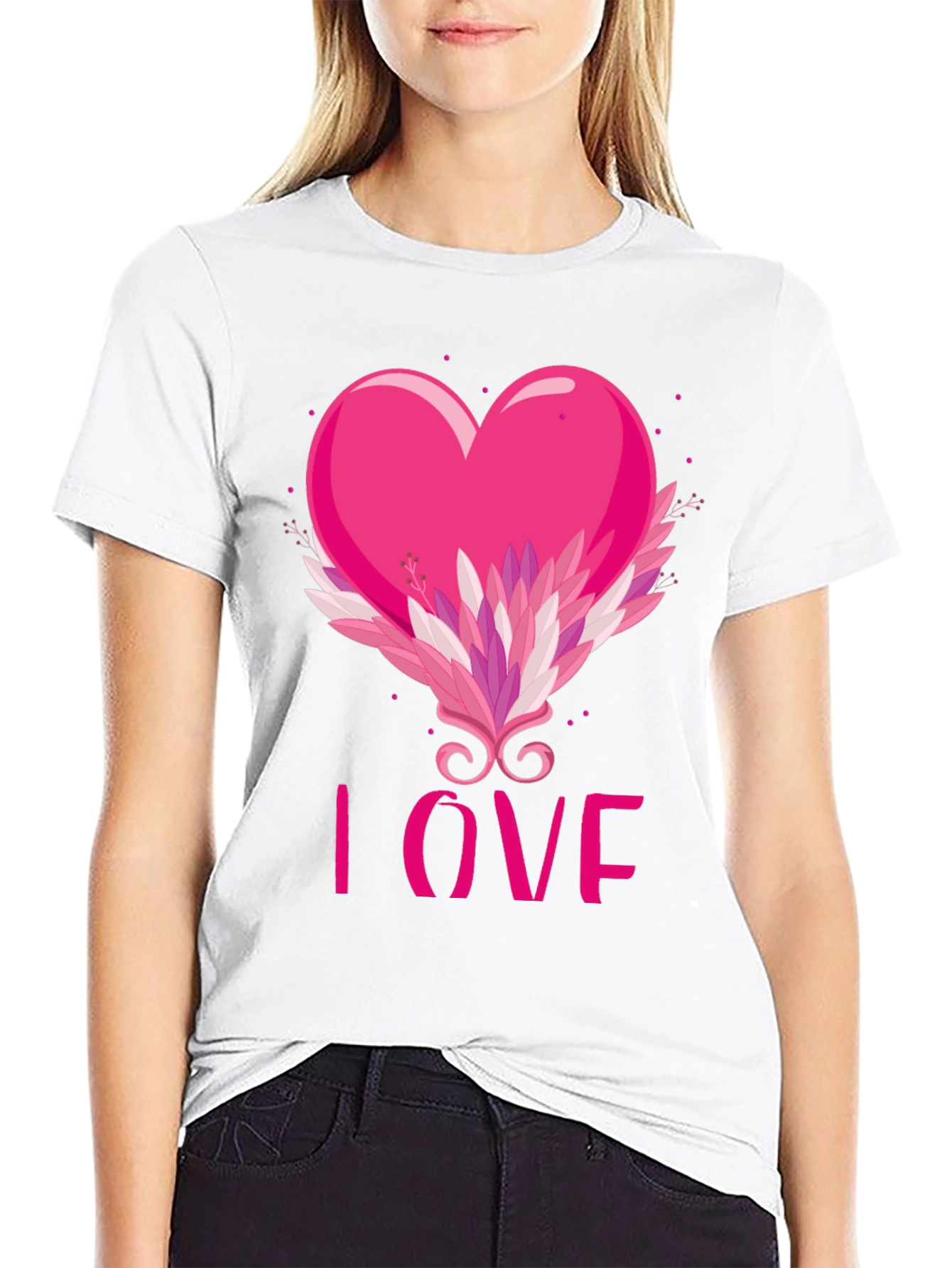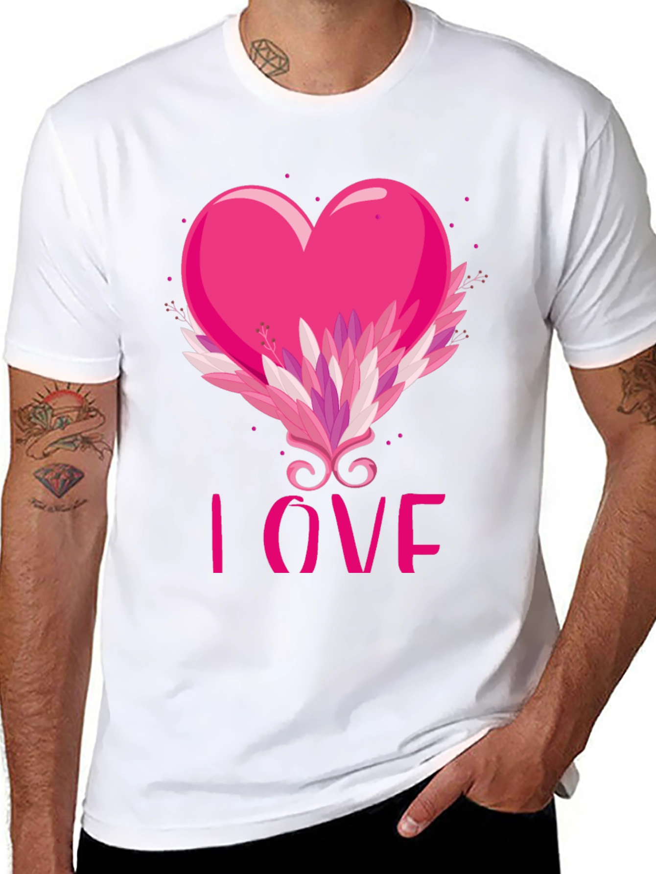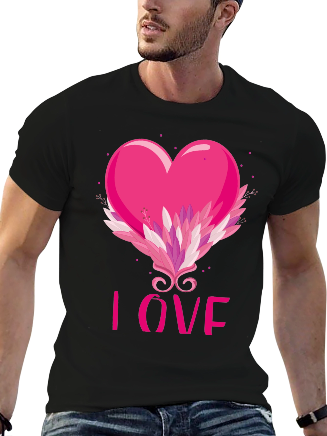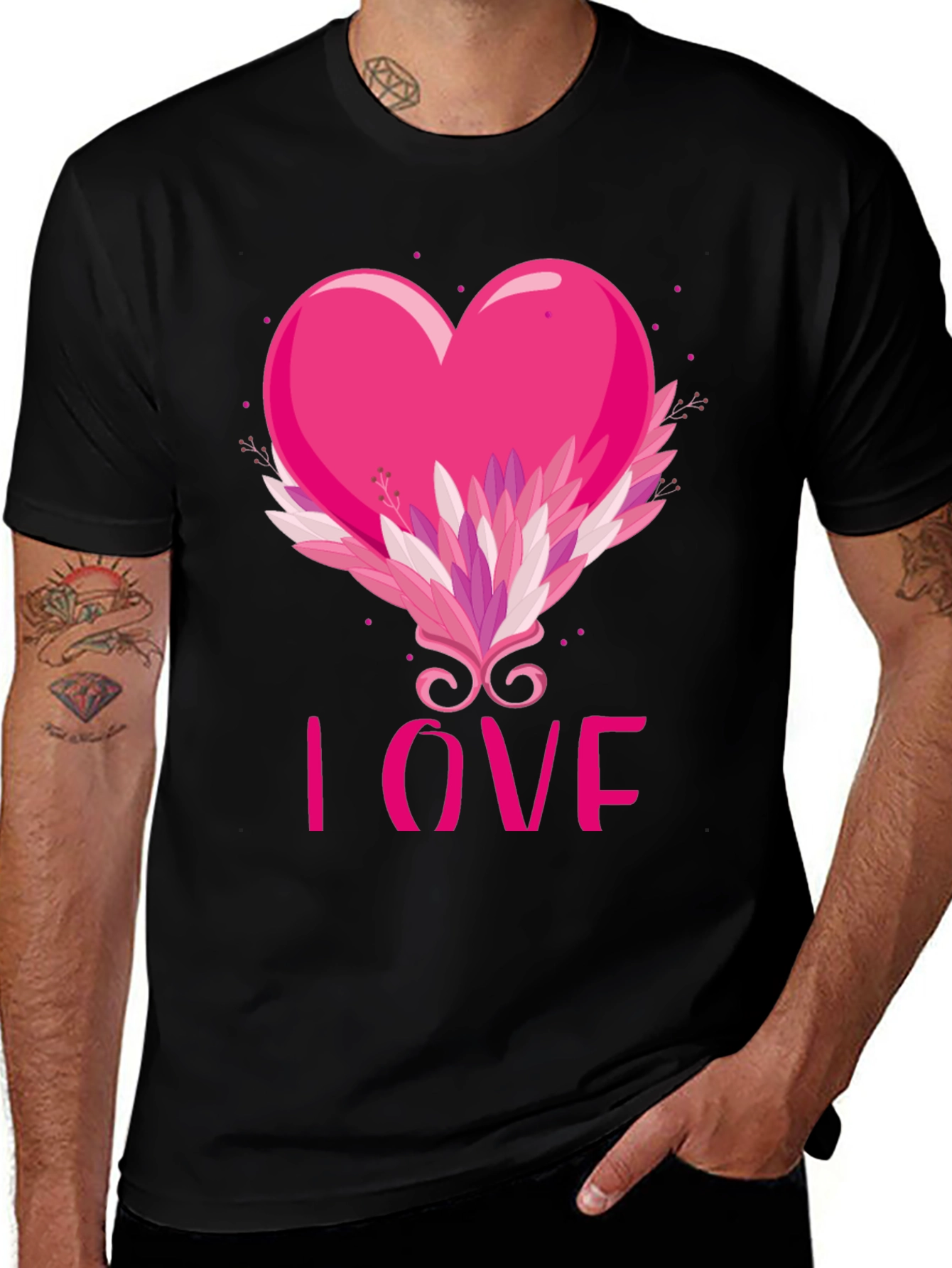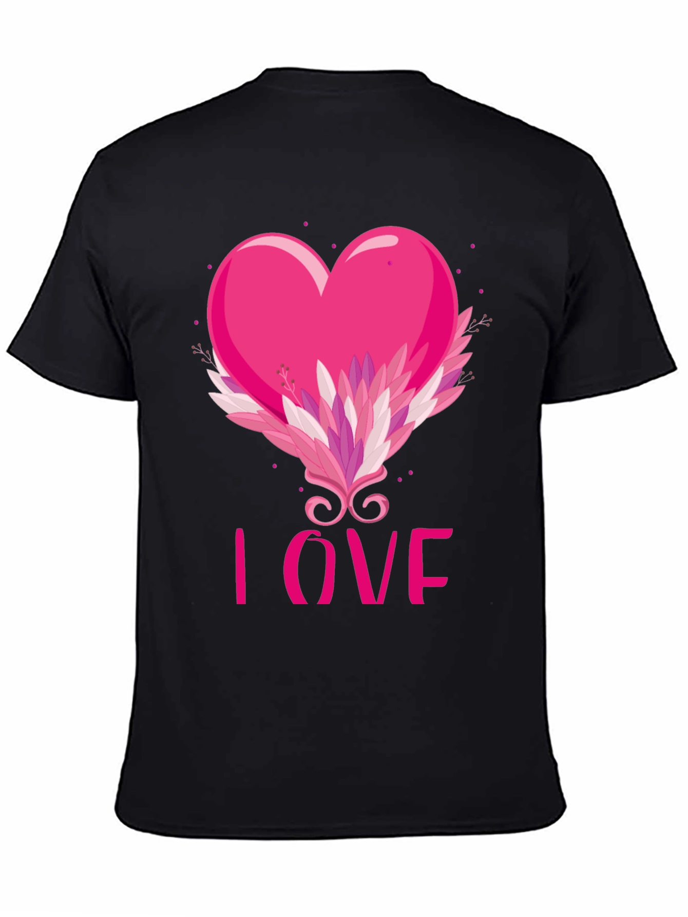 Show your affection with this stylish black t-shirt featuring a vibrant pink heart design. The heart is embellished with a decorative flourish of leaves and swirls, and the word 'LOVE' is displayed beneath. Made from comfortable material, this tee is perfect for Valentine's Day, casual wear, or making a statement. Get yours today!