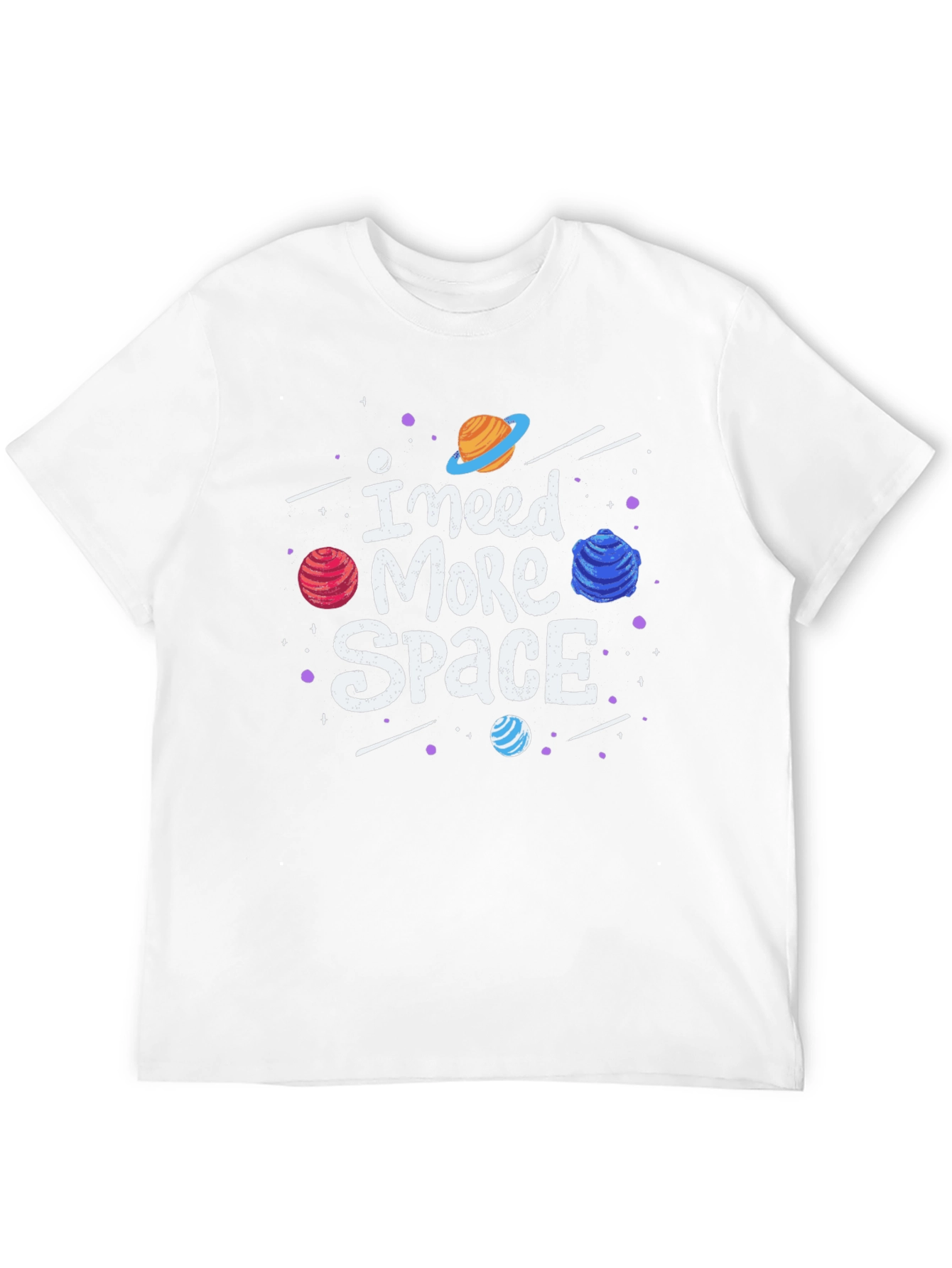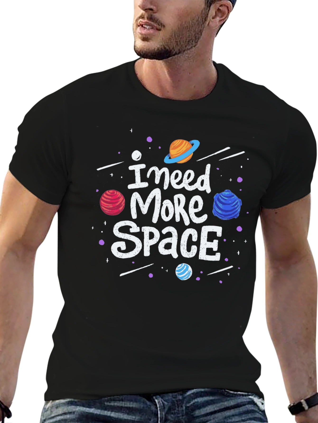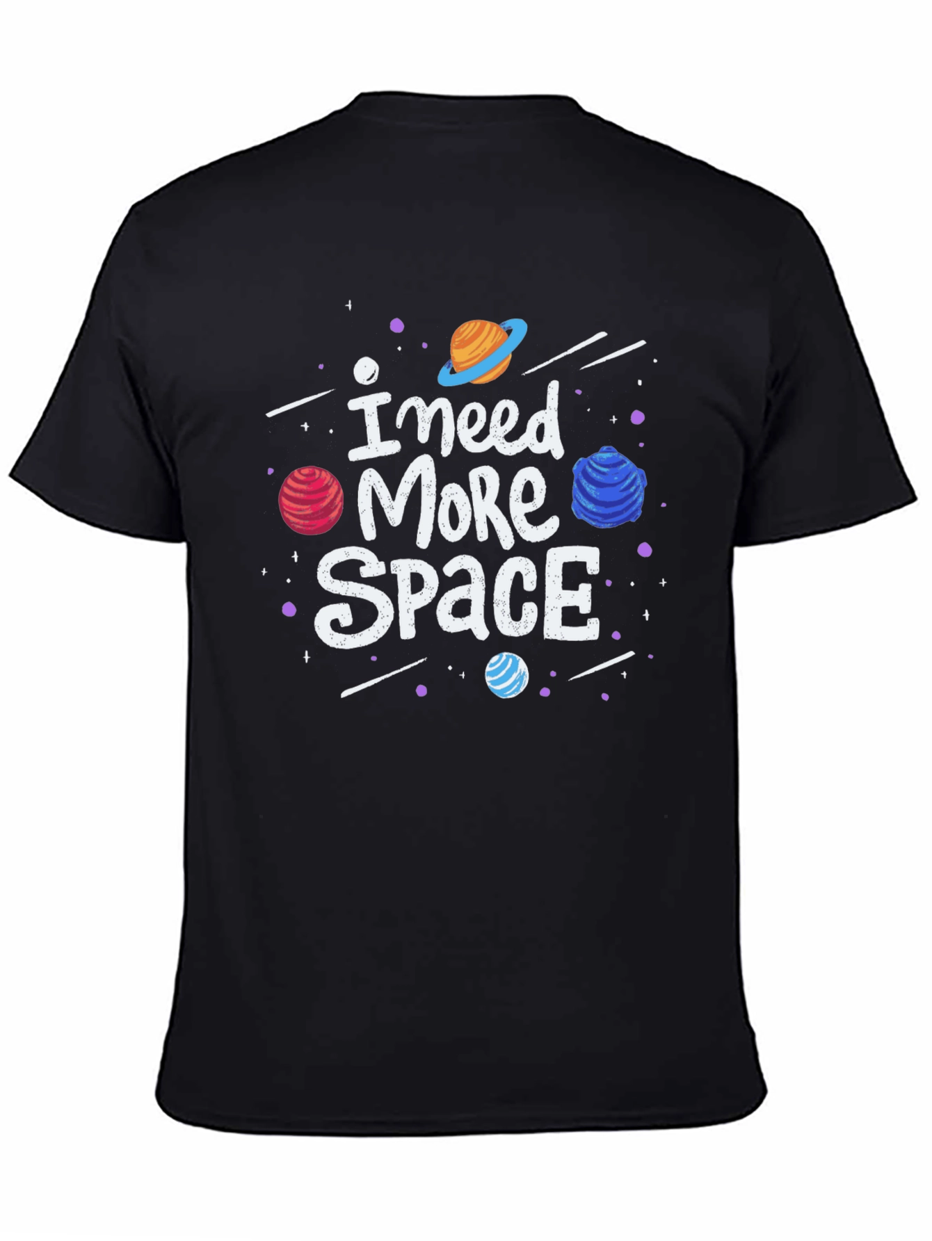 Express your love for the cosmos with this fun and stylish graphic t-shirt. Featuring a bold 'I Need More Space' slogan surrounded by colorful planets and stars, this tee is perfect for anyone who dreams of intergalactic adventures. The design is printed on a soft, comfortable black fabric, making it ideal for everyday wear. Whether you're a space enthusiast or just looking for a unique and eye-catching shirt, this tee is sure to turn heads. Pair it with jeans for a casual look or dress it up with a blazer for a night out. A must-have for any wardrobe!