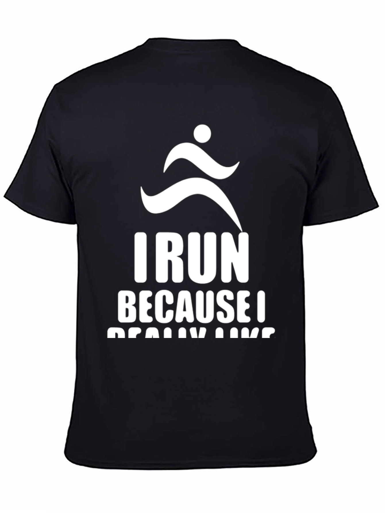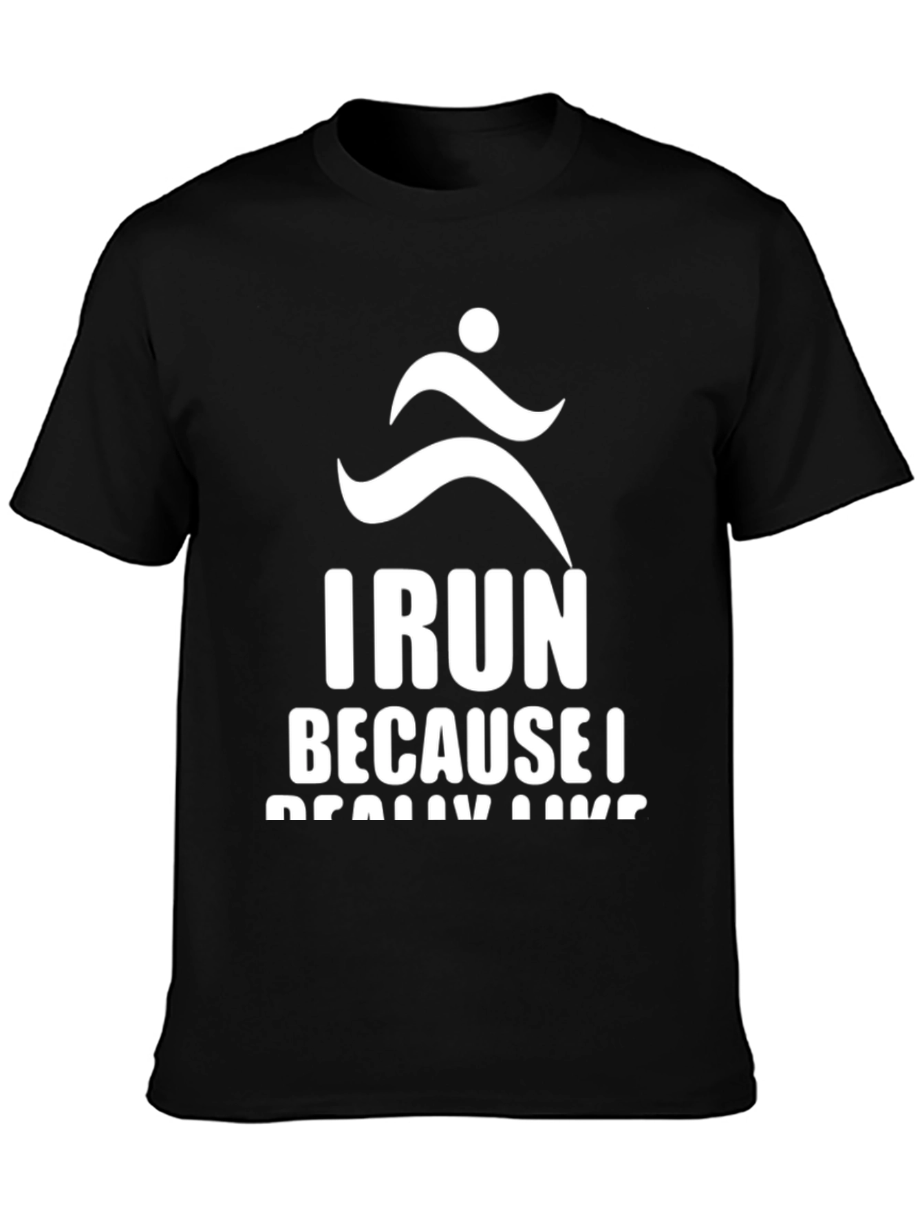 This black t-shirt features a bold, white graphic design. The design includes a stylized silhouette of a running person above the witty text "I RUN BECAUSE I REALLY LIKE RUNNING". The shirt appears to be made from a soft, comfortable fabric, perfect for wearing during workouts, casual outings, or while relaxing at home. This fun shirt would be ideal for runners or anyone with a sense of humor. It's a great way to show your passion for running with a fun twist! Also a great gift for running enthusiasts.