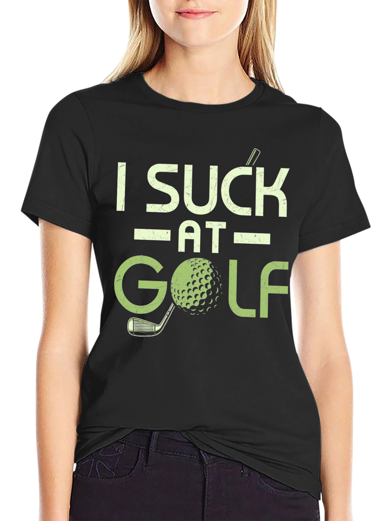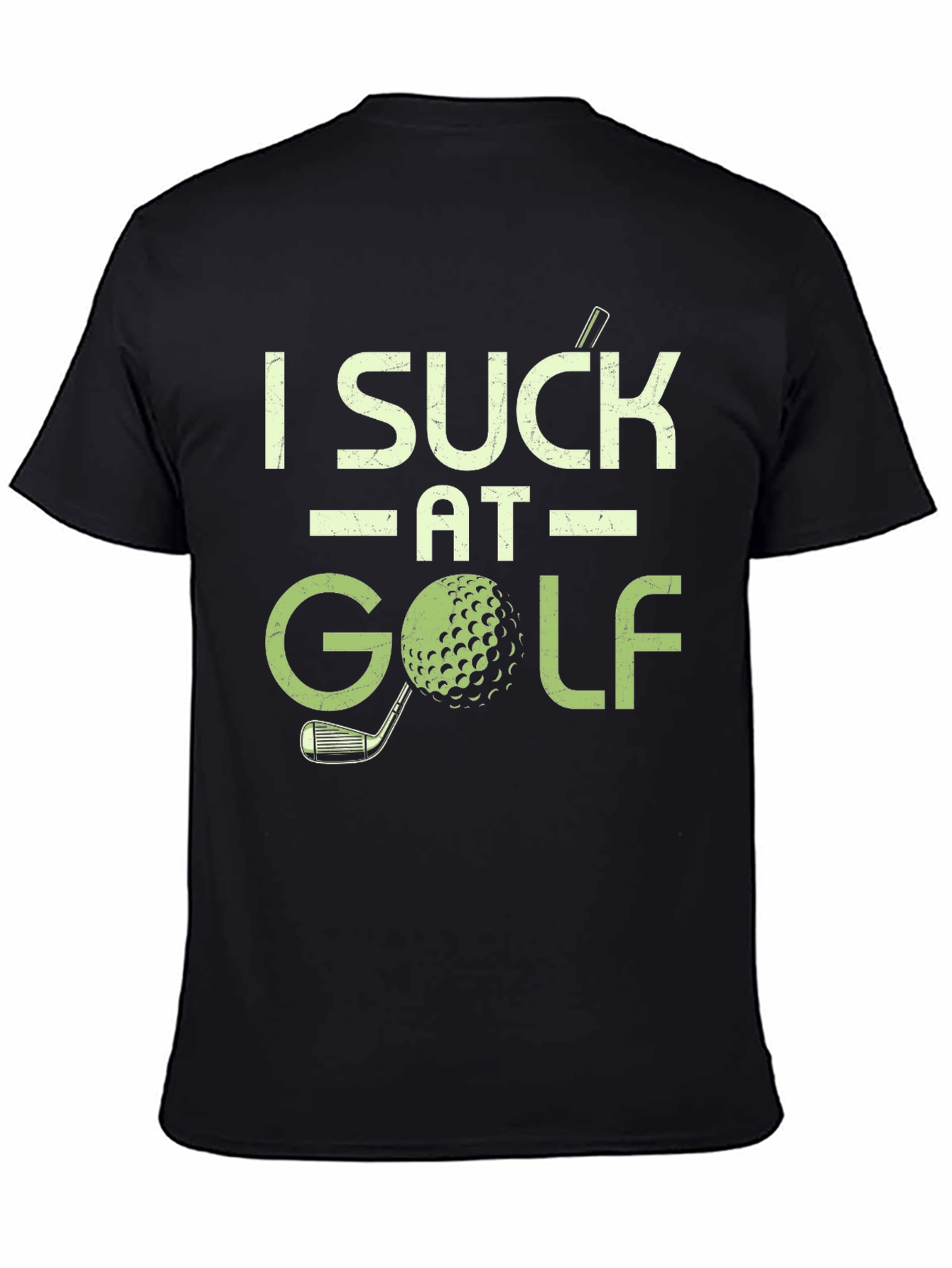 Show off your sense of humor on the green with this funny "I Suck at Golf" T-shirt! This classic tee features bold, distressed lettering in a light green hue, accompanied by a playful golf ball and club graphic. Crafted from a comfortable-looking dark material (likely cotton or a cotton blend), this shirt offers a relaxed fit that's perfect for a casual day on the course or just hanging out. The eye-catching design is sure to spark conversations and bring a smile to fellow golfers. Whether you're a seasoned pro or just starting out, this T-shirt is a great way to embrace the fun side of golf and let everyone know you don't take yourself too seriously. Get yours today and tee off with a laugh!