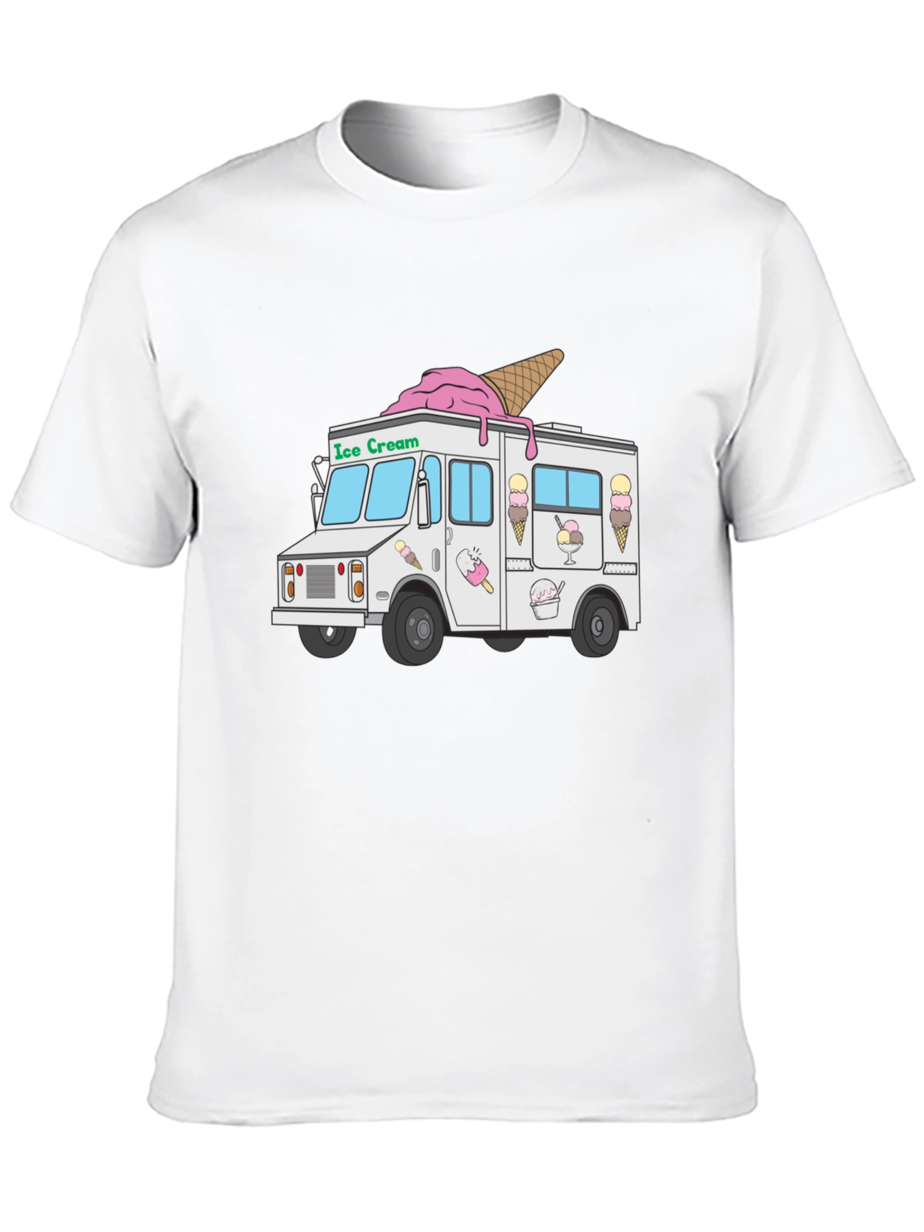 Show off your love for everyone's favorite frozen treat with this unique black t-shirt! The shirt features a playful graphic of an ice cream truck, complete with cones, sundaes, and delicious pink soft serve on the roof. Made from a comfortable and breathable fabric, this tee is perfect for everyday wear. Whether you're heading to the park, grabbing a scoop of your own, or simply want to add a touch of fun to your wardrobe, this ice cream truck t-shirt is sure to be a hit. Get yours today and celebrate your sweet tooth!