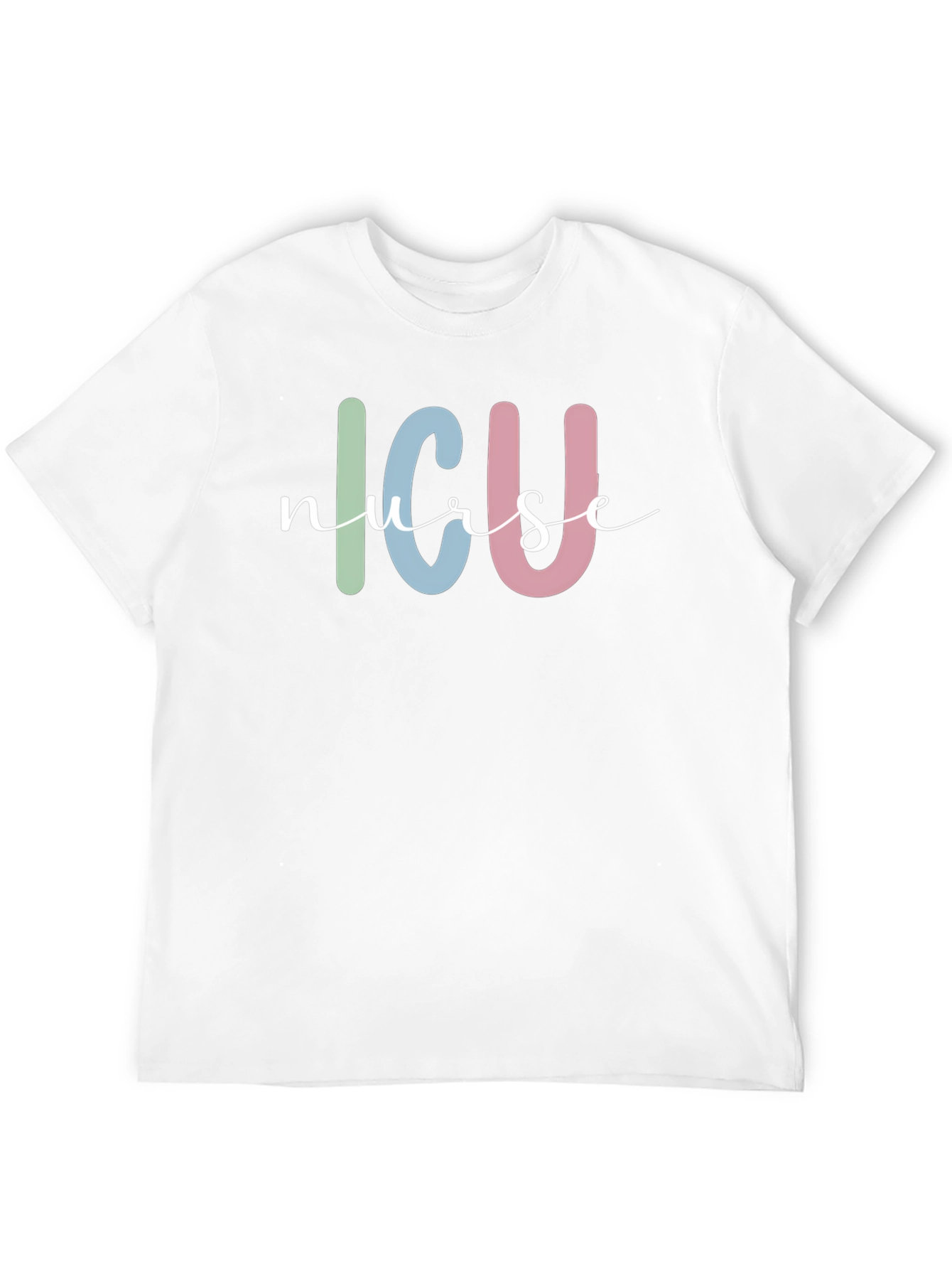 Show your pride and dedication with this stylish ICU Nurse T-shirt. This black tee features a charming design with the letters "ICU" in pastel green, blue, and pink, overlaid with the word "nurse" in elegant white cursive. Made from soft, breathable fabric, it offers all-day comfort, perfect for long shifts or casual wear. The classic fit and durable print ensure lasting wear. Ideal for nurses, nursing students, or anyone in the ICU field, this t-shirt makes a thoughtful gift or a treat for yourself. Express your passion and commitment to patient care with this unique and comfortable t-shirt.