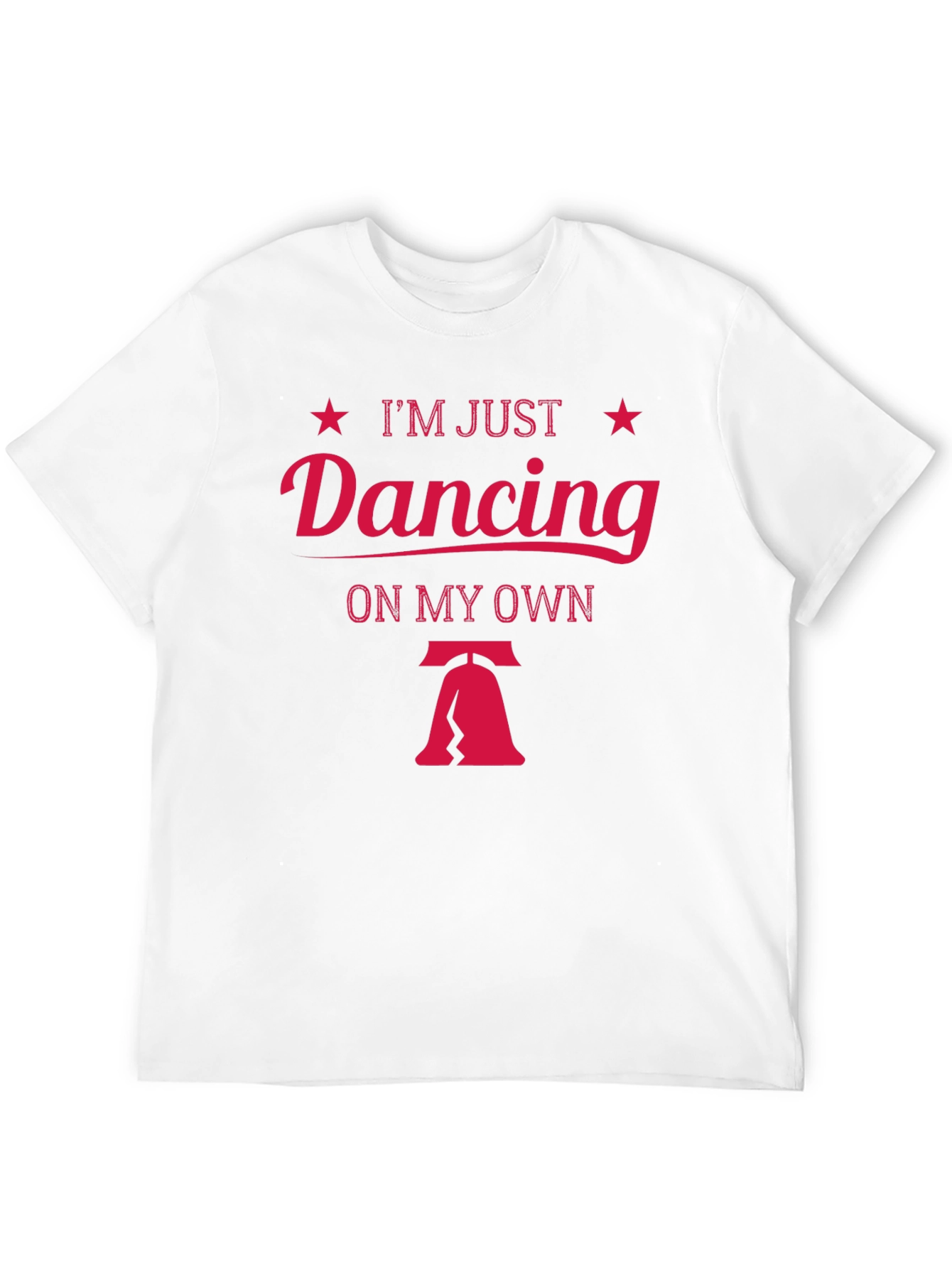 This stylish black t-shirt features a bold, eye-catching graphic design in a vibrant pink hue. The text "I'm Just Dancing" is prominently displayed with decorative stars accenting the phrase. Below, the words "ON MY OWN" are neatly arranged above a stylized image reminiscent of the Liberty Bell with a crack. Crafted from what appears to be a soft, comfortable cotton blend, this tee offers a relaxed fit. Perfect for casual wear, dance events, or expressing your independent spirit, it's sure to be a conversation starter. Show off your love for dancing or simply make a statement with this unique and fashionable garment.