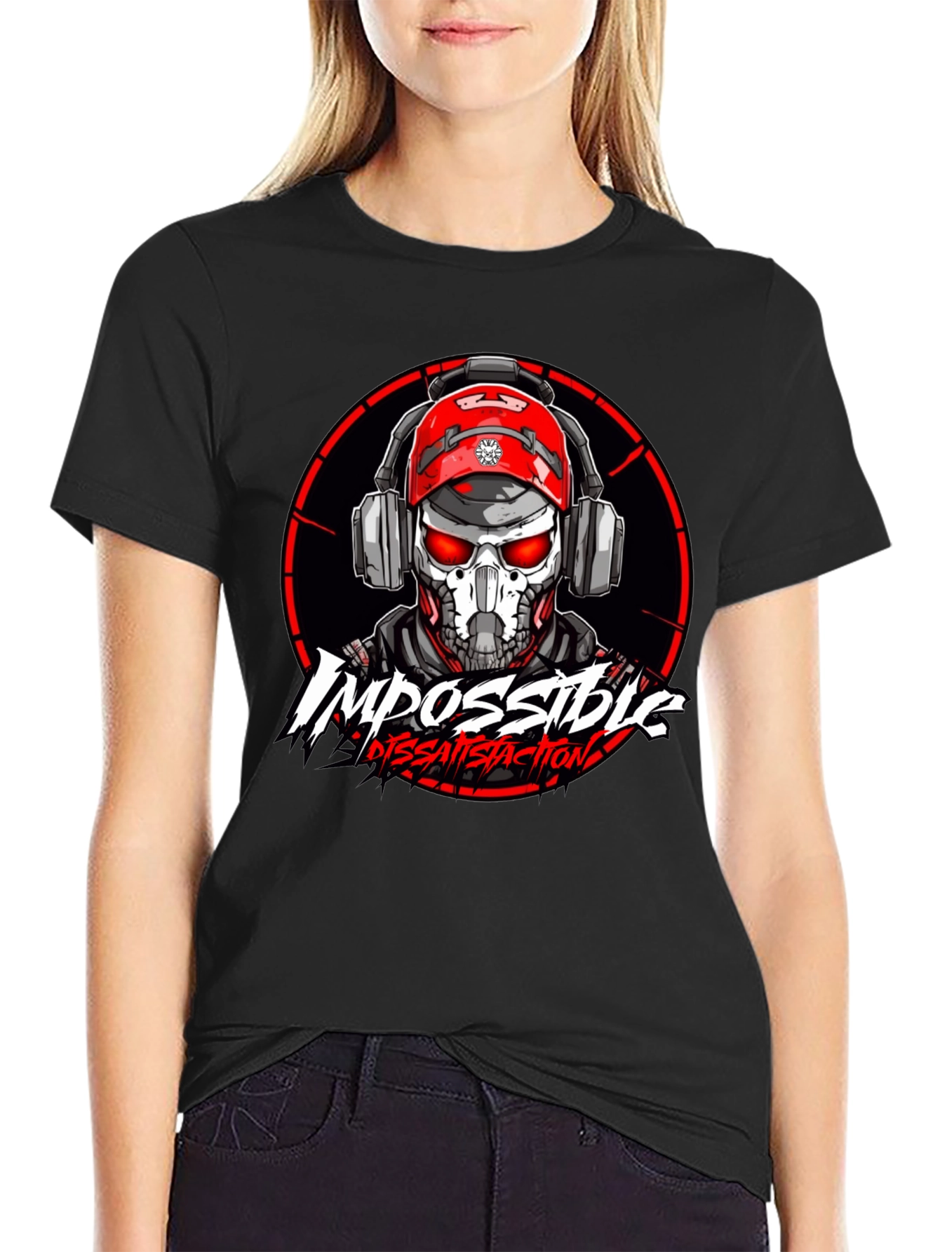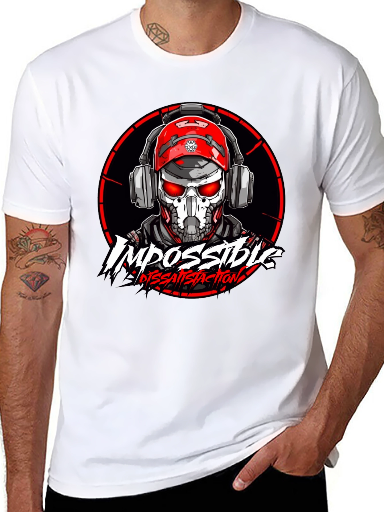 Show off your unique style with this eye-catching graphic t-shirt. The shirt features a bold design with a masked figure, headphones, and the words "Impossible Dissatisfaction". Made from a comfortable-looking dark fabric, this tee is perfect for casual wear or making a statement. The detailed graphic and striking red accents add an edgy touch to any outfit. Wear it to concerts, social gatherings, or just when you want to stand out from the crowd. A must-have for anyone who loves unique graphic tees!