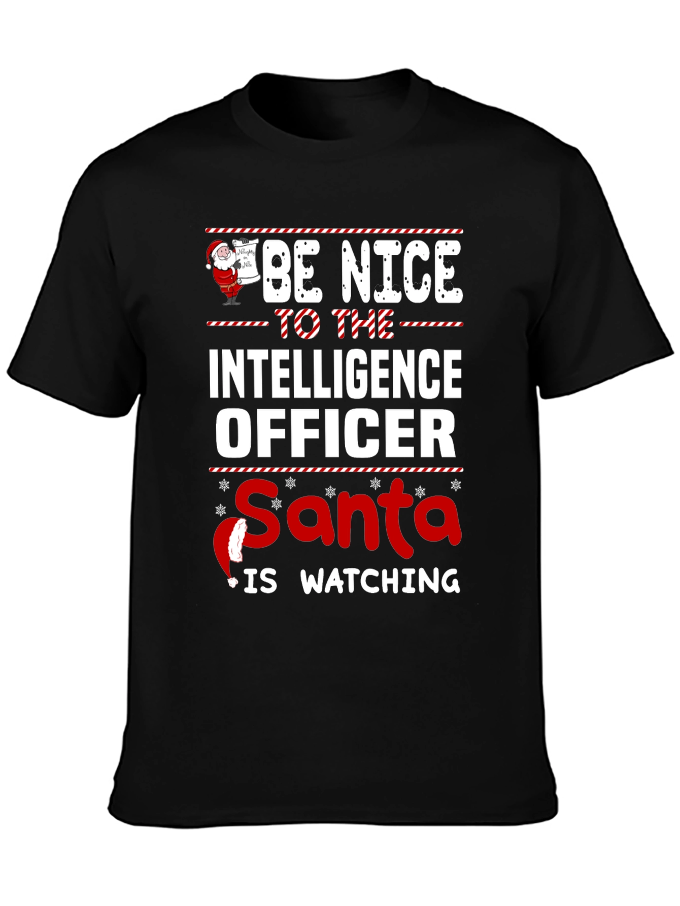 Spread holiday cheer with this fun novelty t-shirt! The black tee features a festive design with the phrase "Be Nice to the Intelligence Officer, Santa Is Watching" in a mix of red and white lettering. A small Santa Claus graphic and snowflake accents add to the Christmas theme. This shirt is perfect for intelligence officers, or anyone with a good sense of humor during the holiday season. Made from a comfortable-looking fabric, it's ideal for Christmas parties, family gatherings, or casual wear throughout December. Grab this unique shirt to show off your holiday spirit!