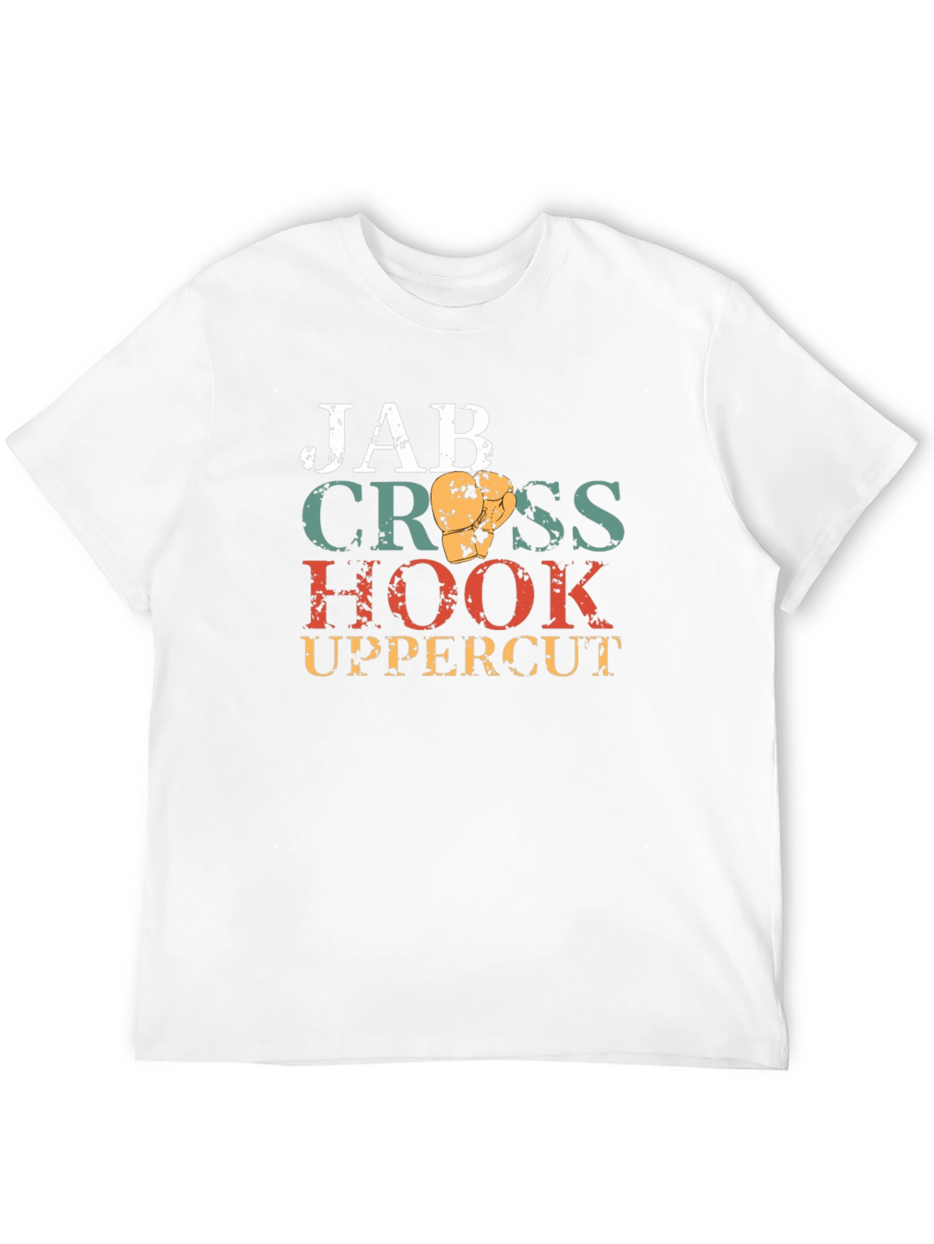 Step into the ring with this striking t-shirt, featuring a bold boxing-inspired design. The shirt showcases the classic boxing moves - Jab, Cross, Hook, and Uppercut - rendered in a vintage, distressed style with varying colors. At the center are boxing gloves. This tee combines comfort and style, making it perfect for workouts, casual wear, or showing off your love for the sport. Stand out with this unique t-shirt that captures the essence of boxing's most powerful moves. A must-have for any boxing fan's wardrobe.