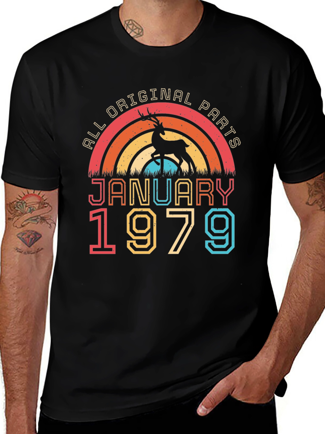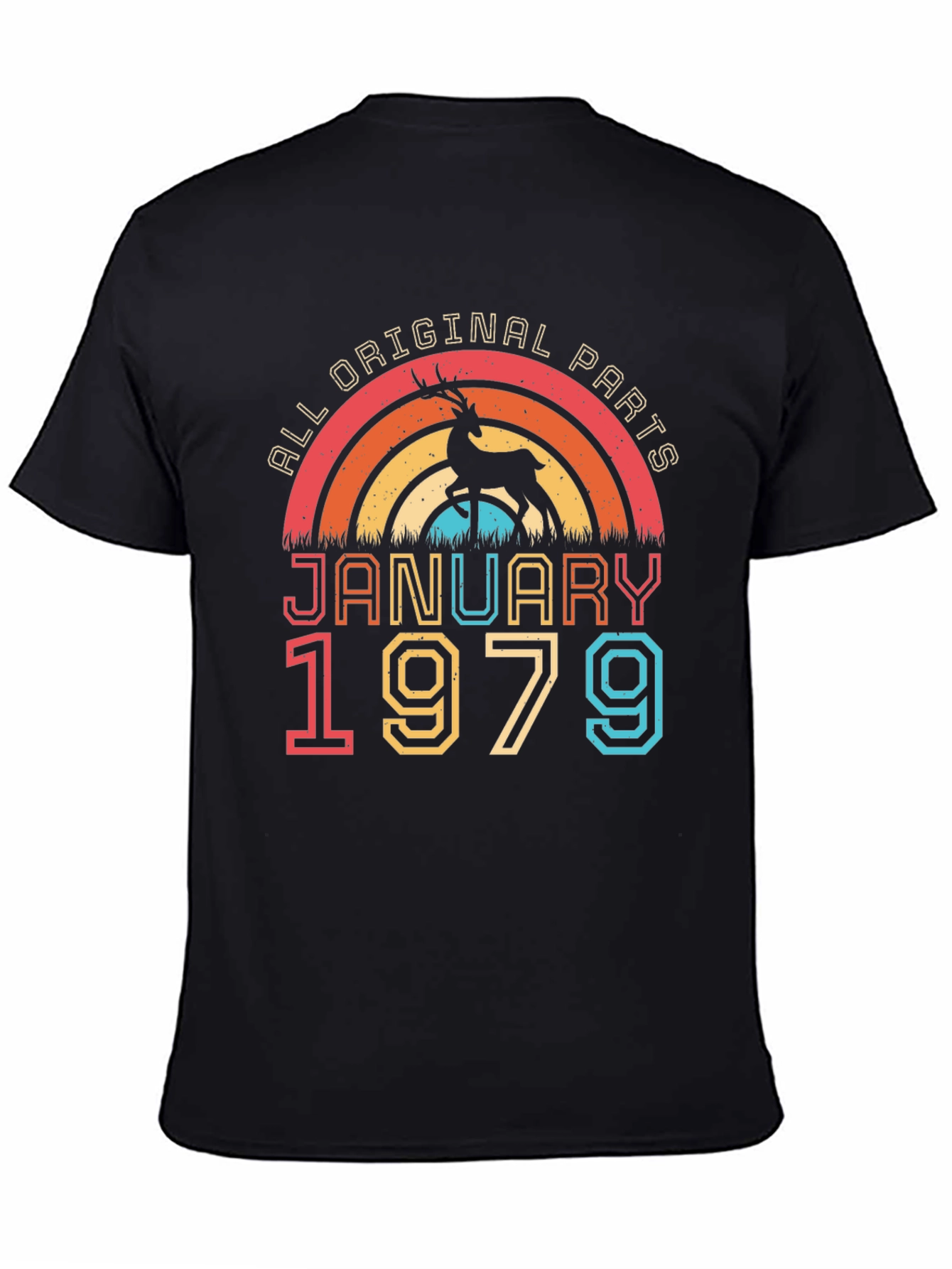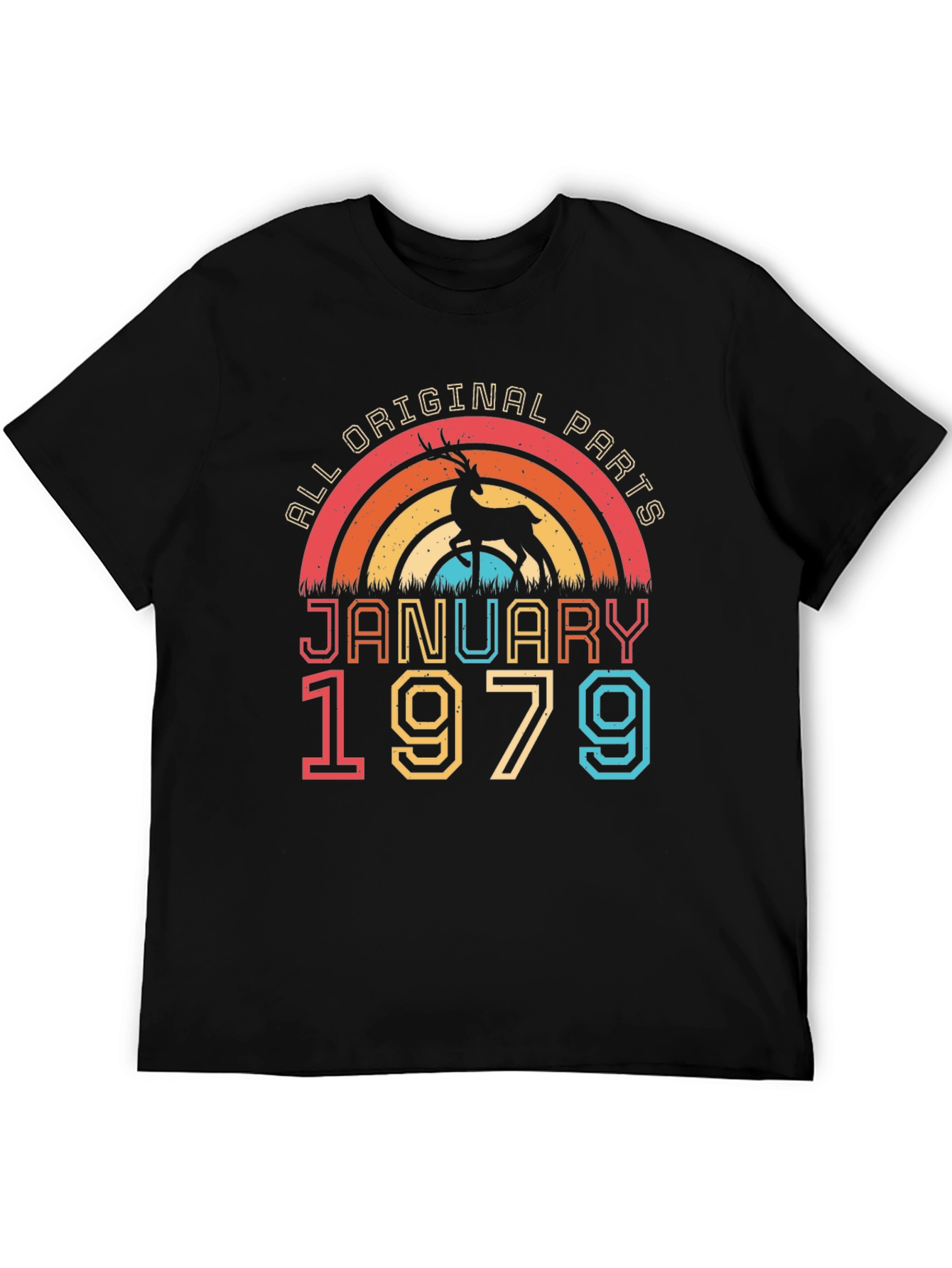 Celebrate a January 1979 birthday with this unique graphic tee! The design features a retro-style rainbow graphic with a deer silhouette. Above, the text "ALL ORIGINAL PARTS" adds a playful touch. The word "JANUARY" is printed in bold red above the number "1979" in yellow and turquoise. Made from a comfortable, breathable fabric, this tee is ideal for casual wear. It's a great birthday gift for those turning another year older in January or anyone who appreciates vintage designs with a sense of humor. Show off your birth year and embrace your original parts with this standout t-shirt!