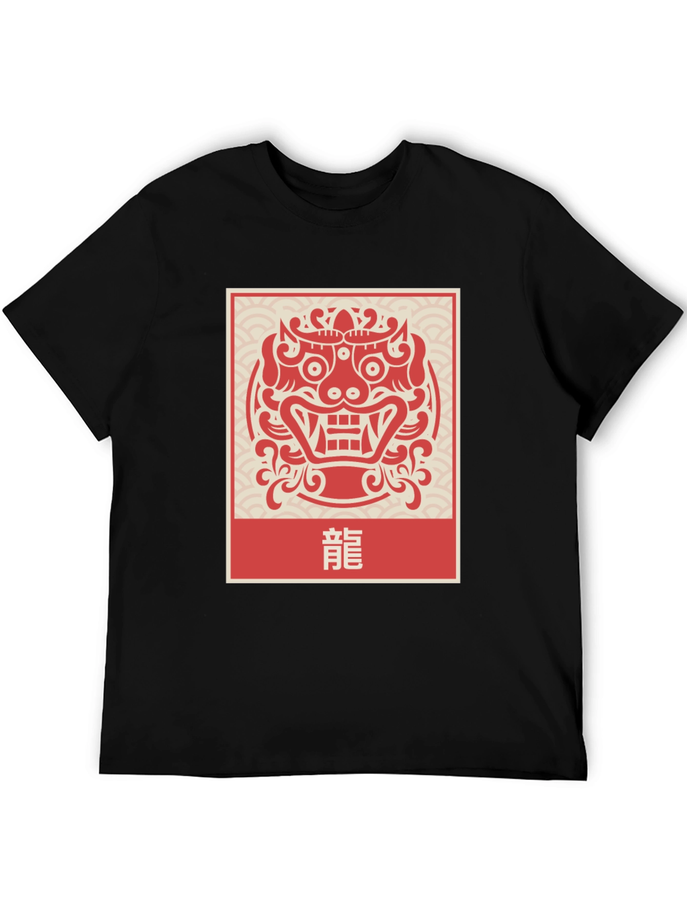 Embrace Eastern-inspired style with this eye-catching graphic tee. The design features a bold, red Japanese dragon mask emblem set against a subtle, decorative background and framed in a rectangle. The red Japanese character adds an authentic touch. Made from a comfortable, soft fabric, this tee is perfect for everyday wear. The simple black t-shirt highlights the beautiful graphic on the front. Pair this unique shirt with jeans or shorts for a relaxed, stylish look. Show off your appreciation for Japanese culture with this standout piece! Ideal for casual outings, themed events, or as a unique gift.
