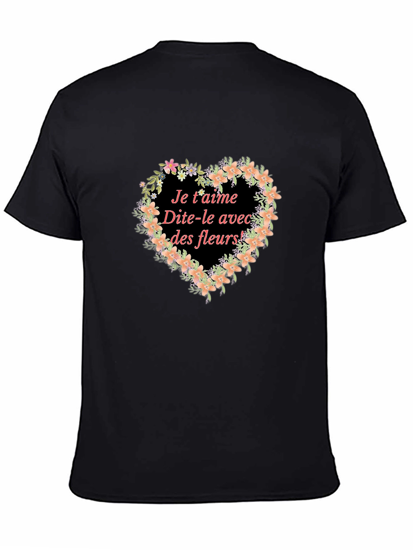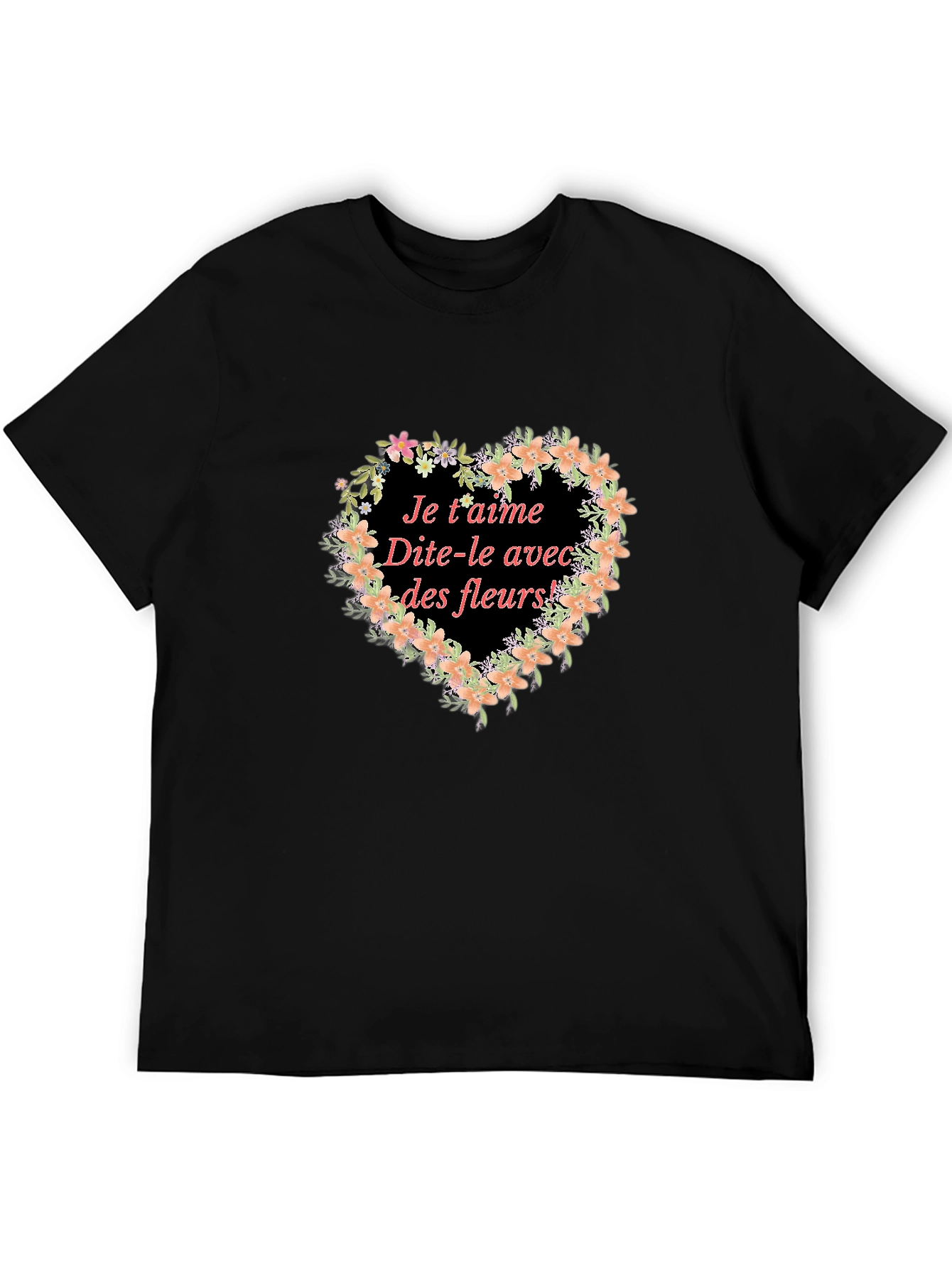 This stylish black t-shirt features a charming floral heart design. The graphic incorporates delicate peach flowers and lush green foliage, surrounding the French phrase "Je t'aime Dite-le avec des fleurs!" – a romantic message perfect for expressing your love. The t-shirt appears to be made from a soft, comfortable fabric, ideal for everyday wear. Dress it up or down; wear it casually with jeans or pair it with a skirt for a chic look. This unique piece adds a touch of romance to any wardrobe and makes a thoughtful gift. Show someone you care with this adorable floral tee.
