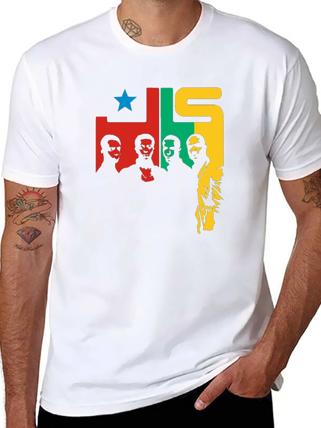 This striking black t-shirt features a bold and colorful graphic design. The graphic incorporates red, green, and yellow blocks with a blue star, alongside stylized silhouettes of people. Made from a soft, comfortable fabric, this tee is perfect for casual wear. Its classic crew neck design ensures a versatile fit for everyday styling. Show off your unique style with this eye-catching piece, ideal for music fans or anyone who appreciates unique graphic designs. Great for pairing with jeans, shorts, or joggers for a relaxed, trendy look.