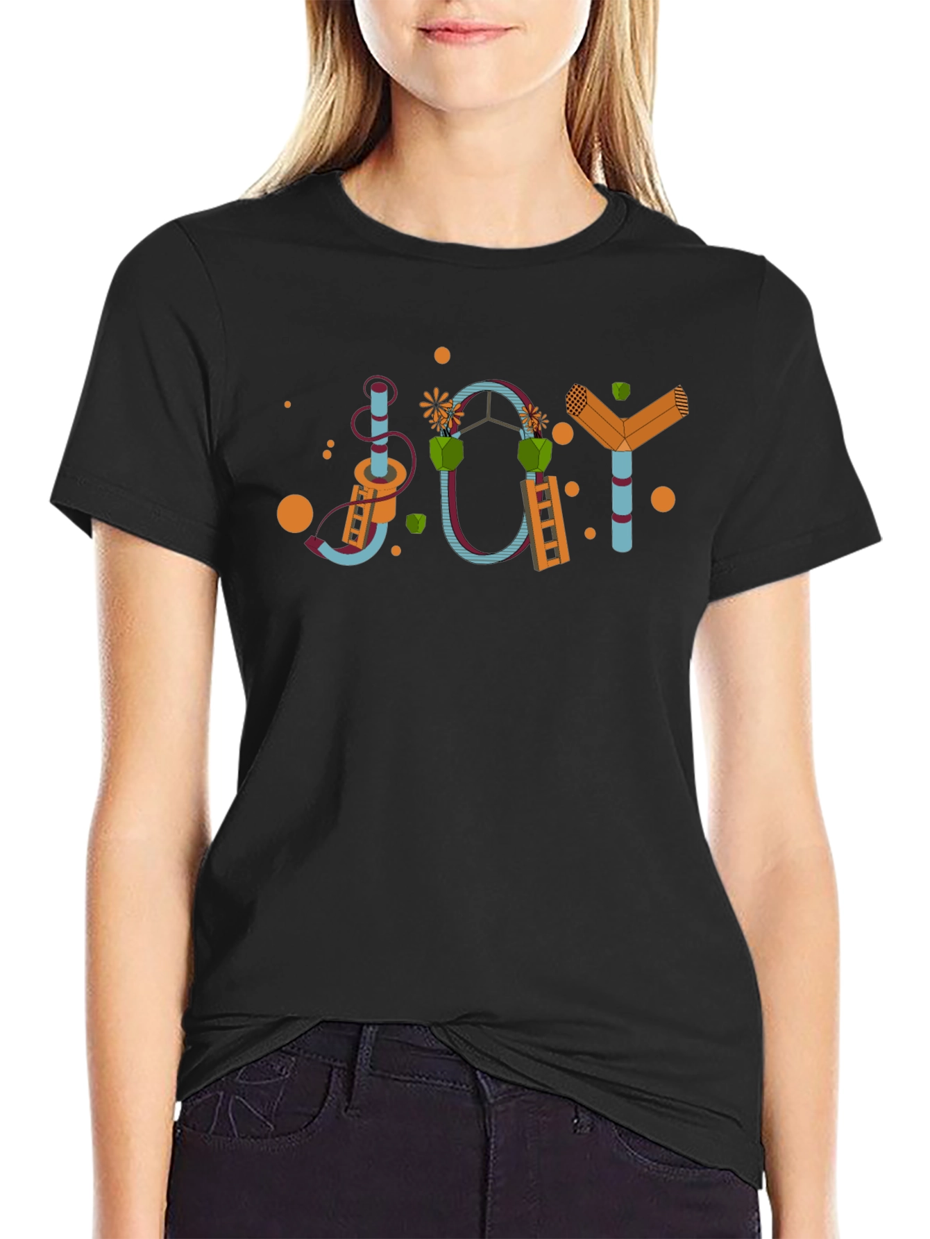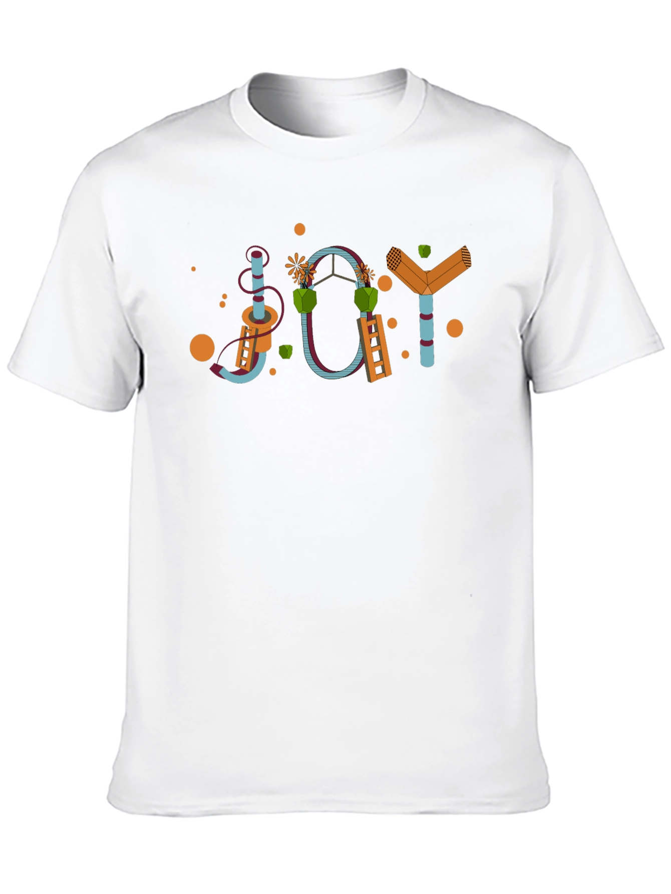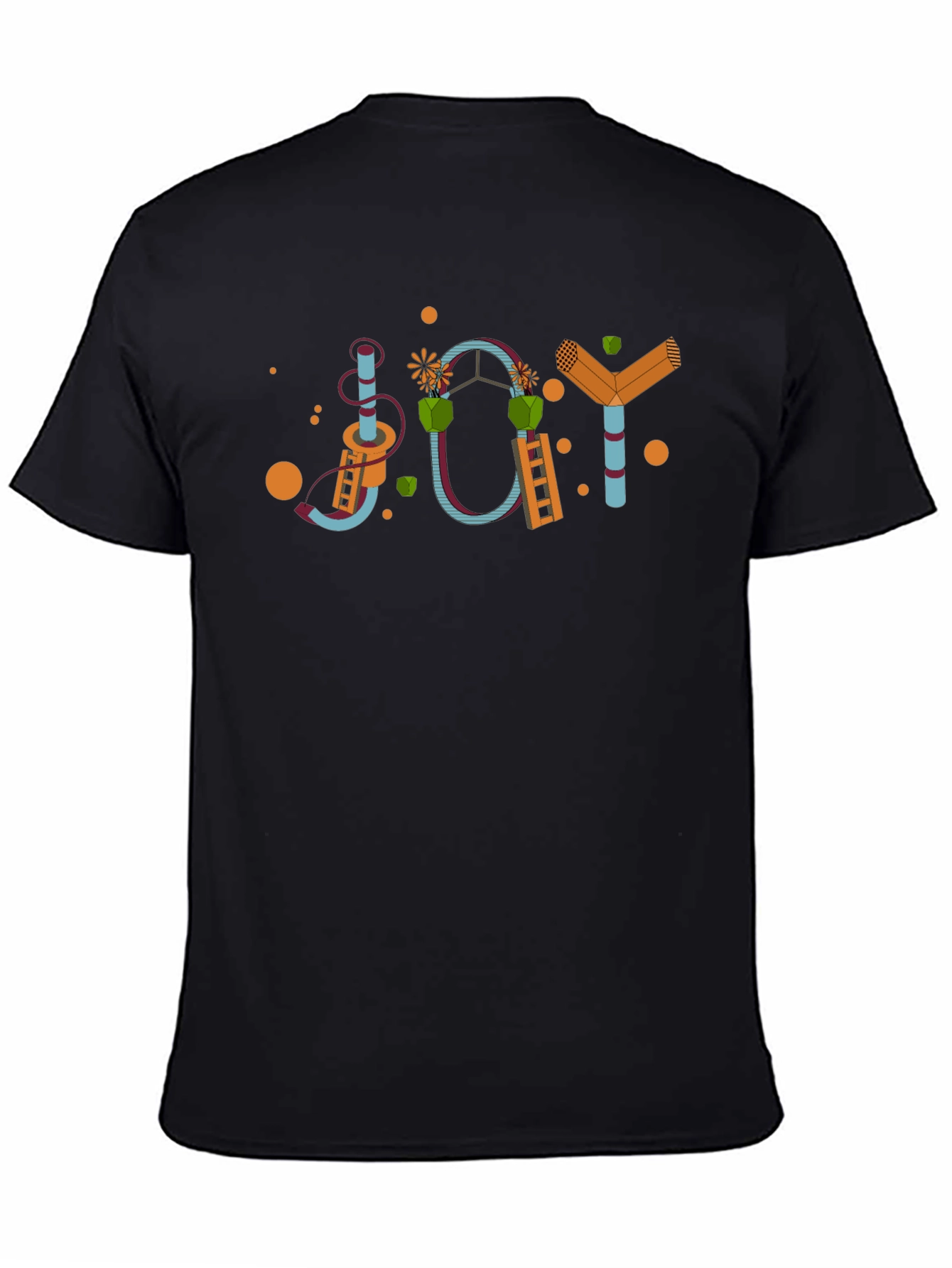 Embrace joyful vibes with this eye-catching black T-shirt. The shirt features a vibrant, abstract design of the word "Joy," rendered in a playful combination of geometric shapes, lines, and pops of color. The playful typography incorporates whimsical details, creating a visually stimulating and unique piece. Made from a soft and comfortable fabric, this tee is perfect for everyday wear. Show off your fun-loving personality, adding a touch of artistic flair to your casual style. Ideal for those who appreciate modern art and want to spread some happiness wherever they go.