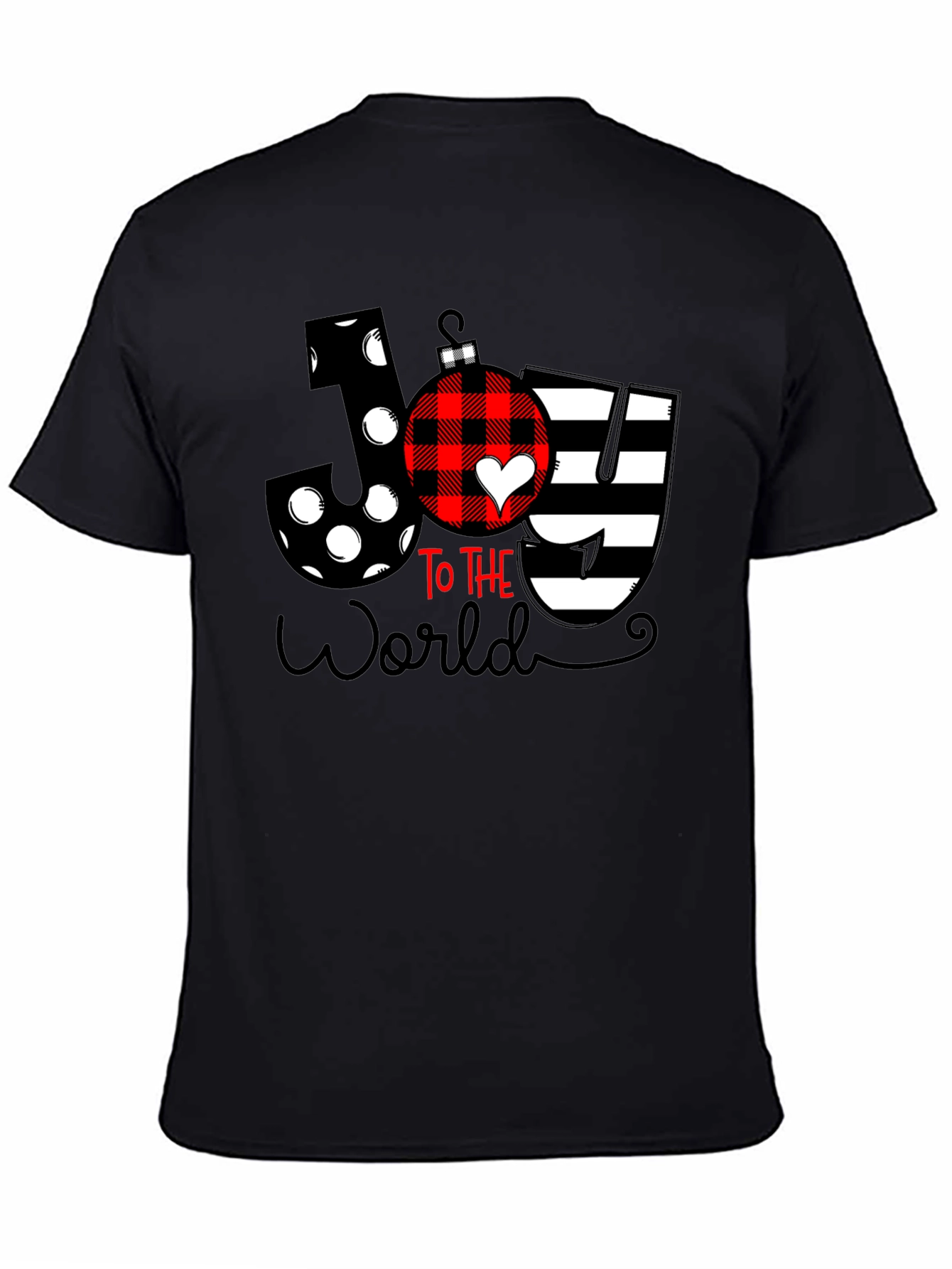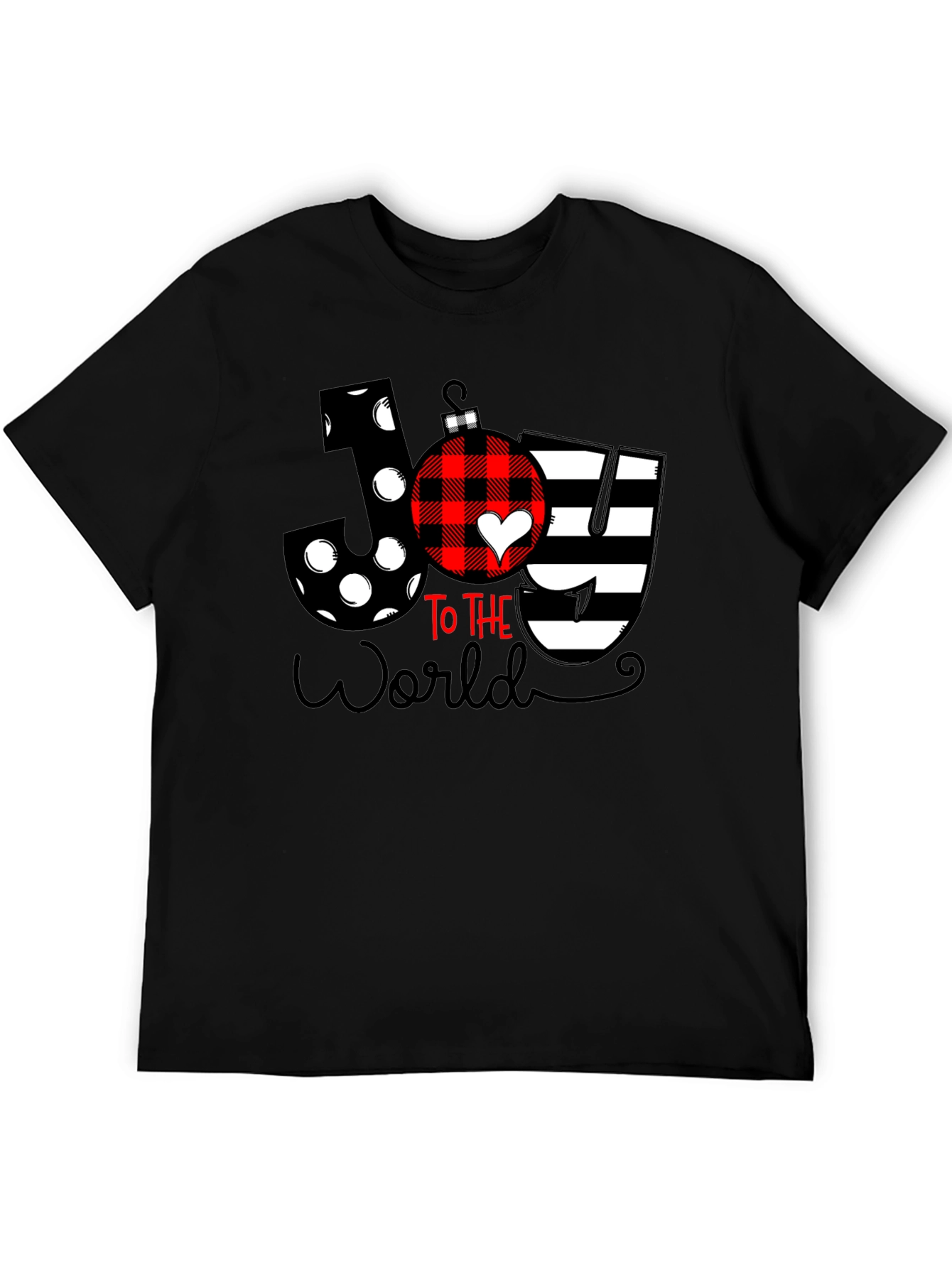 Spread holiday cheer with this festive "Joy To The World" T-shirt! The design features the word "Joy" with a unique pattern on each letter. The letter J is decorated with polka dots, the O is fashioned into a red and black plaid Christmas ornament with a white heart, and the Y has stylish black and white stripes. The phrase "To The World" is written in an elegant script below. This comfortable and stylish tee is perfect for Christmas parties, family gatherings, or simply showing off your holiday spirit!
