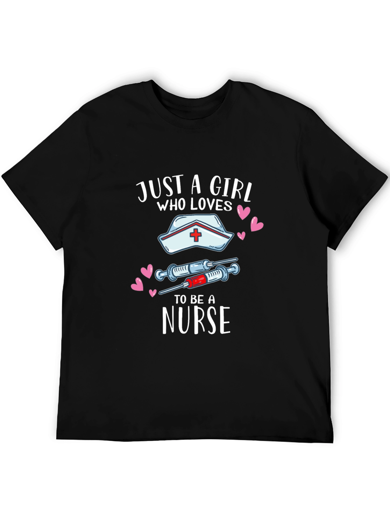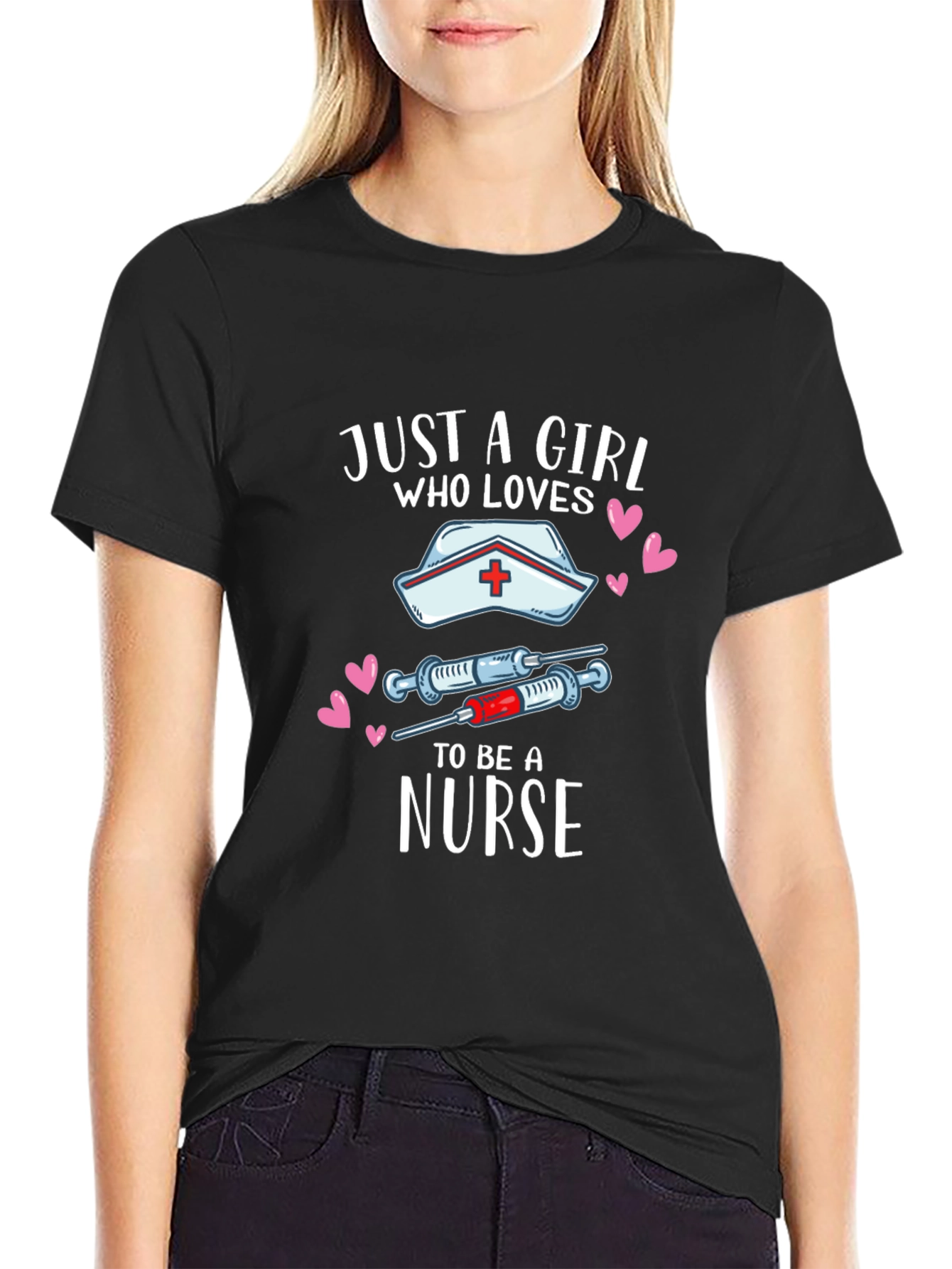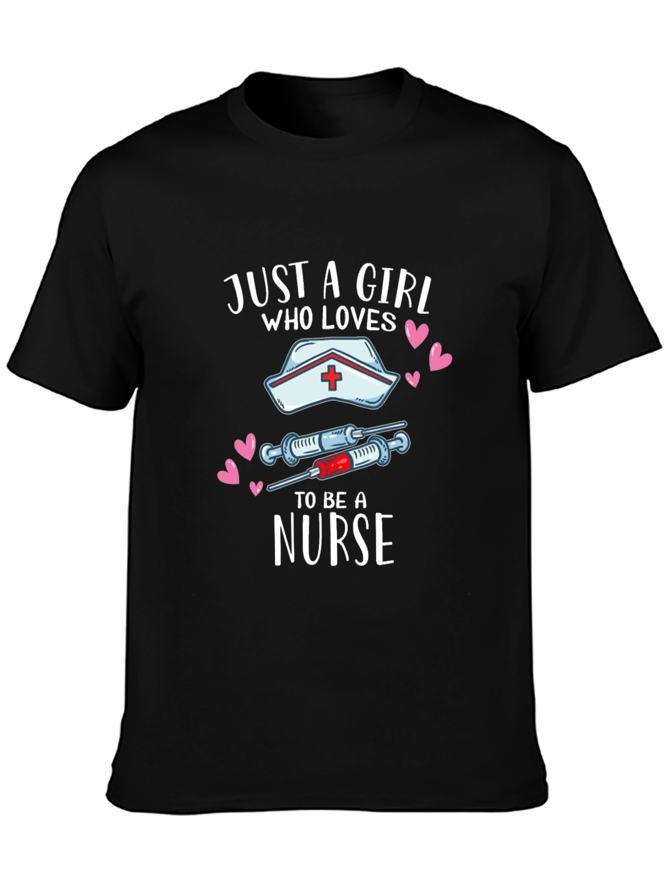 Show off your love for nursing with this adorable black graphic tee! The shirt features the phrase 'Just A Girl Who Loves To Be A Nurse' with a nurse cap, syringes, and pink hearts. This cute t-shirt is perfect for nurses, nursing students, or anyone who appreciates the care and dedication of healthcare professionals. This tee is made from comfortable materials, ensuring a soft and breathable fit all day long. Wear it to work, school, or casual outings to express your passion for nursing in a fun and stylish way.