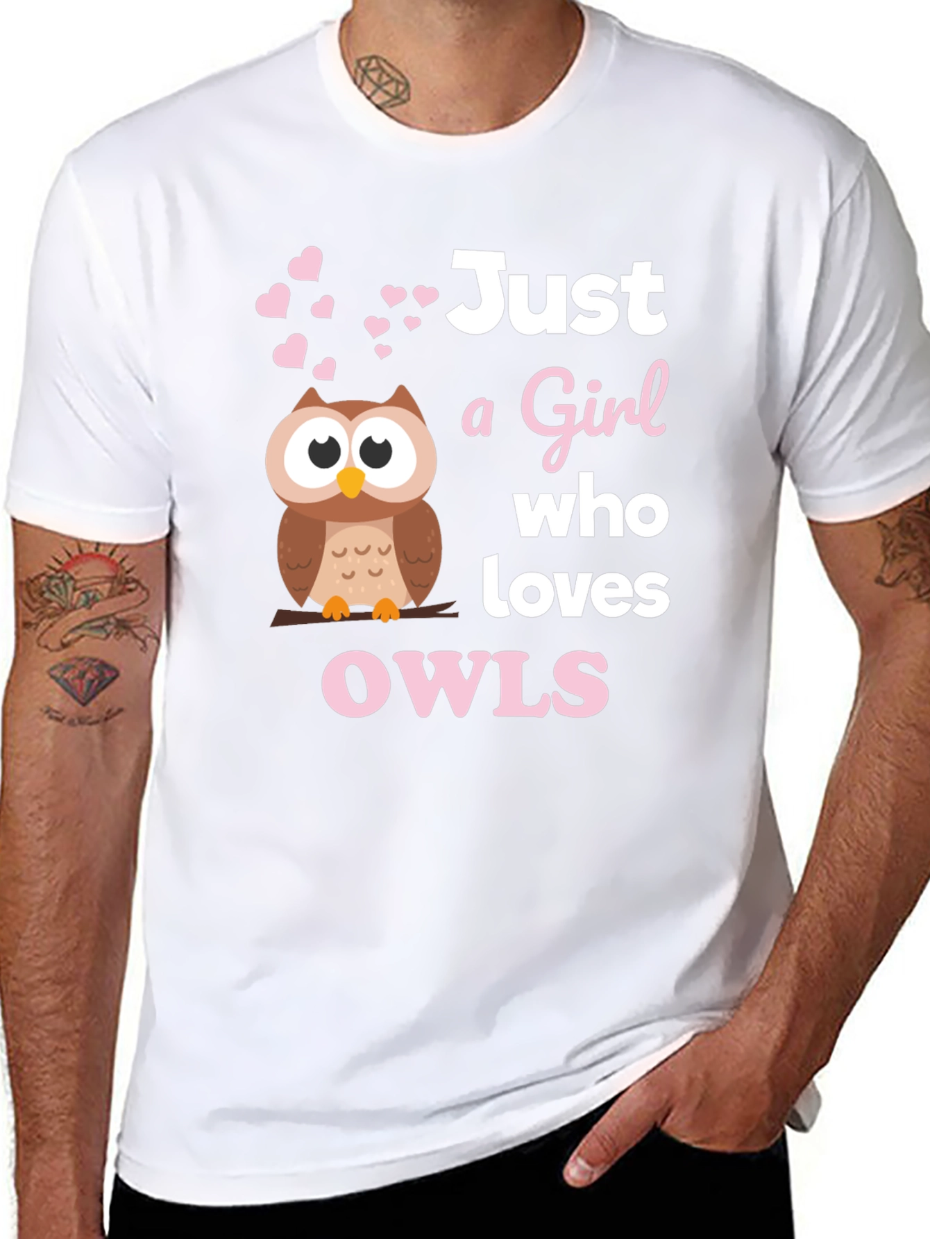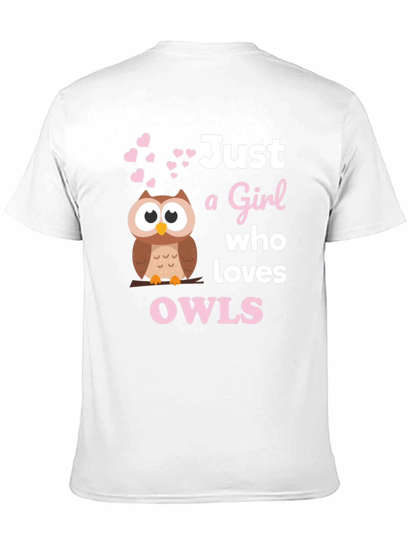 Show your love for owls with this adorable black T-shirt! Featuring a charming cartoon owl perched on a branch, surrounded by sweet pink hearts, this tee expresses your passion. The playful text, "Just a Girl who loves OWLS", is printed in white and pink, adding a pop of color to the design. Made from soft, breathable fabric, it's perfect for casual wear, lounging at home, or expressing your unique style. Makes a wonderful gift for the owl enthusiast in your life. Get yours today and let your love for owls shine!