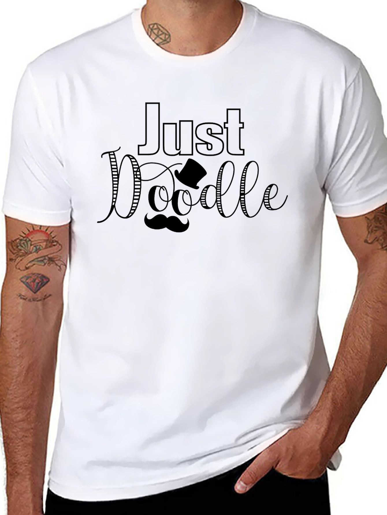 Show off your fun personality with the Just Doodle graphic tee! This stylish black t-shirt features a playful design with the word 'Doodle' accented by a whimsical mustache and top hat. Made from soft and comfortable fabric, this tee is perfect for casual wear, outings with friends, or expressing your creative side. The classic fit and crew neckline make it versatile for everyday styling. Pair it with jeans, shorts, or a skirt for an effortlessly cool look. Get ready to spark conversations and spread smiles wherever you go with this unique and eye-catching t-shirt!