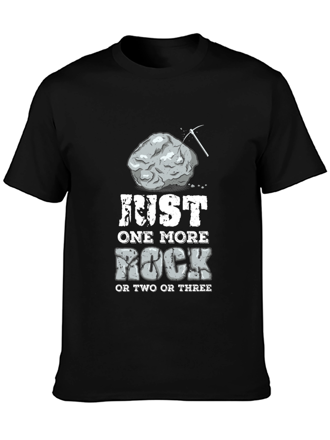 Show off your love for rocks and mining with this humorous graphic t-shirt. The black tee features a realistic-looking rock graphic with a pickaxe, accompanied by the witty saying "Just One More Rock or Two or Three". This shirt is perfect for geologists, miners, rockhounds, or anyone with a passion for earth science and a sense of humor. Made from what appears to be a soft and comfortable material, it's ideal for casual wear. Get ready to attract attention and spark conversations while wearing this unique and fun t-shirt.