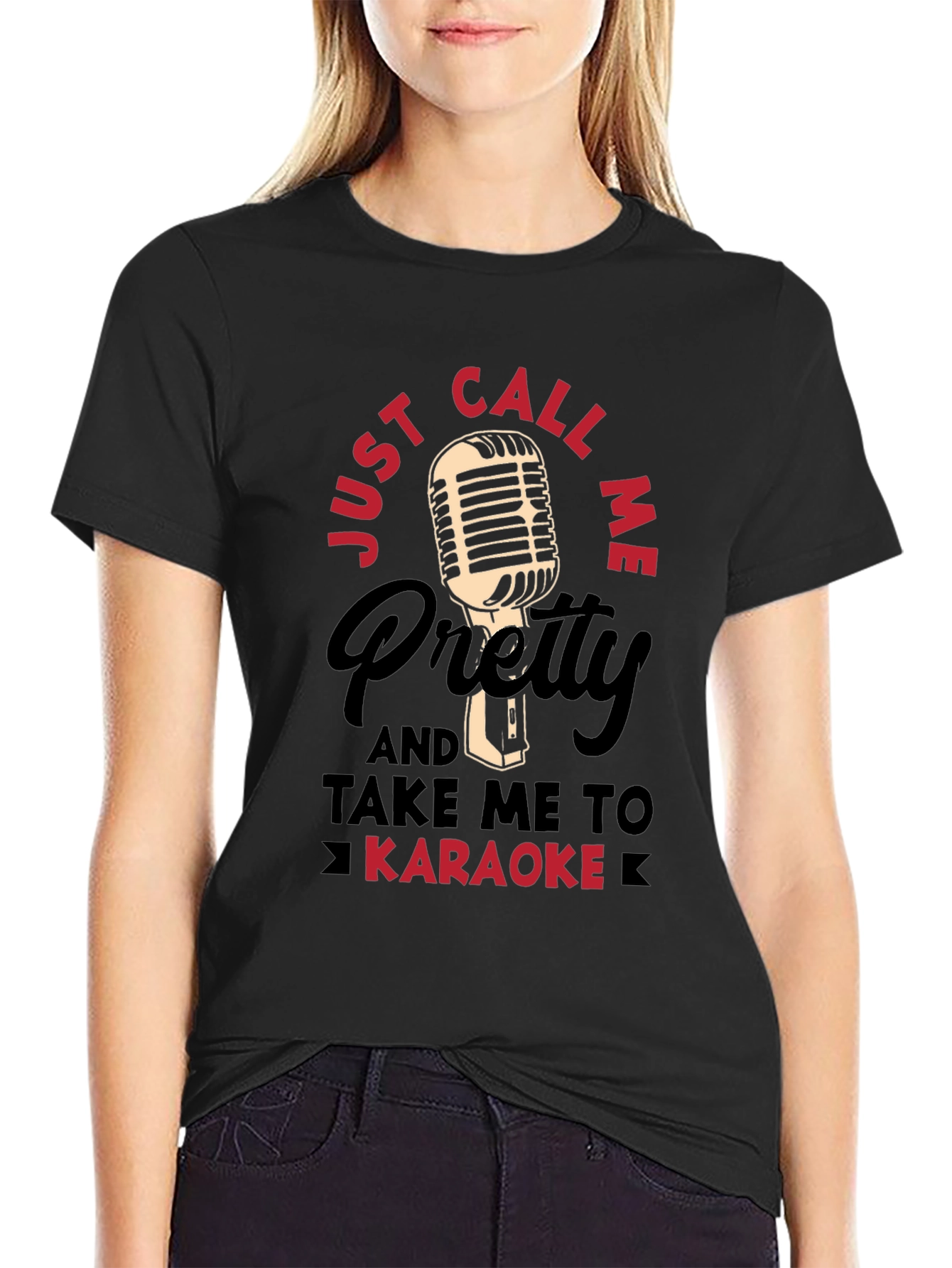 Rock the stage with this fun and stylish black t-shirt! Featuring a vintage-style microphone graphic and the playful text "Just Call Me Pretty AND Take Me To KARAOKE," this tee is perfect for karaoke enthusiasts and performers alike. The design is printed with eye-catching red accents that add to the shirt's playful appeal. Made from a comfortable, breathable fabric, this t-shirt is ideal for a night out singing your favorite tunes or for casual everyday wear. Grab yours today and get ready to steal the show!