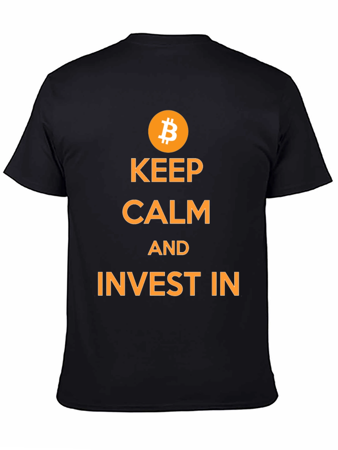 Show your love for cryptocurrency with this stylish black t-shirt. The shirt features a prominent Bitcoin logo above the phrase "KEEP CALM AND INVEST IN" in bold orange lettering. Made from a comfortable-looking cotton blend, this tee is perfect for casual wear, crypto meetups, or as a statement piece to express your financial interests. Wear it to spark conversations and attract like-minded individuals. A great addition to any crypto enthusiast's wardrobe!