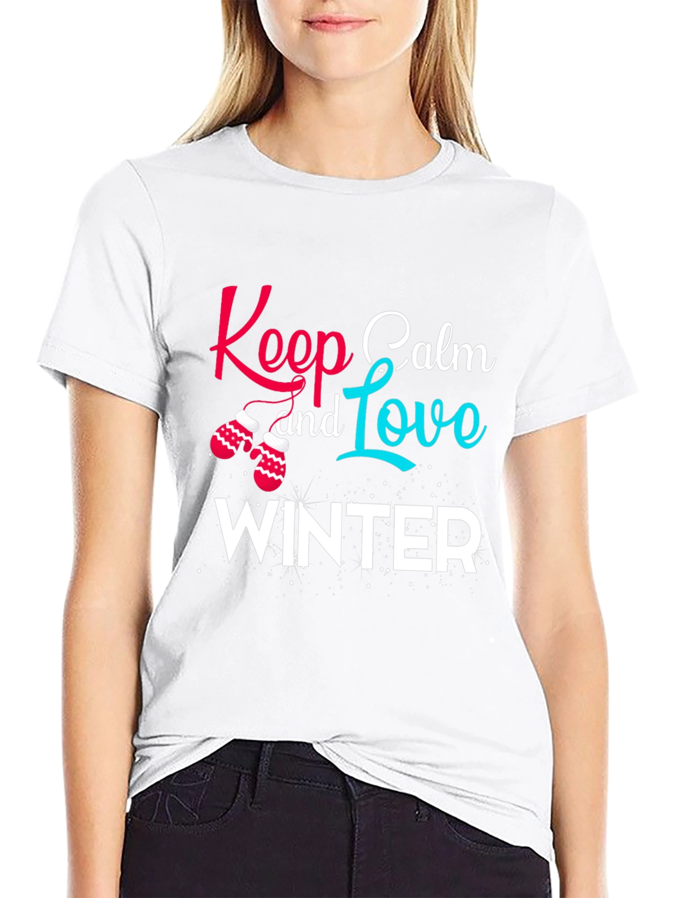 Embrace the winter season in style with this charming graphic tee! The design features the playful phrase "Keep Calm and Love Winter" in a mix of eye-catching fonts and colors, including festive red and cool turquoise. Adorable red mittens add a touch of whimsy, perfect for the holidays or everyday wear. Made from a comfortable-looking black fabric, this tee is ideal for casual outings, cozy nights in, or as a thoughtful gift for the winter enthusiast in your life. Spread the winter cheer with this unique and stylish t-shirt!