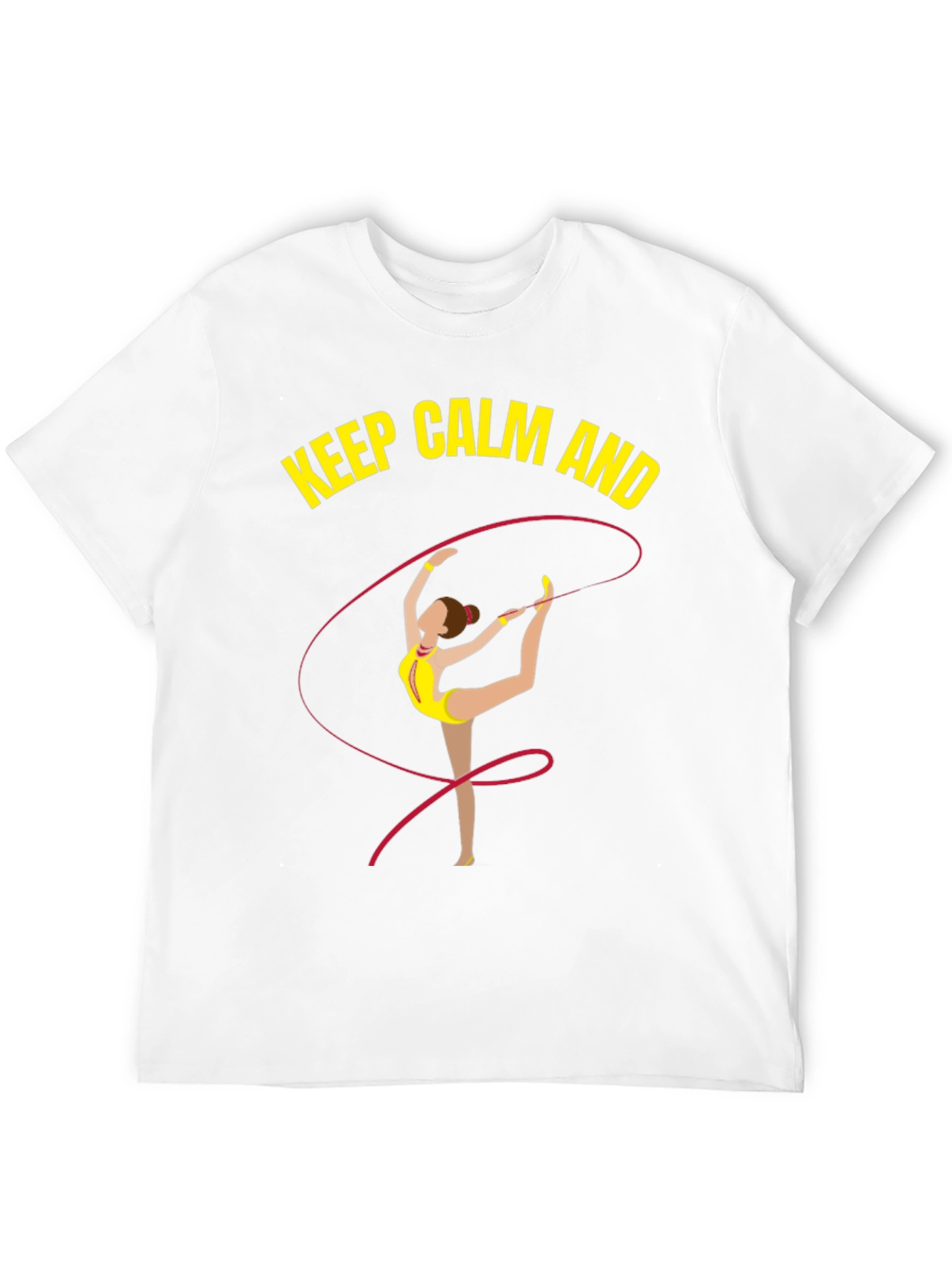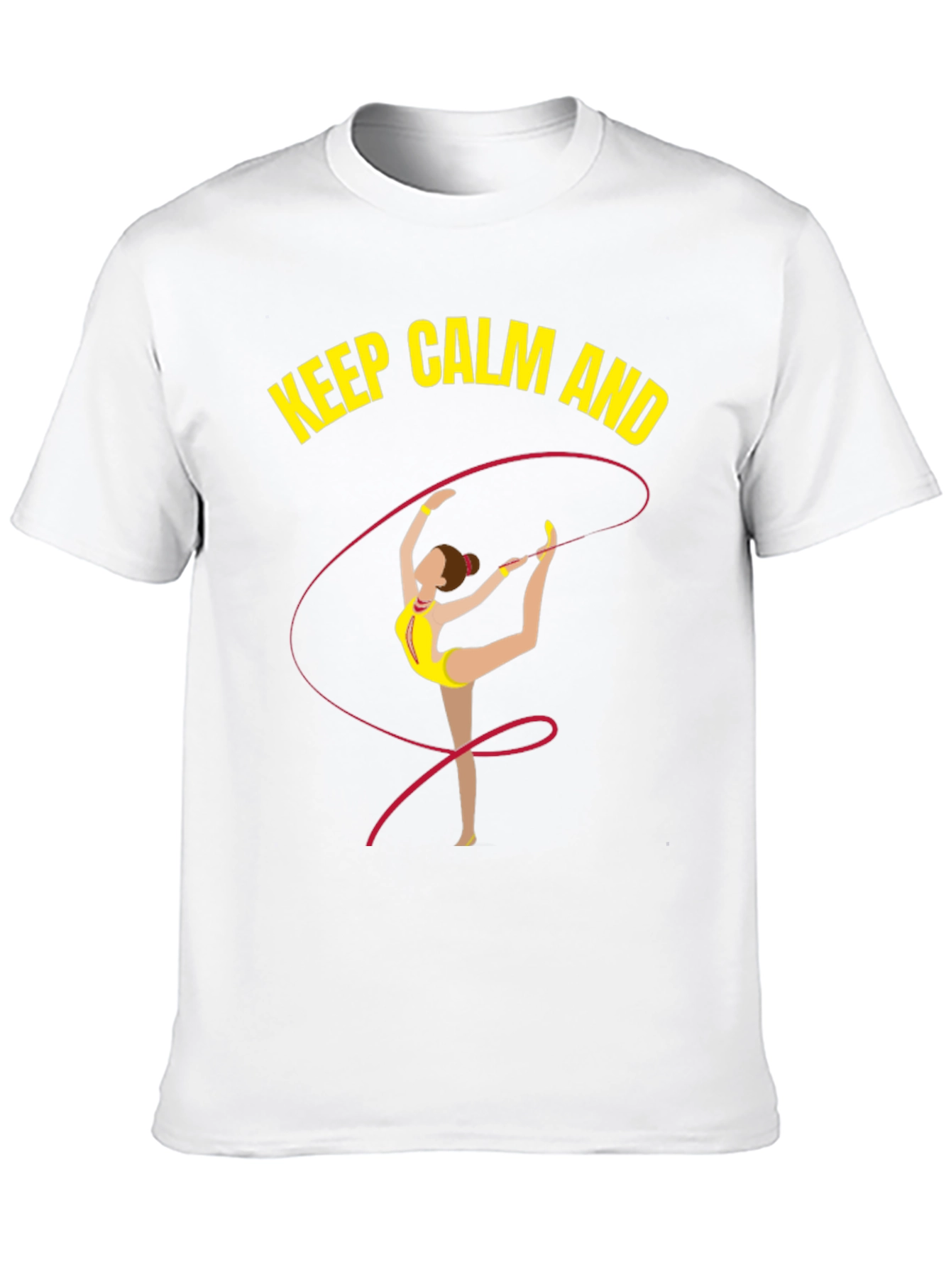 Show off your love for gymnastics with this stylish black T-shirt. Featuring a vibrant graphic of a gymnast gracefully performing with a ribbon, this shirt is perfect for athletes and fans alike. The bold yellow 'Keep Calm and' text adds a touch of humor and motivation. Made from a comfortable material, this tee is great for casual wear, workouts, or showing your support at competitions. Express your passion for gymnastics with this eye-catching and unique design. A must-have for any gymnastics enthusiast's wardrobe!