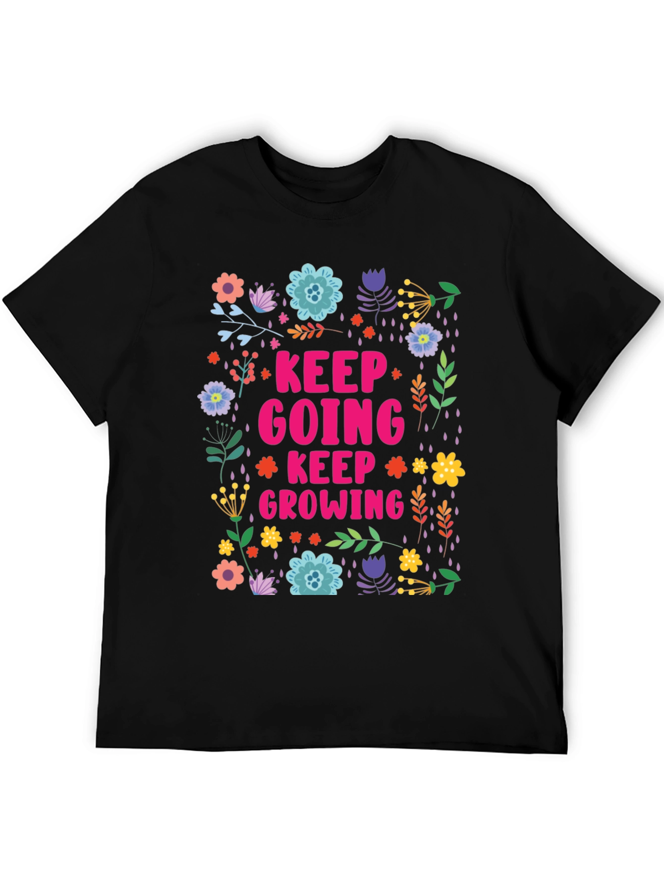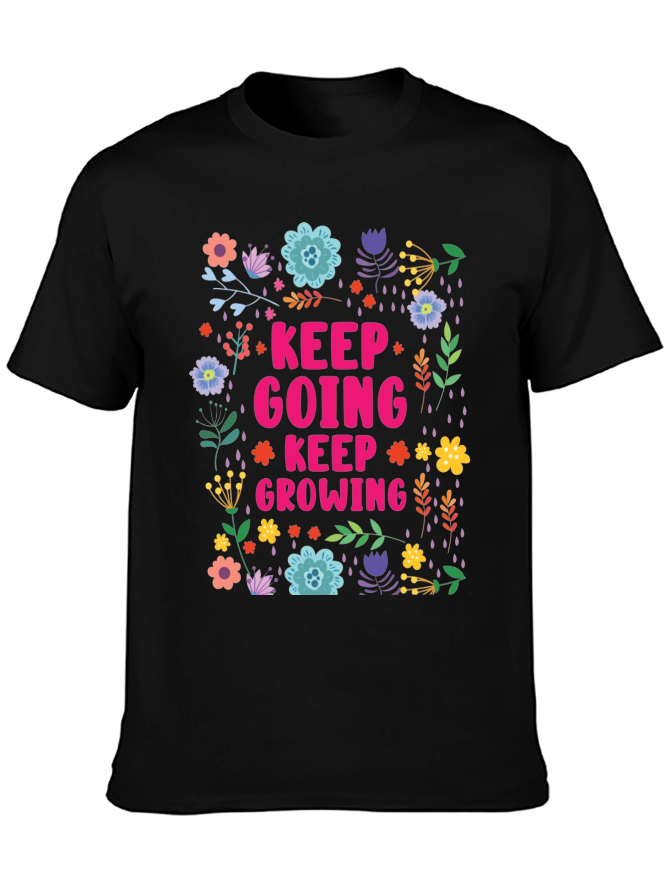 This vibrant black t-shirt features a colorful floral design surrounding the motivational text "KEEP GOING KEEP GROWING" in a playful, eye-catching pink font. The design is framed by an assortment of flowers, leaves, and decorative elements in shades of blue, yellow, orange, and purple. Made from a comfortable-looking fabric, this shirt is perfect for adding a pop of positivity to your casual wardrobe. Ideal for everyday wear, this t-shirt is a stylish way to express an upbeat attitude. Pair it with jeans, shorts, or a skirt for a fun and casual look. Whether you're running errands, meeting friends, or just relaxing at home, this t-shirt will keep you feeling inspired and looking great.
