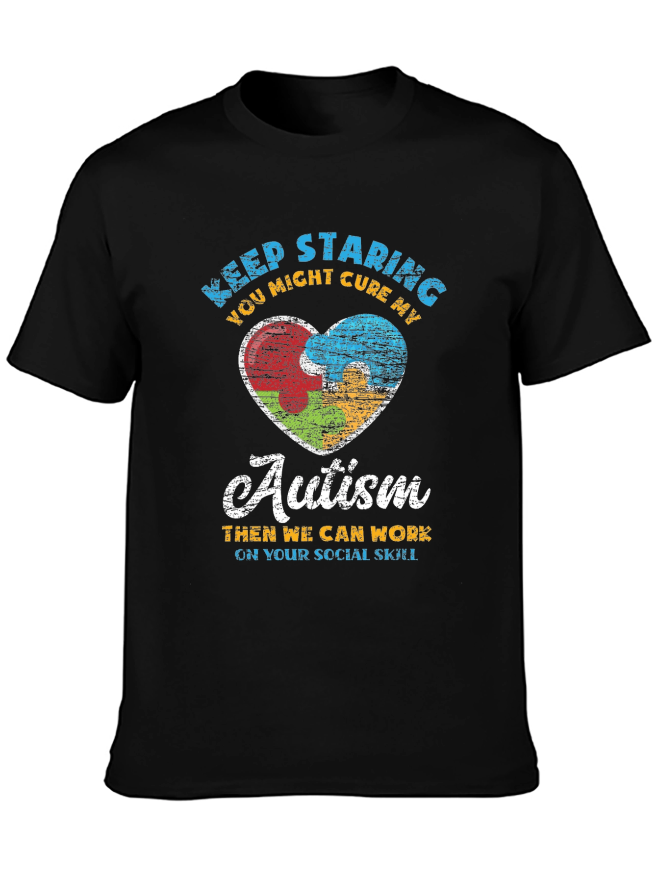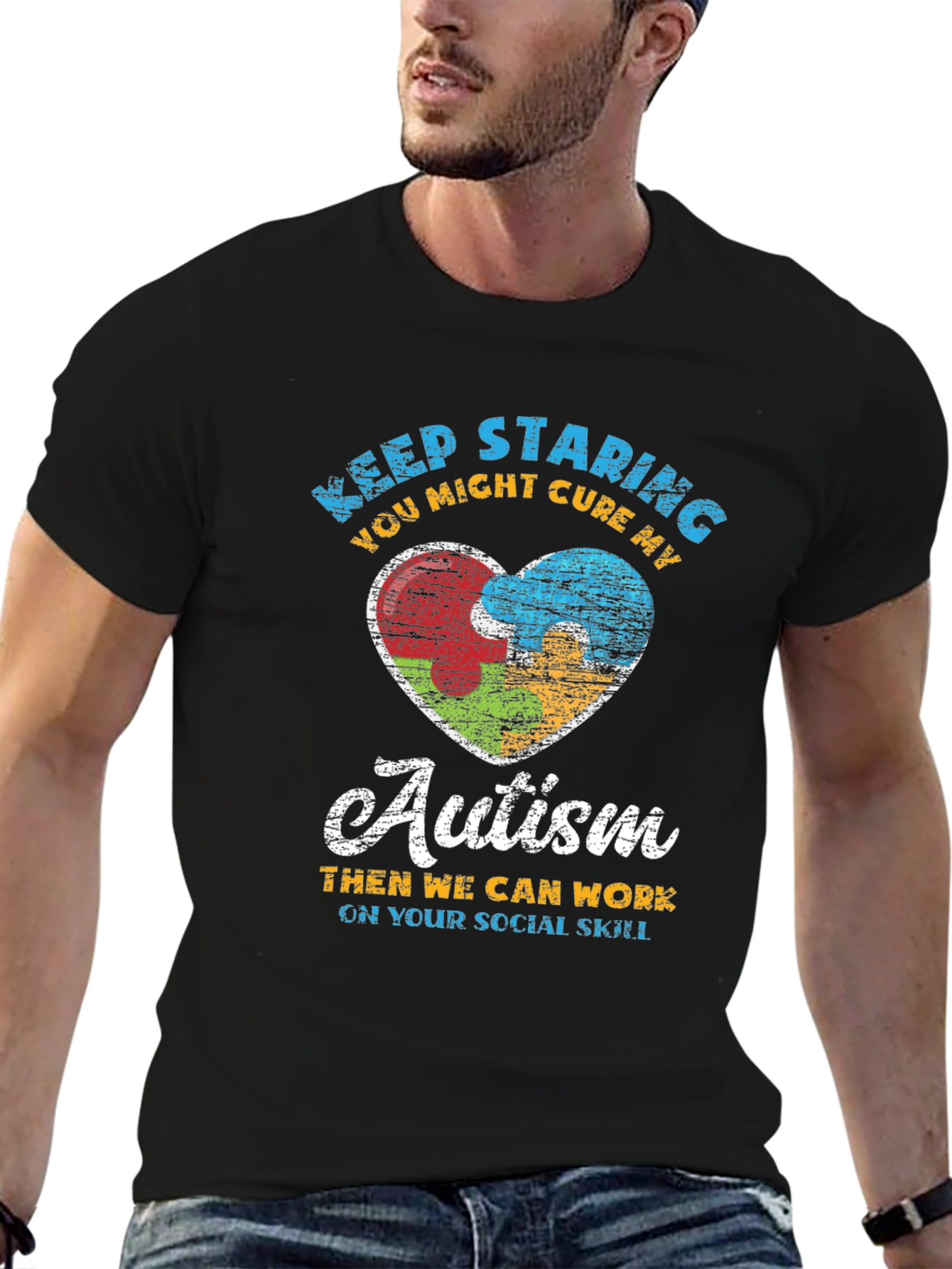 Show your support with this stylish black t-shirt featuring a unique autism awareness design. The shirt displays colorful puzzle pieces forming a heart, symbolizing unity and understanding. The humorous slogan "Keep Staring, You Might Cure My Autism" adds a touch of wit, while promoting acceptance. Made from a comfortable and durable fabric, this tee is perfect for everyday wear, autism walks, and awareness events. Let your fashion make a statement and spark meaningful conversations about autism acceptance and inclusion.