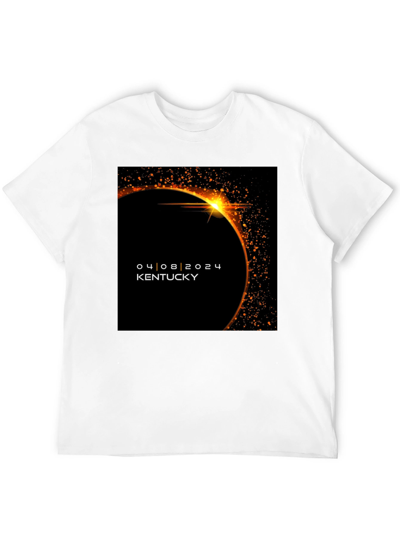 Celebrate the 2024 solar eclipse with this commemorative black t-shirt. The design features a vibrant graphic of the eclipse, complete with a bright solar flare effect. The date, 04|08|2024, and the location, Kentucky, are prominently displayed, making it a perfect souvenir for those who witnessed the event in Kentucky. Made from comfortable, breathable fabric, this t-shirt is ideal for everyday wear or as a unique collectible item. Show off your eclipse experience with this stylish and memorable tee!