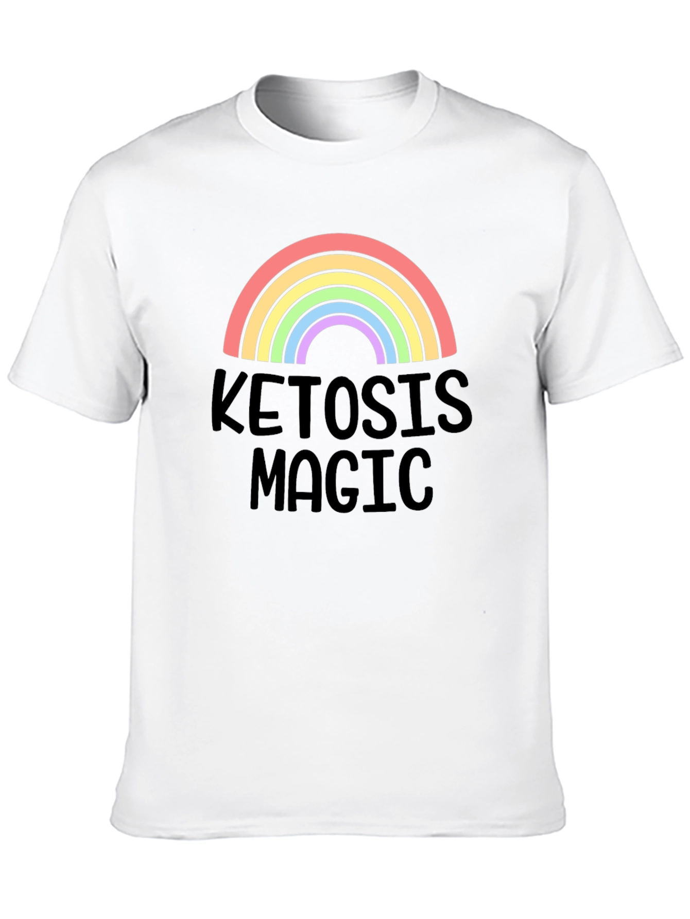 Embrace the magic of ketosis with this eye-catching graphic t-shirt. This black tee features a vibrant rainbow design above the words "KETOSIS MAGIC" in a playful font. Made from what appears to be a soft, comfortable cotton blend, this shirt is perfect for casual wear and showing off your healthy lifestyle. Ideal for keto enthusiasts, gym-goers, or anyone who loves a fun and colorful statement piece. This shirt is sure to spark conversations and bring a smile to anyone's face. A must-have addition to your wardrobe!