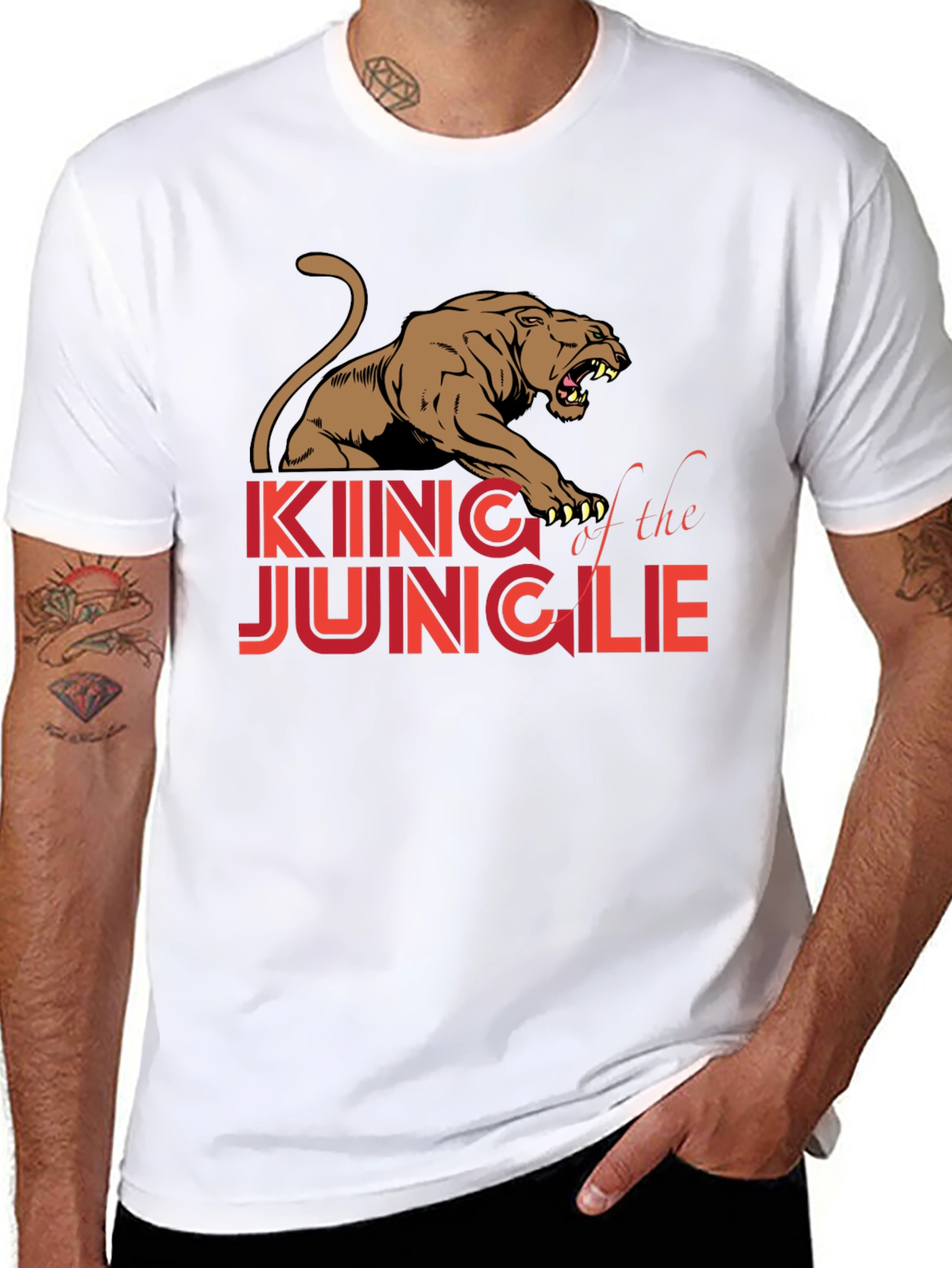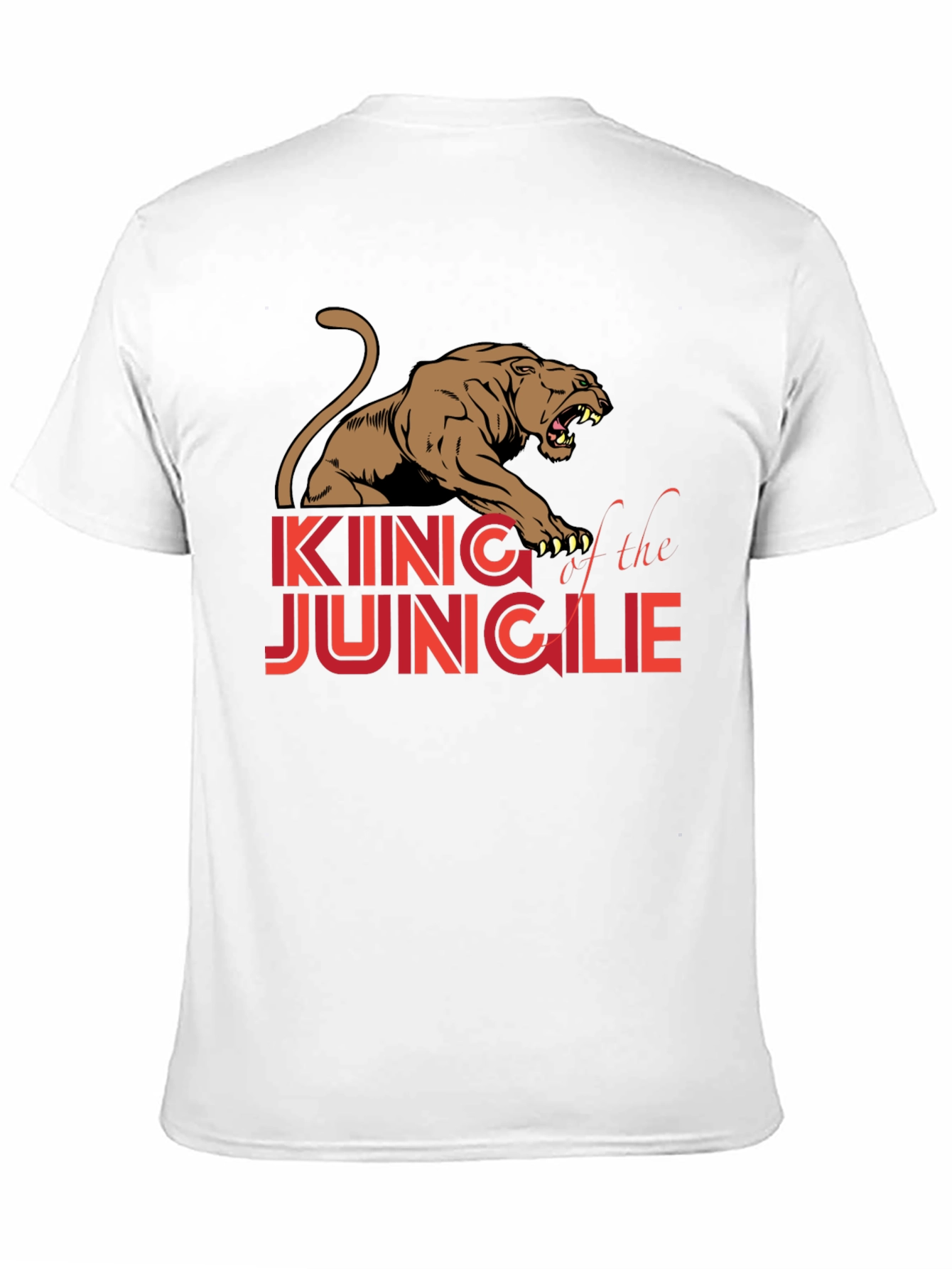Show off your wild side with this eye-catching black t-shirt! Featuring a bold graphic design of a roaring lion with the words 'King of the Jungle' in a striking red and orange font, this tee is sure to turn heads. The design offers a vintage look. Made from what appears to be a comfortable cotton blend, this shirt is perfect for casual wear, hitting the gym, or making a statement wherever you go. Pair it with your favorite jeans or shorts for a cool, relaxed look. Unleash your inner animal!
