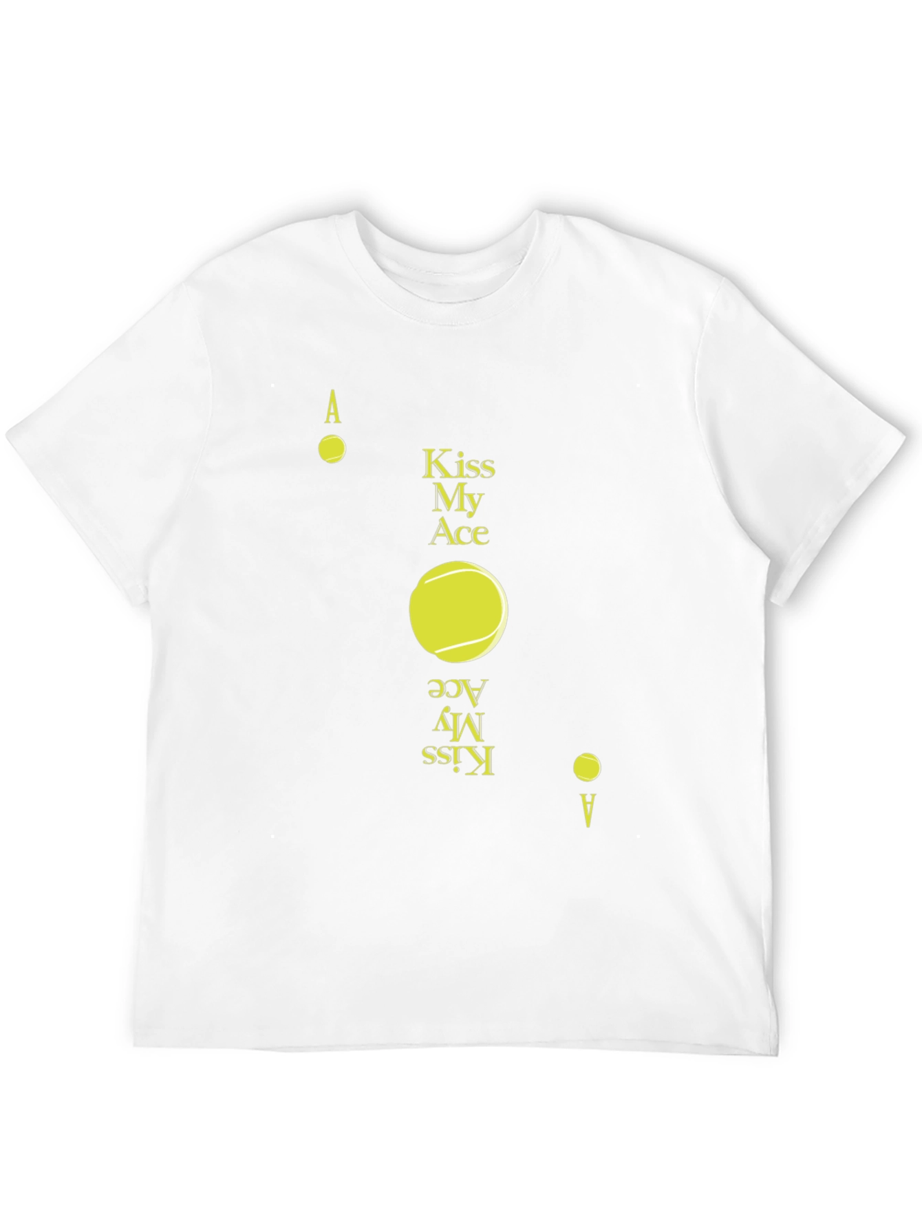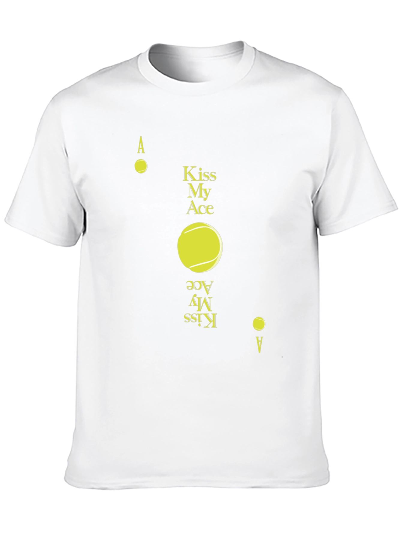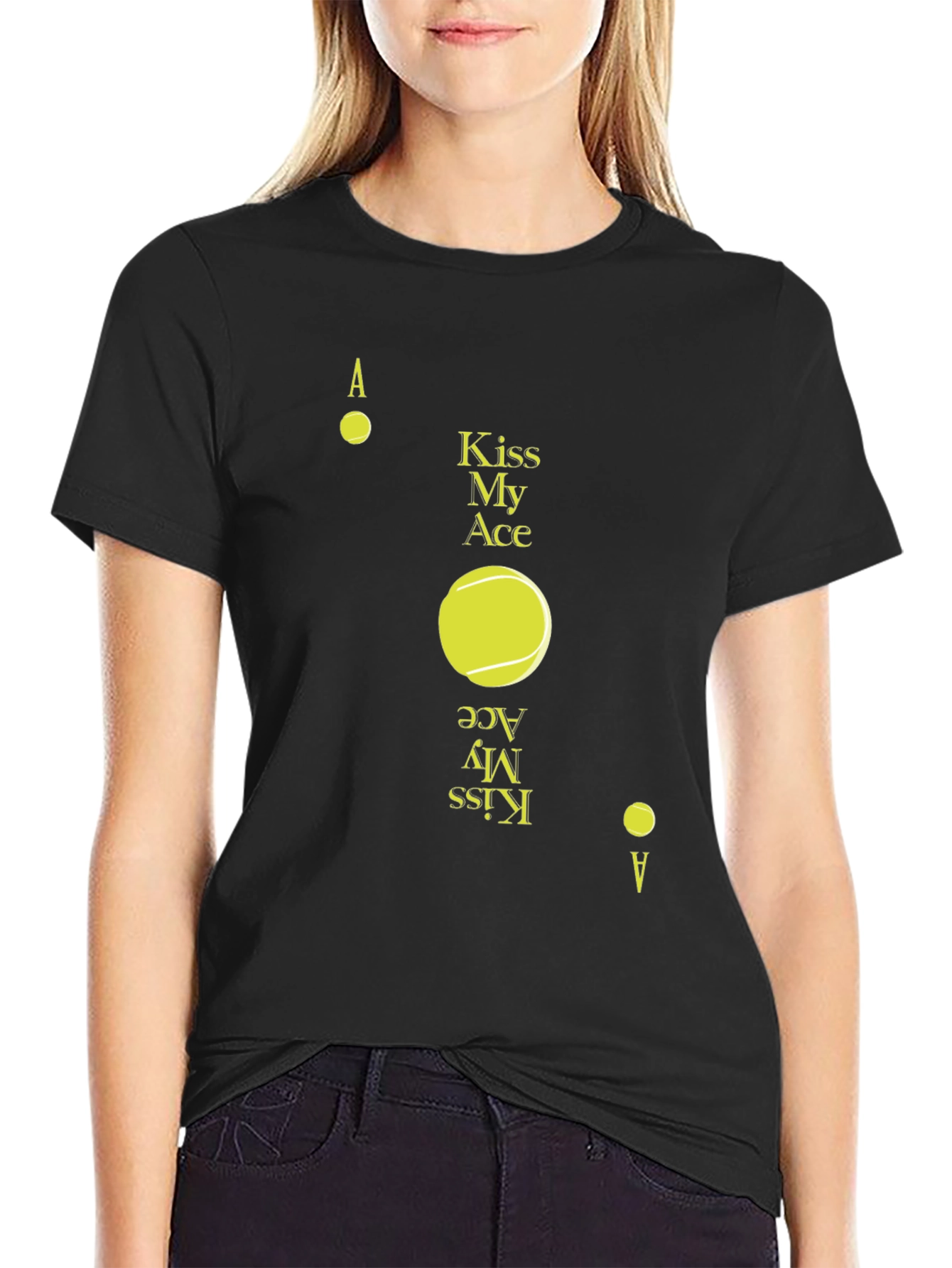 Serve up some style with this unique black t-shirt featuring a clever "Kiss My Ace" design. The graphic incorporates a tennis ball in place of the "O" in Ace, along with Ace and A symbols, creating a fun and sporty look. Perfect for tennis enthusiasts who want to make a statement on and off the court. Made from a comfortable, breathable fabric, this tee is ideal for casual wear, practice sessions, or cheering from the sidelines. Show off your love for the game with this eye-catching design!
