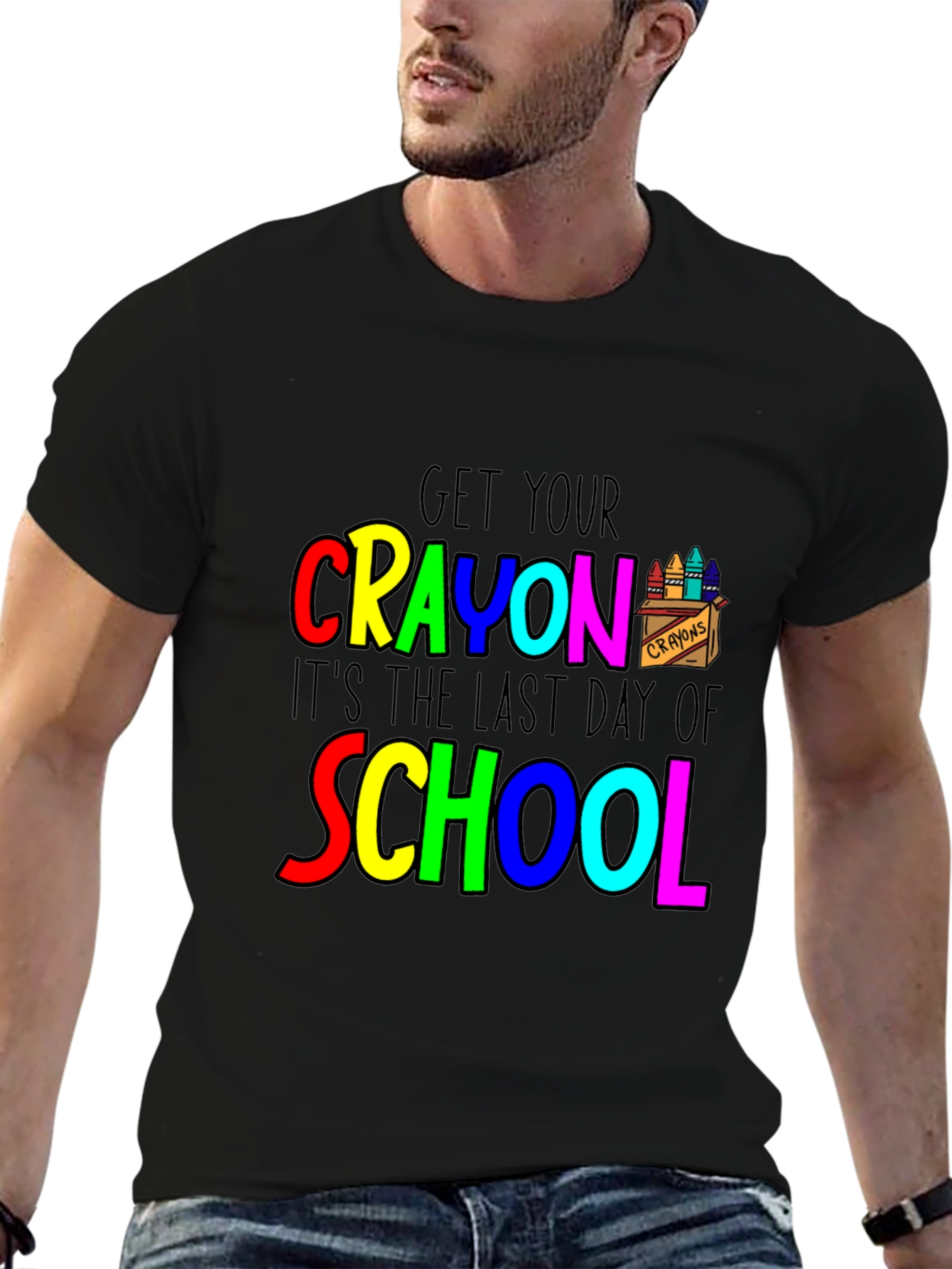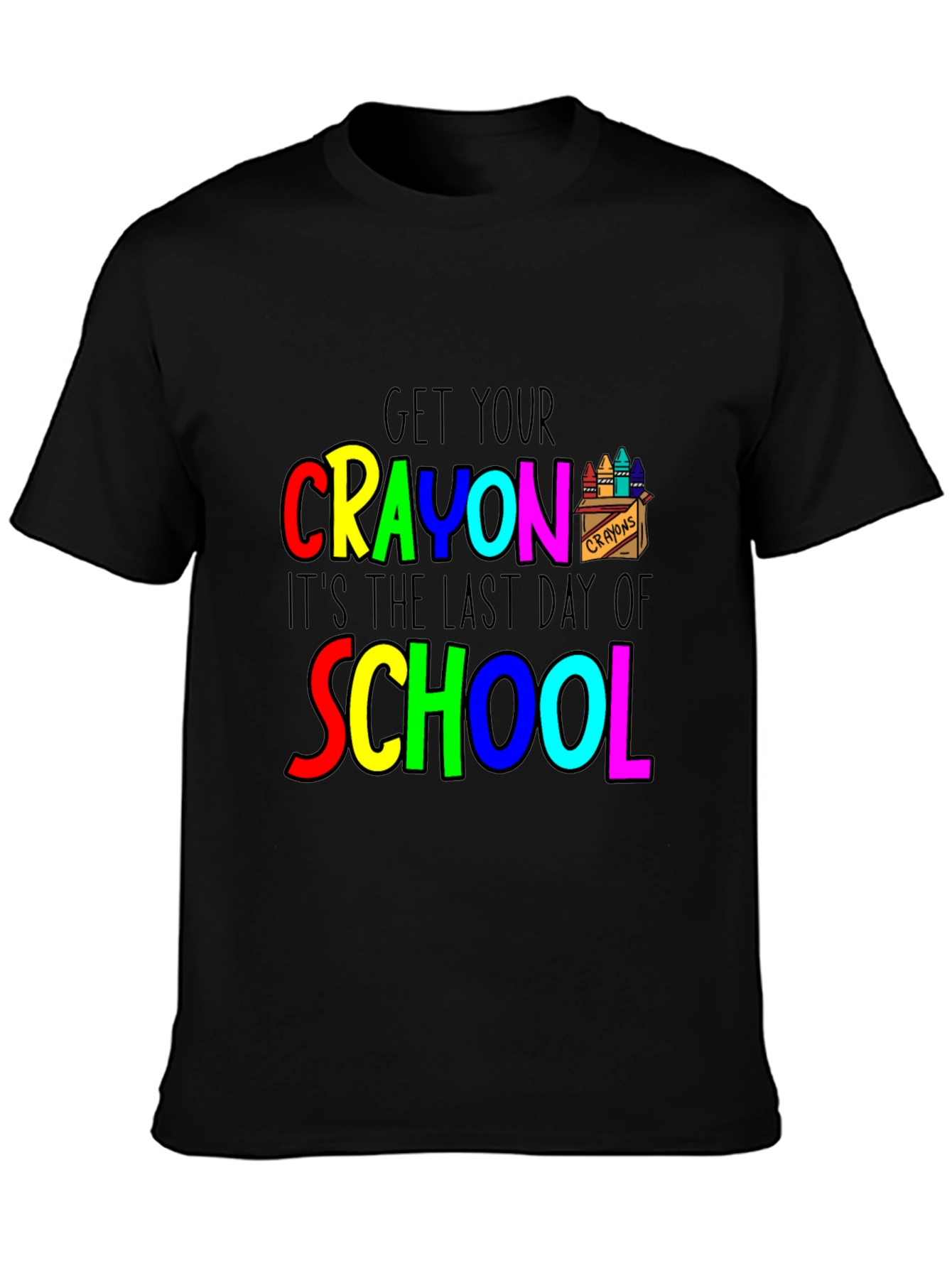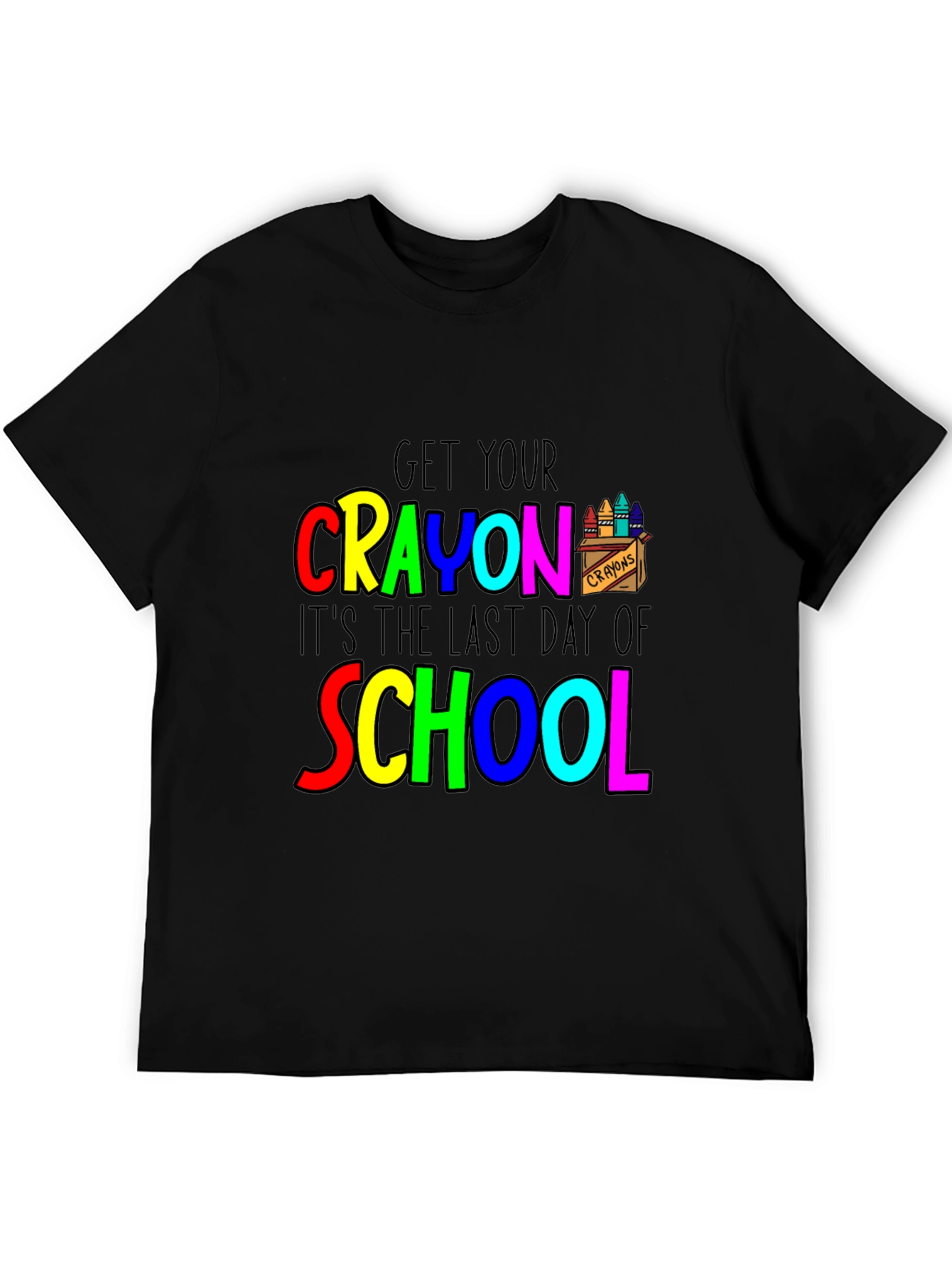 Celebrate the end of the school year with this fun and vibrant black t-shirt. Featuring a colorful design that says "Get Your Crayon, It's the Last Day of School" using red, yellow, green, blue, and pink lettering. This tee is perfect for teachers, students, or anyone ready to celebrate summer vacation. The crayon graphic adds a playful touch. Made from comfortable materials, it's ideal for casual wear and end-of-year parties. Show off your excitement for the school year coming to an end with this eye-catching shirt!