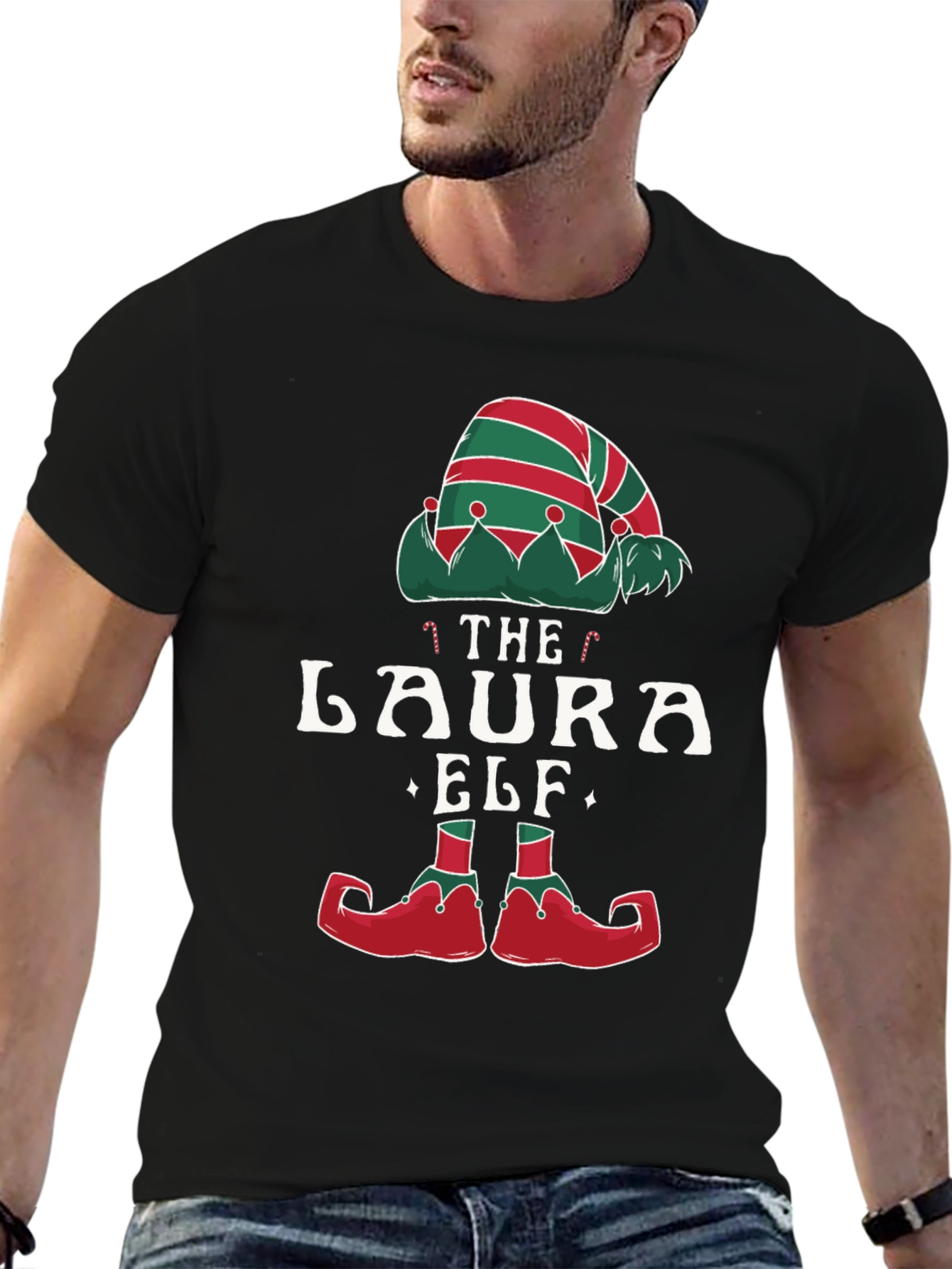 Get ready for the holidays with this fun "The Laura Elf" t-shirt! The black tee features a colorful design including an elf hat with red and green stripes and playful elf shoes. Made from comfortable material, this shirt is perfect for family gatherings, Christmas parties, or just spreading holiday cheer. Stand out this Christmas season. Makes a great gift for the Laura in your life!