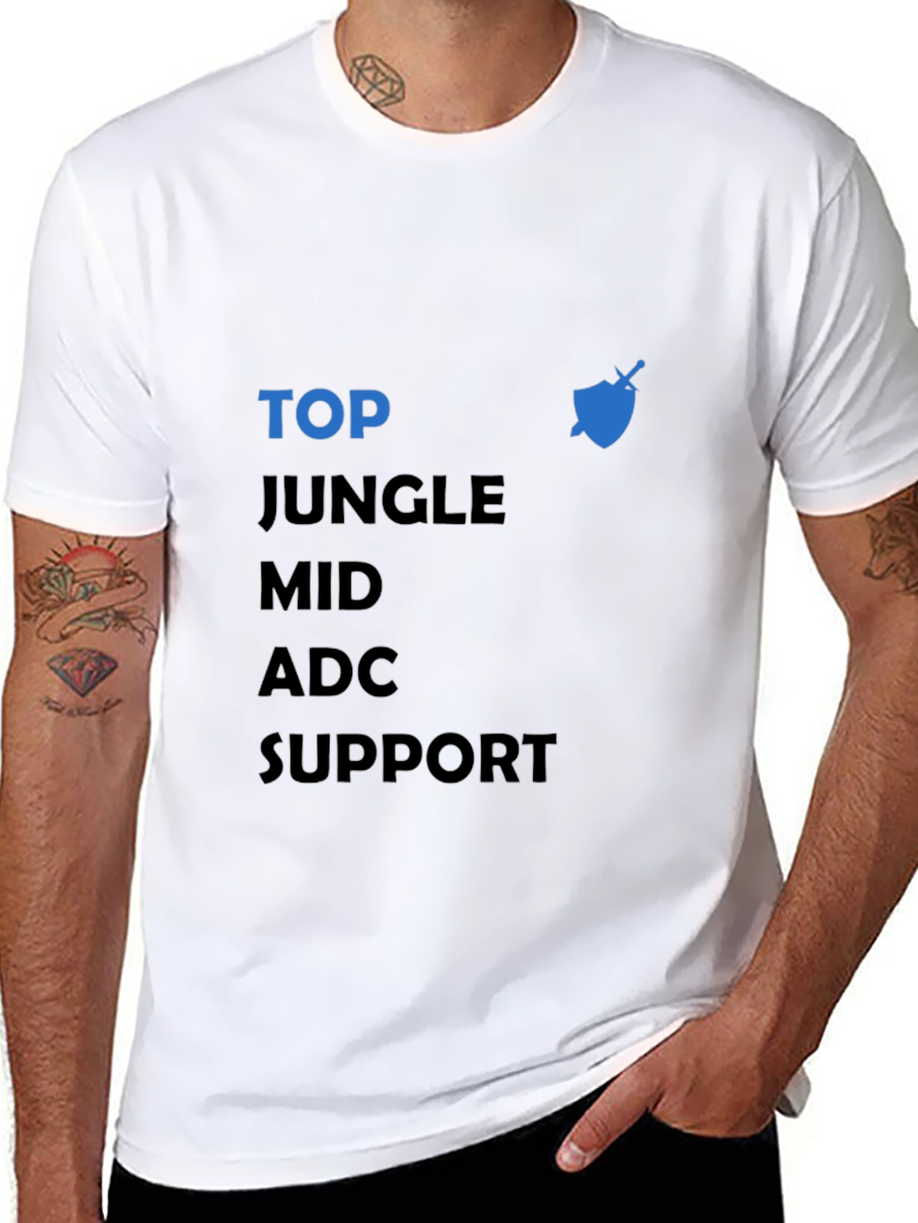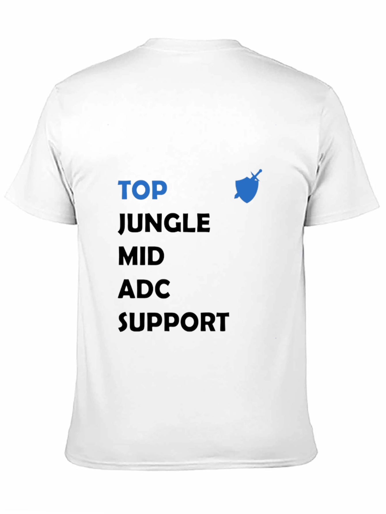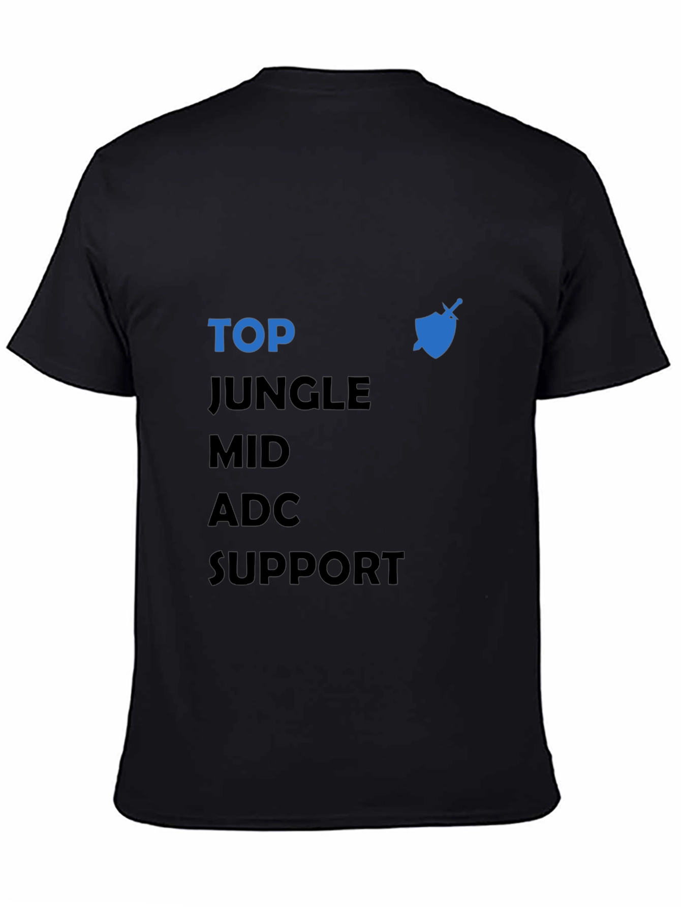 Show off your love for League of Legends with this stylish black t-shirt! Featuring a bold design listing the game's core roles: Top, Jungle, Mid, ADC, and Support. A blue shield and sword image sits above the text. Made from a comfortable fabric, this shirt is perfect for casual wear, gaming events, or streaming sessions. Express your passion for League of Legends with this trendy and comfortable t-shirt!