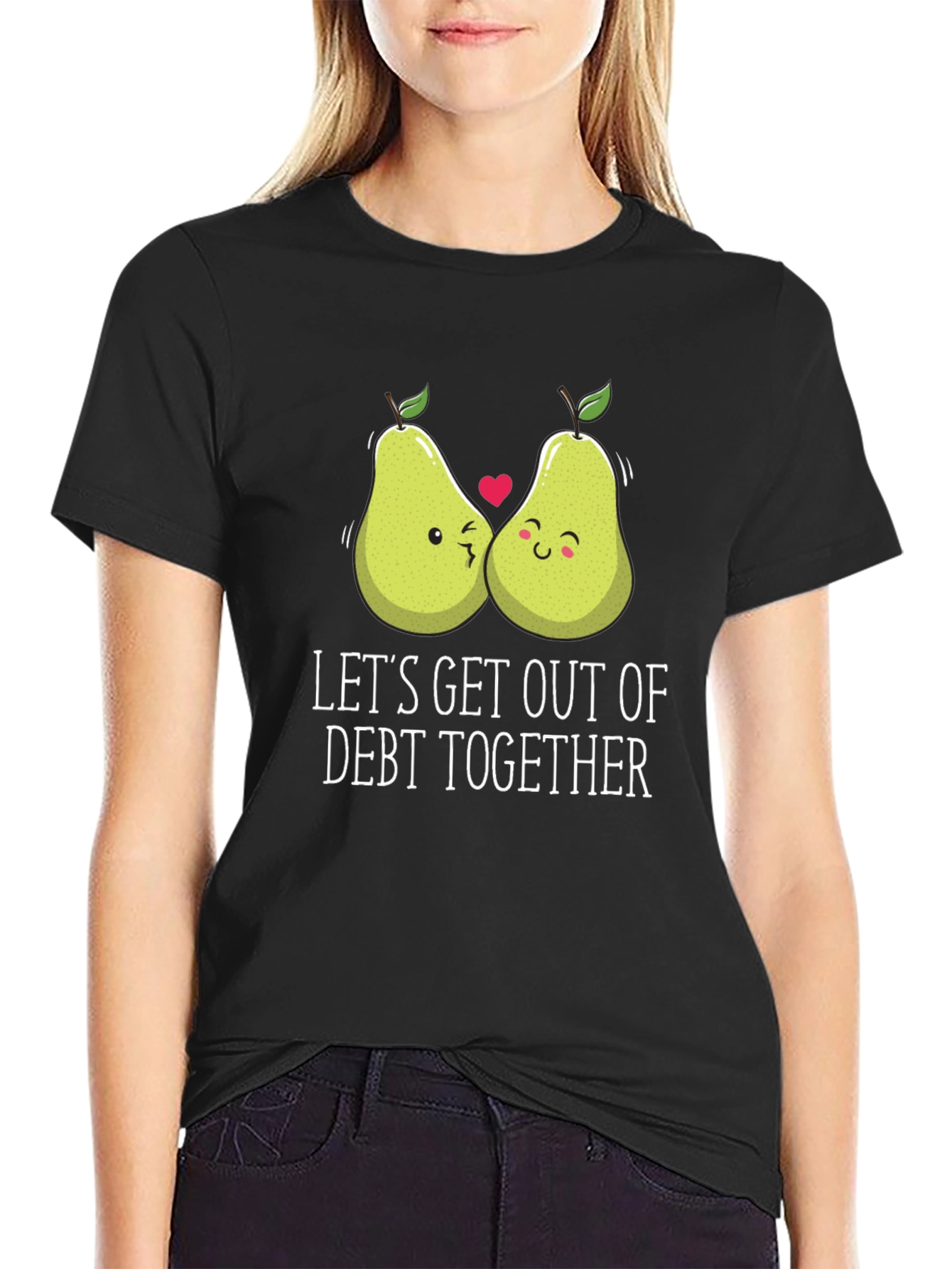 Show your commitment to financial freedom with this adorable black T-shirt! Featuring two cartoon pears in love, with the message 'LET'S GET OUT OF DEBT TOGETHER' printed in a crisp white font. This tee is perfect for couples or individuals who are tackling debt and want to show their solidarity. The soft fabric and classic fit make it a comfortable choice for everyday wear, while the playful design adds a touch of humor to a serious topic. Wear it to your next financial planning meeting, on a date night, or while you're working on your budget. Spread positivity while working towards your financial goals!