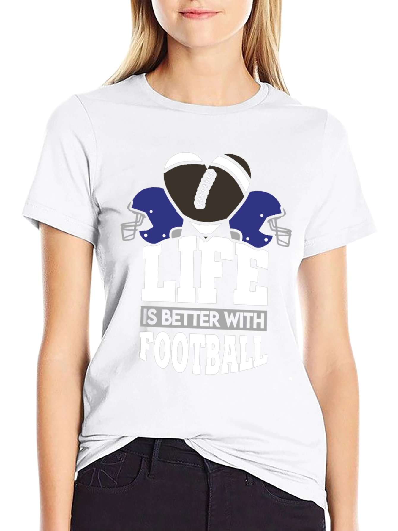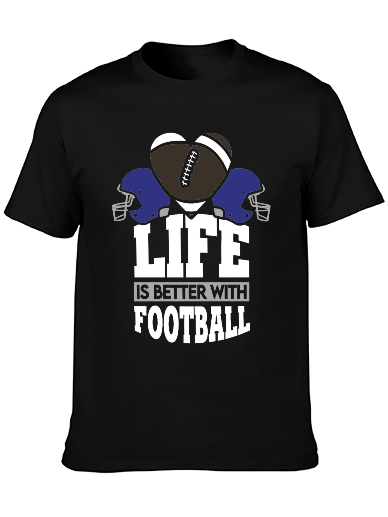 Show your love for football with this stylish and comfortable graphic tee! This black t-shirt features a unique design with a football shaped like a heart, football helmets, and the phrase "Life is Better with Football." Made from a soft, breathable fabric, this tee is perfect for game days, workouts, or everyday wear. Its classic fit ensures a relaxed and flattering look. Whether you're a player, coach, or a dedicated fan, this t-shirt is a great way to express your passion for the sport. Get yours today and let everyone know that life is better with football!